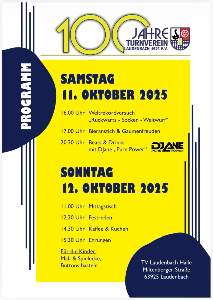 Zu diesem stolzen Jubiläum lädt der TV Laudenbach alle Vereinsmitglieder sowie Freunde und Unterstützer herzlich ein, gemeinsam zu feiern. Das Wochenende vom 11. und 12 Oktober verspricht ein buntes Programm voller Highlights: