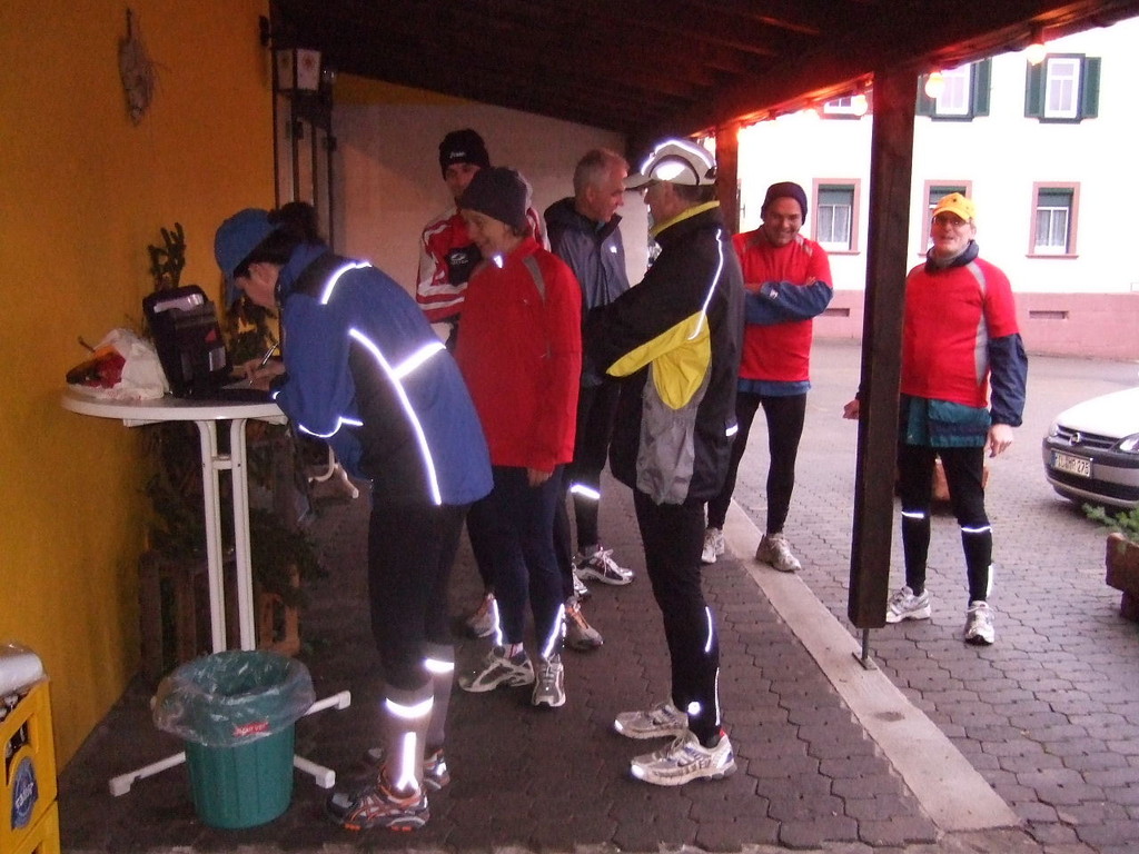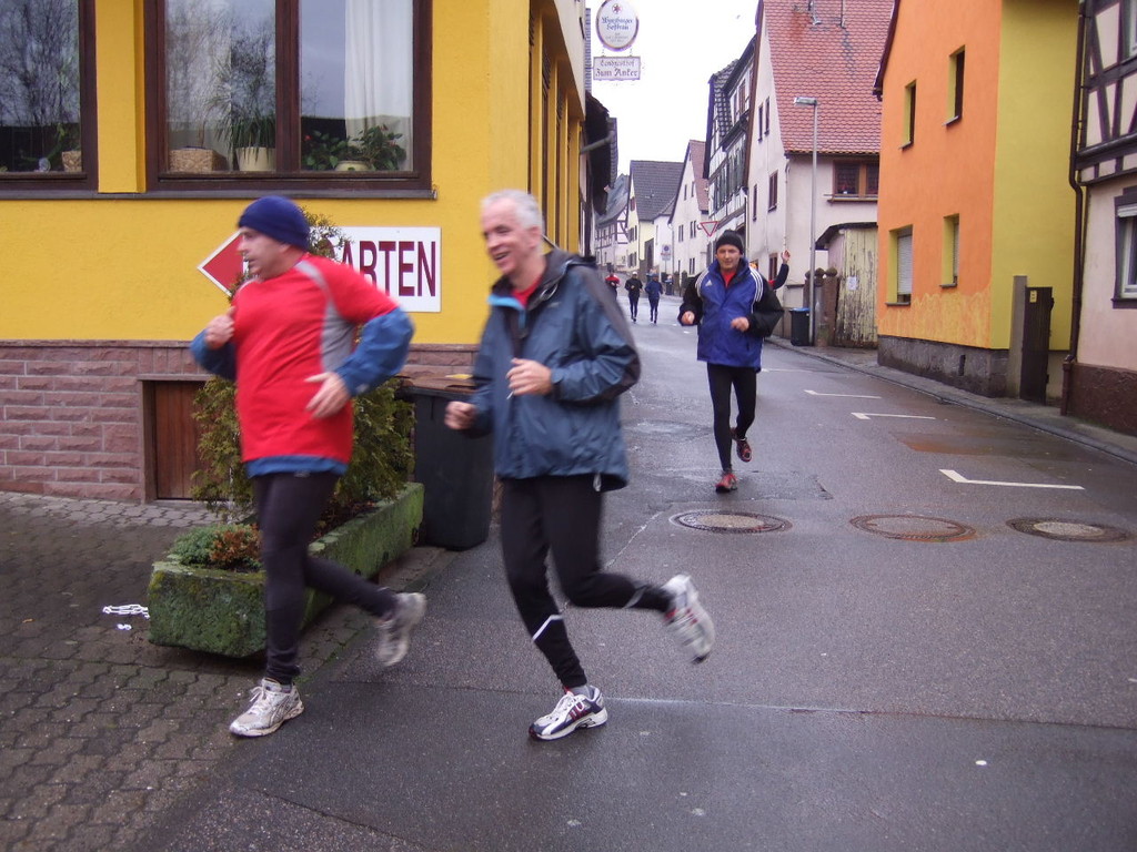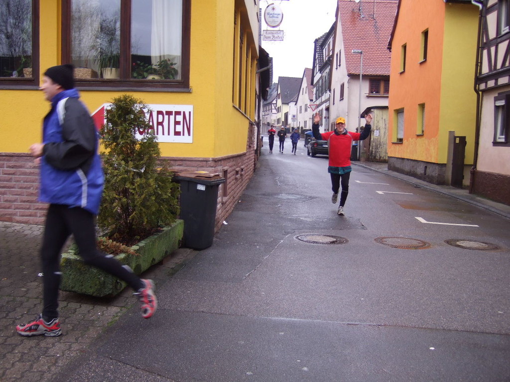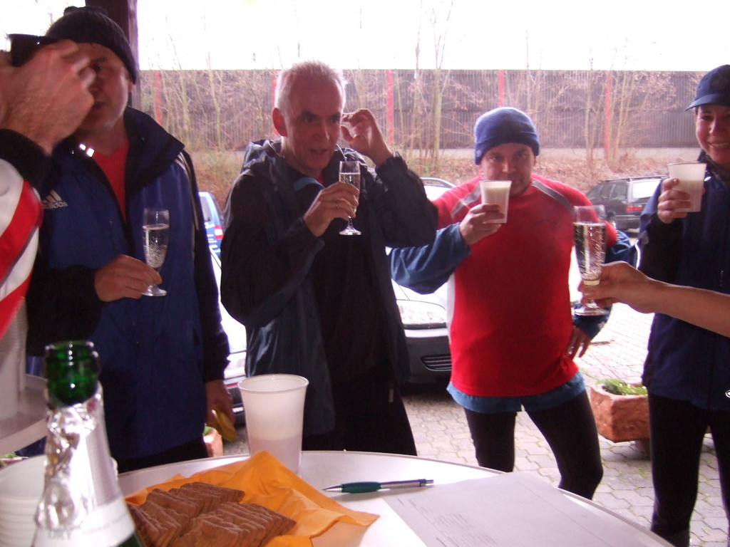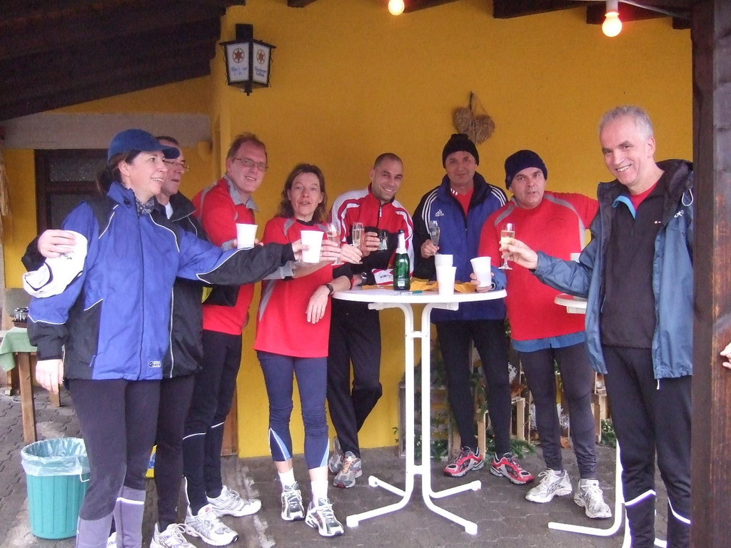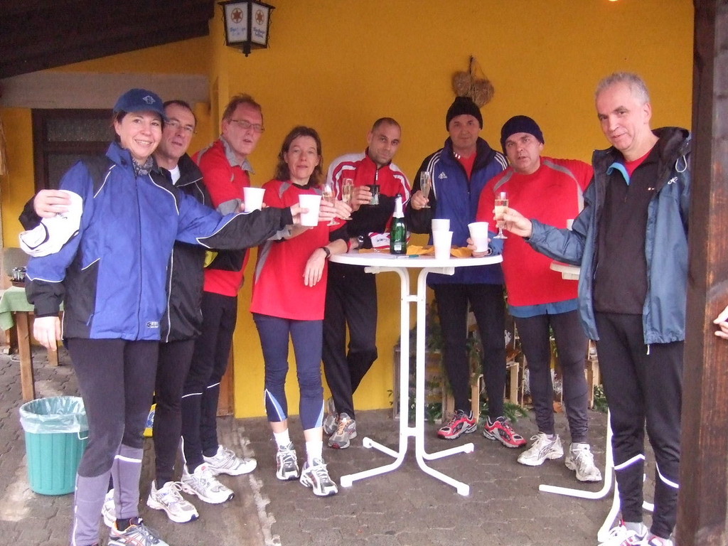 liste gab es kurzes Gedränge, da die Teilnehmerzahl um 100 % gestiegen ist. Auch das Wetter meinte es gut mit den Läufern. Nach morgendlichem Regenguss bis kurz vor Beginn blieb es die ganze Zeit trocken. Um 9:00 Uhr fiel an Elkes Landgasthof der Startschuss. Es ging auf dem Mainradweg nach Kleinheubach und entlang der B 469 auf dem Forstweg wieder zurück nach Laudenbach. Durch den überaus pünktlichen Start - oder den schnellen Lauf - war noch nicht mal die Verschnaufpause in Kleinheubach an der Bahnschranke auszunutzen. Die Läufer/Innen waren zu früh - naja, vielleicht hatte auch der Zug Verspätung. Nach 37 Minuten kamen alle wieder bei Elkes Landgasthof an und wurden dort von der 2. Vorsitzenden Beate Picard mit Glühwein, Hefeweizen (isotonisch), Sekt, Bananen und Spekulatius erwartet. Für den Glühwein war es ja fast ein bischen zu warm, aber jede/r hat doch ein Getränk gefunden, um auf das neue Jahr anzustoßen. Alles in allem eine gelungene Veranstaltung, die mit Sicherheit fortgesetzt wird.