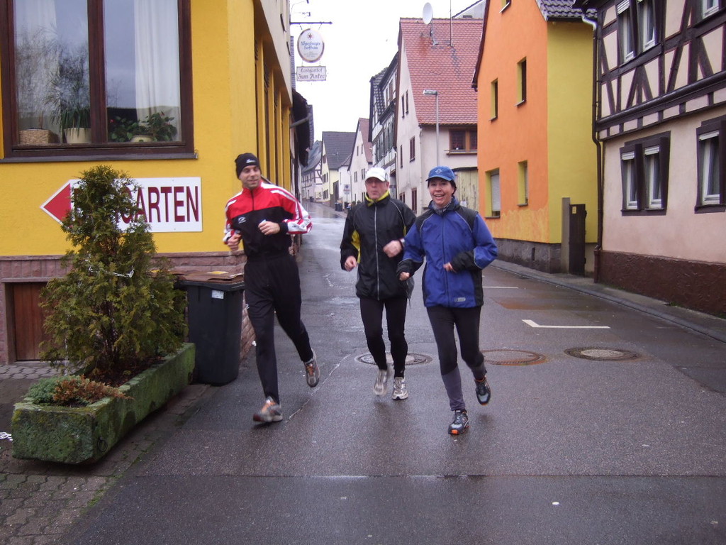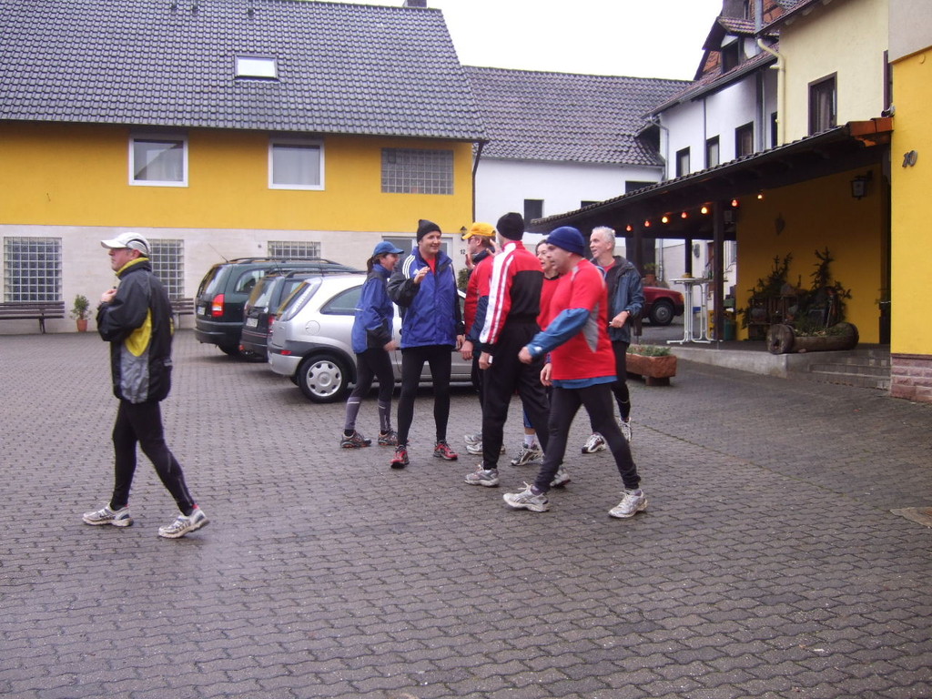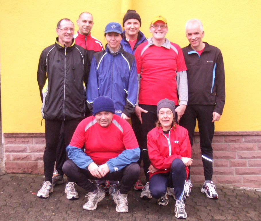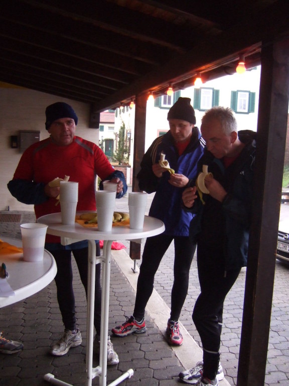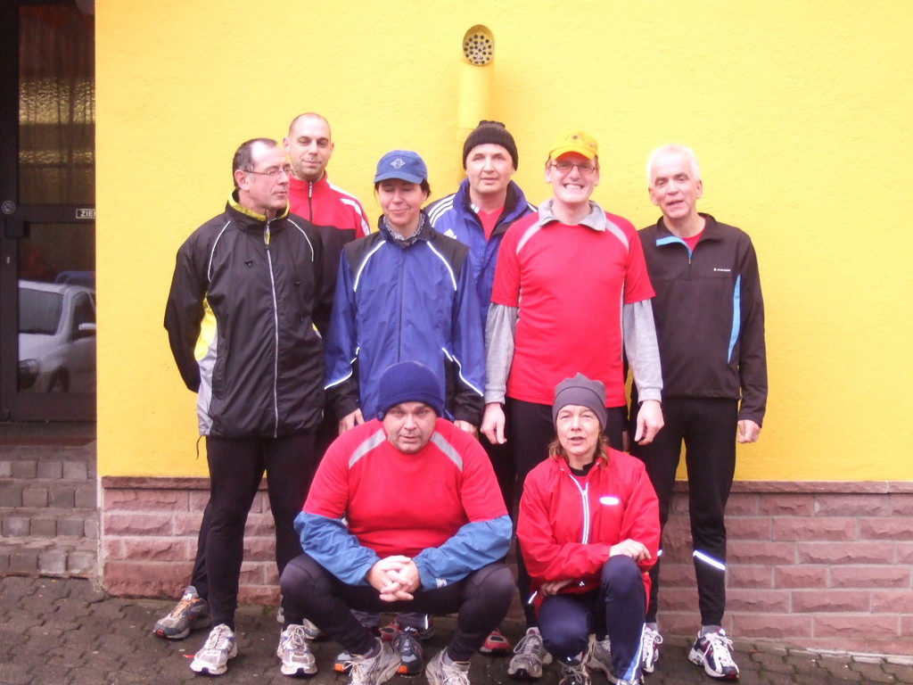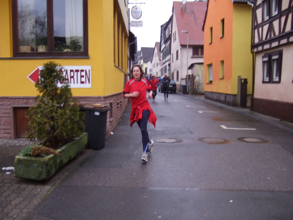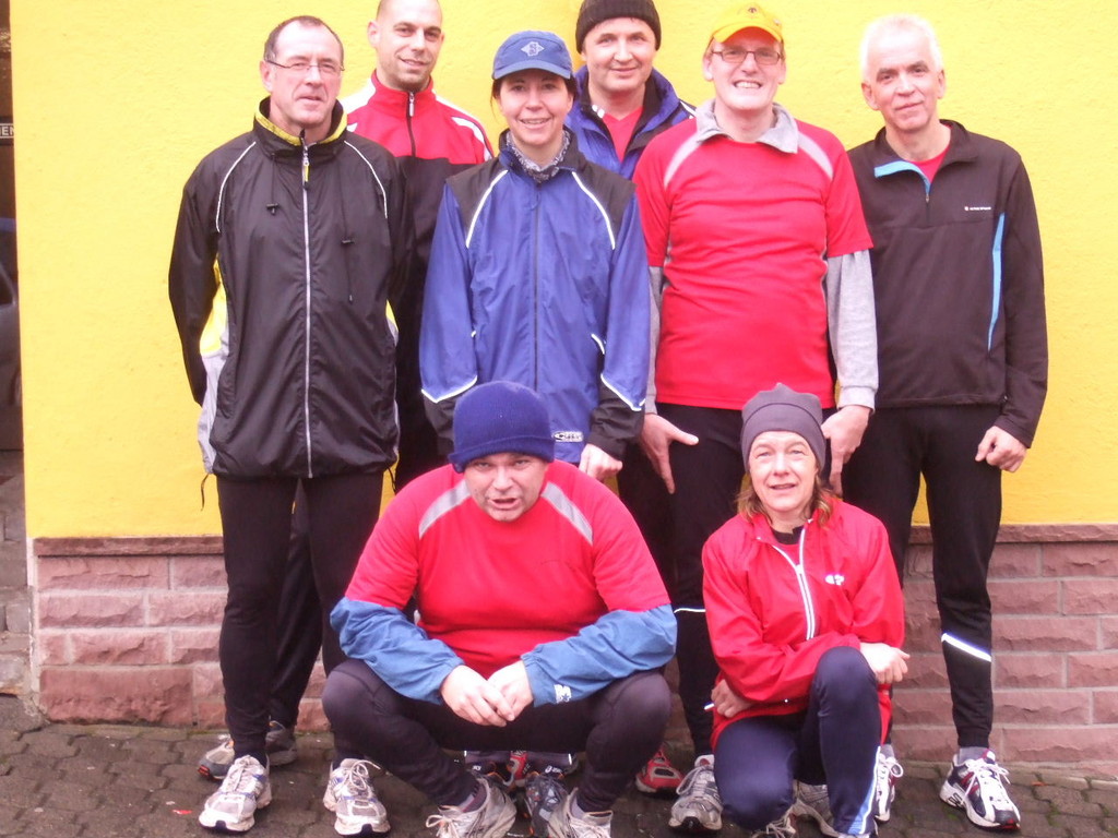 liste gab es kurzes Gedränge, da die Teilnehmerzahl um 100 % gestiegen ist. Auch das Wetter meinte es gut mit den Läufern. Nach morgendlichem Regenguss bis kurz vor Beginn blieb es die ganze Zeit trocken. Um 9:00 Uhr fiel an Elkes Landgasthof der Startschuss. Es ging auf dem Mainradweg nach Kleinheubach und entlang der B 469 auf dem Forstweg wieder zurück nach Laudenbach. Durch den überaus pünktlichen Start - oder den schnellen Lauf - war noch nicht mal die Verschnaufpause in Kleinheubach an der Bahnschranke auszunutzen. Die Läufer/Innen waren zu früh - naja, vielleicht hatte auch der Zug Verspätung. Nach 37 Minuten kamen alle wieder bei Elkes Landgasthof an und wurden dort von der 2. Vorsitzenden Beate Picard mit Glühwein, Hefeweizen (isotonisch), Sekt, Bananen und Spekulatius erwartet. Für den Glühwein war es ja fast ein bischen zu warm, aber jede/r hat doch ein Getränk gefunden, um auf das neue Jahr anzustoßen. Alles in allem eine gelungene Veranstaltung, die mit Sicherheit fortgesetzt wird.