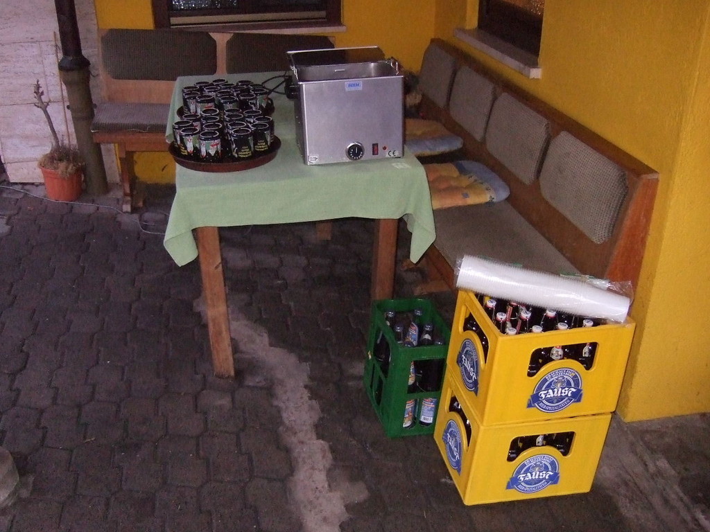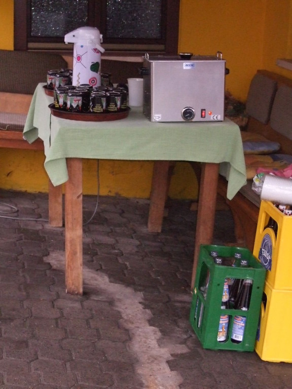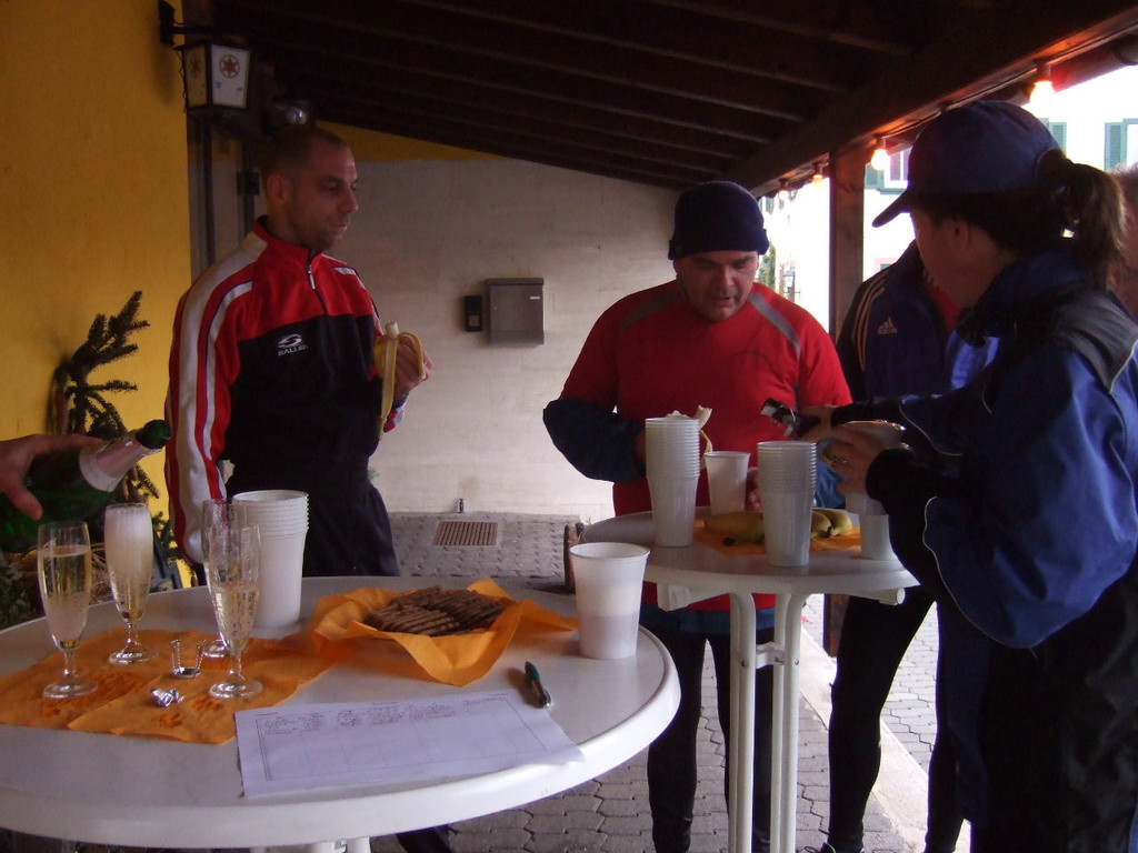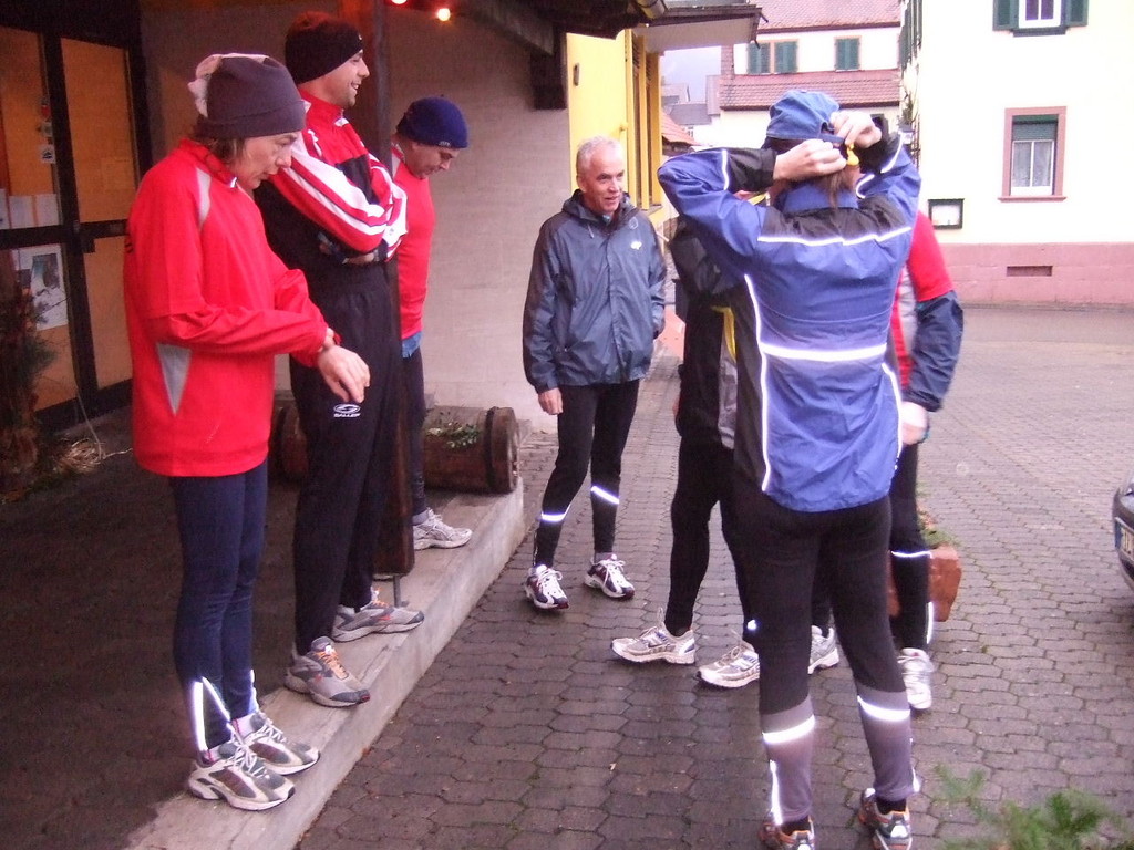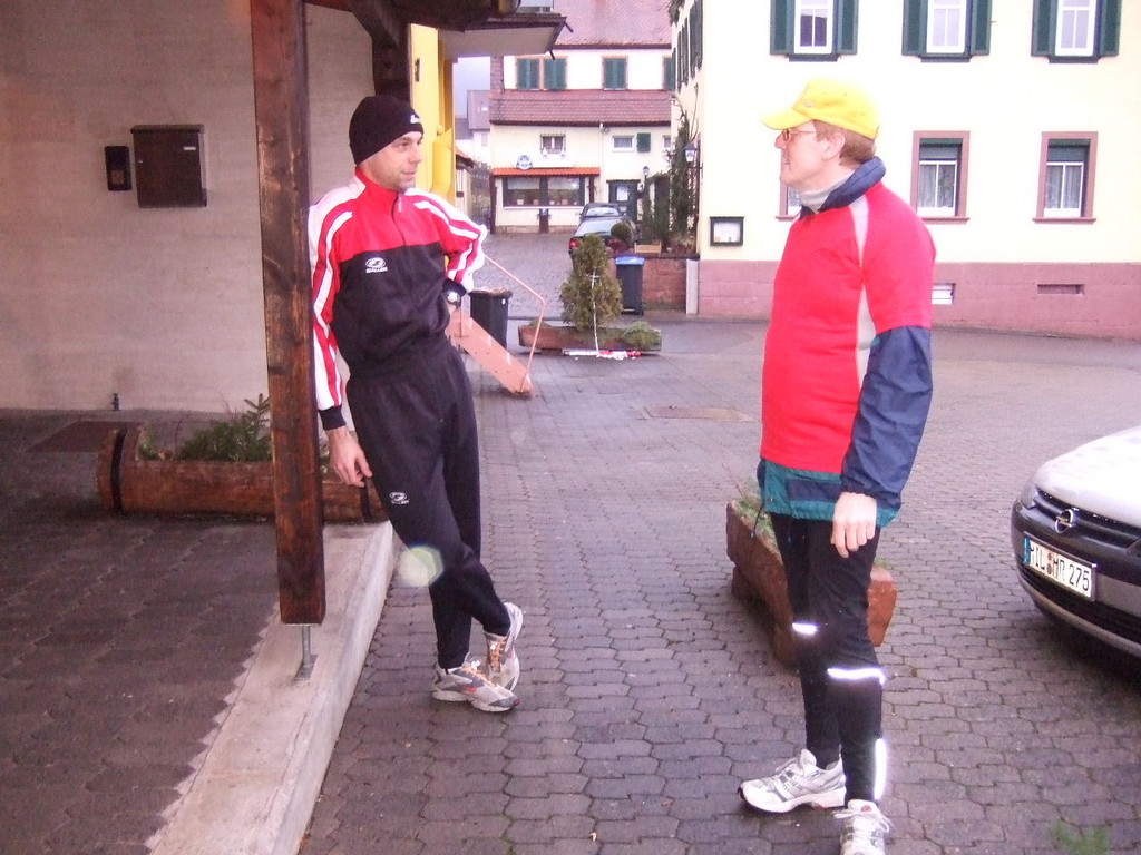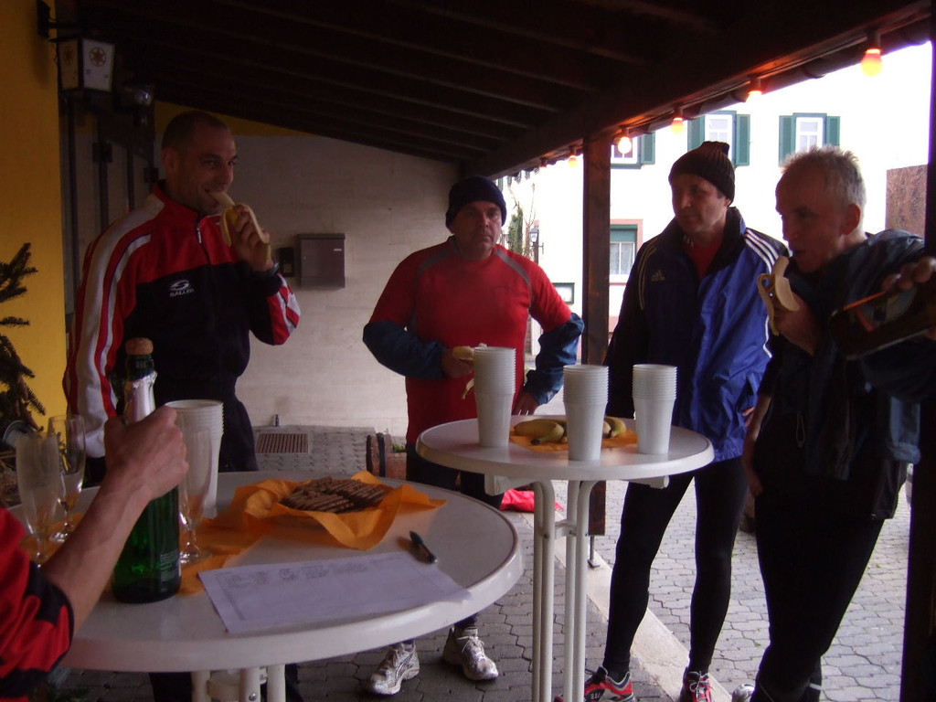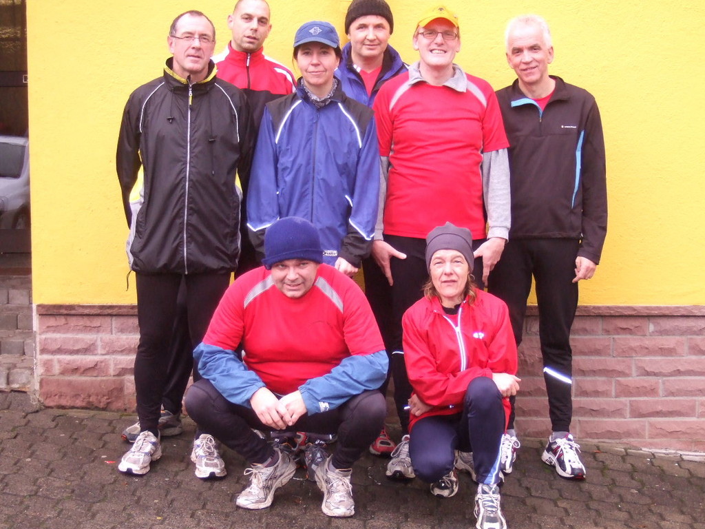 liste gab es kurzes Gedränge, da die Teilnehmerzahl um 100 % gestiegen ist. Auch das Wetter meinte es gut mit den Läufern. Nach morgendlichem Regenguss bis kurz vor Beginn blieb es die ganze Zeit trocken. Um 9:00 Uhr fiel an Elkes Landgasthof der Startschuss. Es ging auf dem Mainradweg nach Kleinheubach und entlang der B 469 auf dem Forstweg wieder zurück nach Laudenbach. Durch den überaus pünktlichen Start - oder den schnellen Lauf - war noch nicht mal die Verschnaufpause in Kleinheubach an der Bahnschranke auszunutzen. Die Läufer/Innen waren zu früh - naja, vielleicht hatte auch der Zug Verspätung. Nach 37 Minuten kamen alle wieder bei Elkes Landgasthof an und wurden dort von der 2. Vorsitzenden Beate Picard mit Glühwein, Hefeweizen (isotonisch), Sekt, Bananen und Spekulatius erwartet. Für den Glühwein war es ja fast ein bischen zu warm, aber jede/r hat doch ein Getränk gefunden, um auf das neue Jahr anzustoßen. Alles in allem eine gelungene Veranstaltung, die mit Sicherheit fortgesetzt wird.