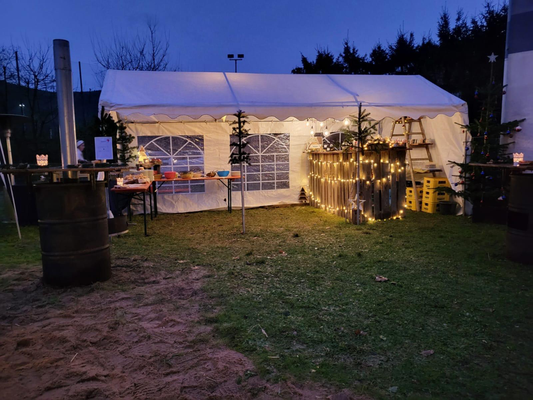 Durch den Aufbau hatte man das Gefühl wirklich auf einem kleinen Weihnachtsmarkt zu sein. Es gab ein Lagerfeuer mit Sitzgelegenheiten darum. Eine extra Bastelecke für die Kinder. Eine rustikale Bar mit einer auf den Winter angepassten Getränkeauswahl.