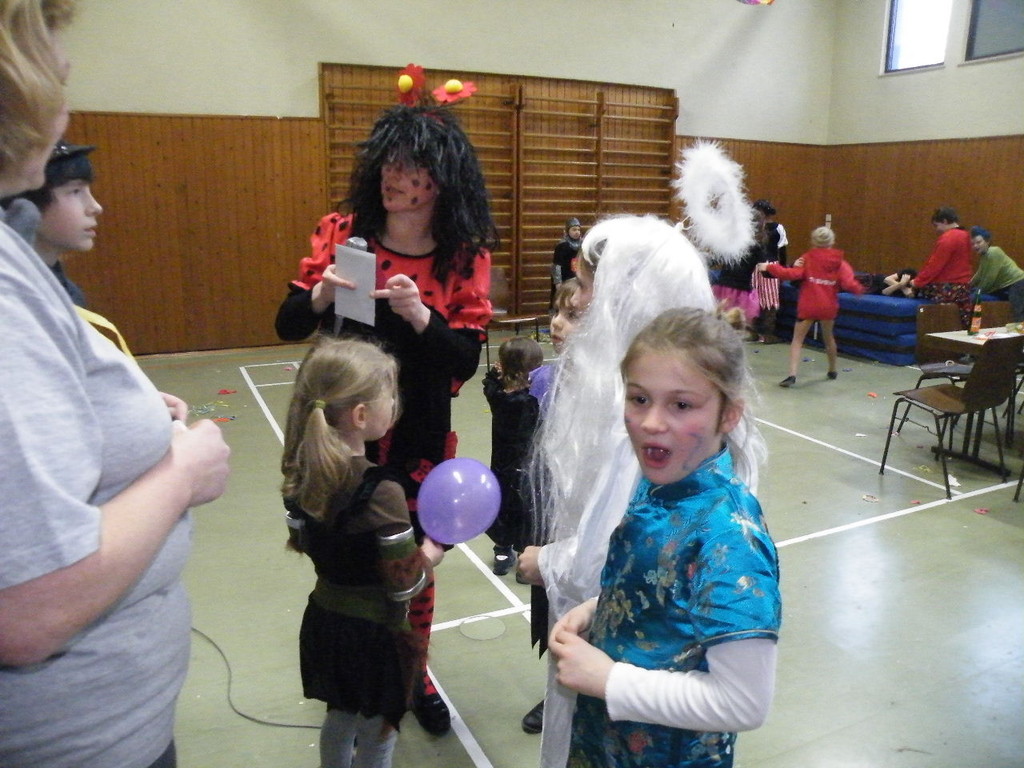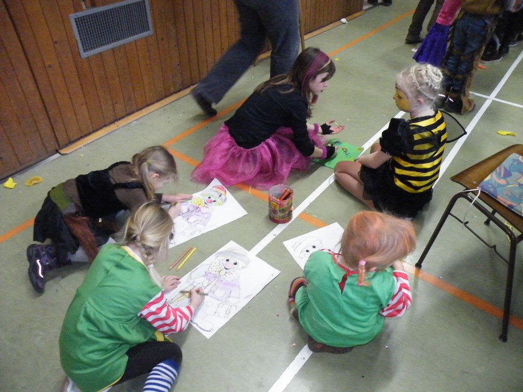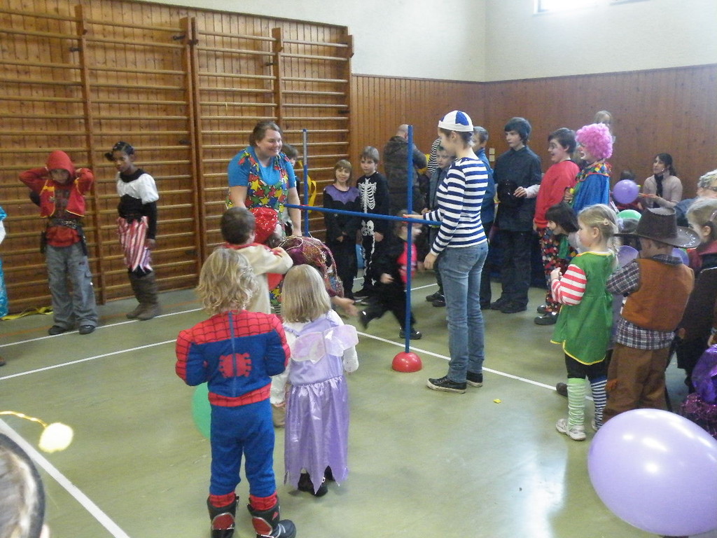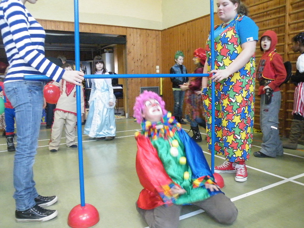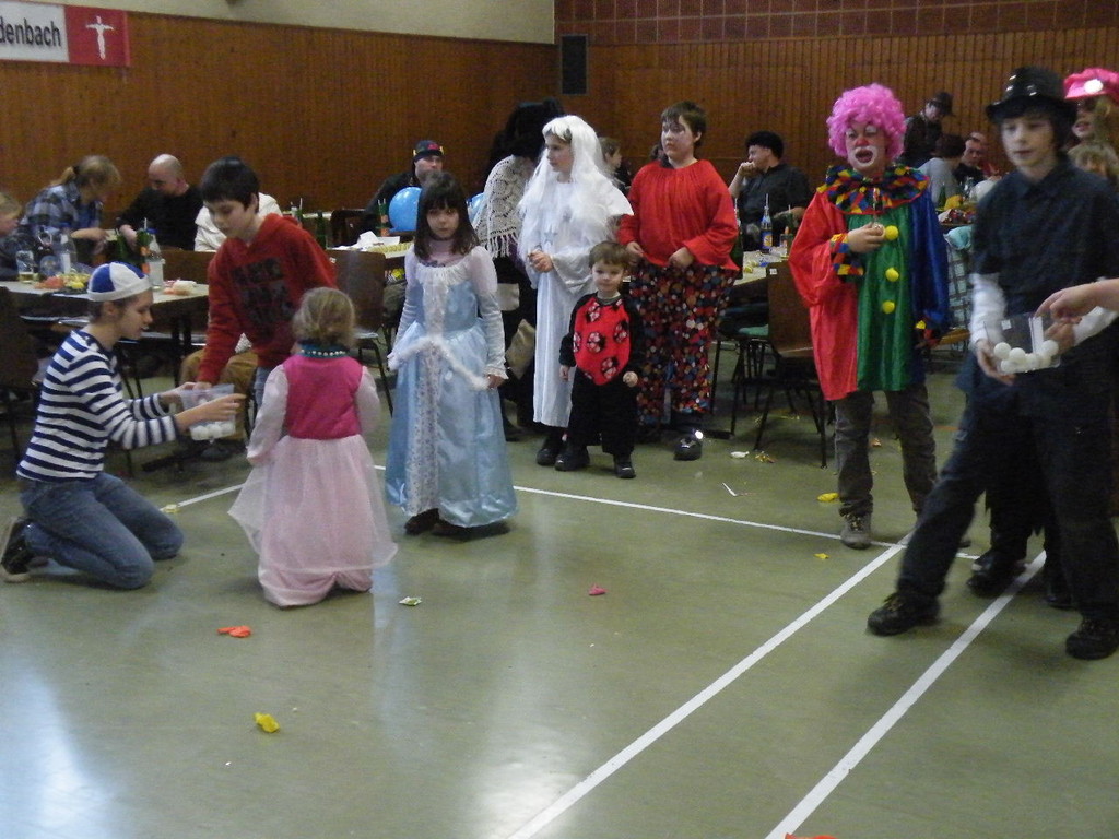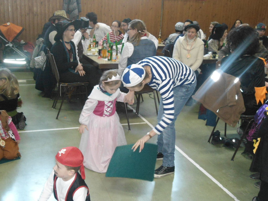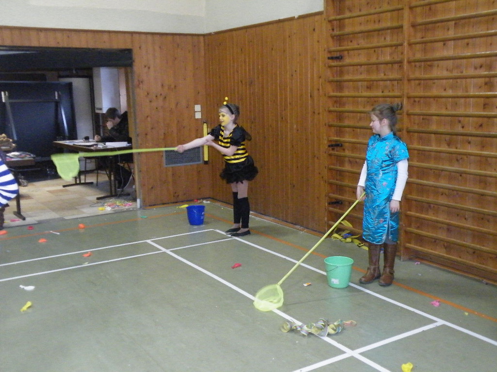 Weiter ging es mit Limbo, einem Wurfspiel und Ausmalen von Bildervorlagen. Wie immer musste auch wieder geschätzt werden. Dieses Jahr die Anzahl von Knöpfen in einem Einmachglas. Die Spanne der abgegebenen Tipps war sehr groß und reichte von ca. 50 bis über 200 Stück. Richtig waren dann 161 Knöpfe, die von der 2. Vorsitzenden Beate Picard mit Hilfe der verbliebenen Kinder ausgezählt wurden. Nach der Vergabe der Preise (1. Platz Tim Krause, 2. Platz Emelie Dudenhöffer, 3. Platz Klara Eschenbach und Yannick Frieß) löste sich die Gesellschaft sehr schnell auf und die fleißigen Helfer konnten mit dem Aufräumen der Halle beginnen. Den Ausklang fand der Kinderfasching im On's.