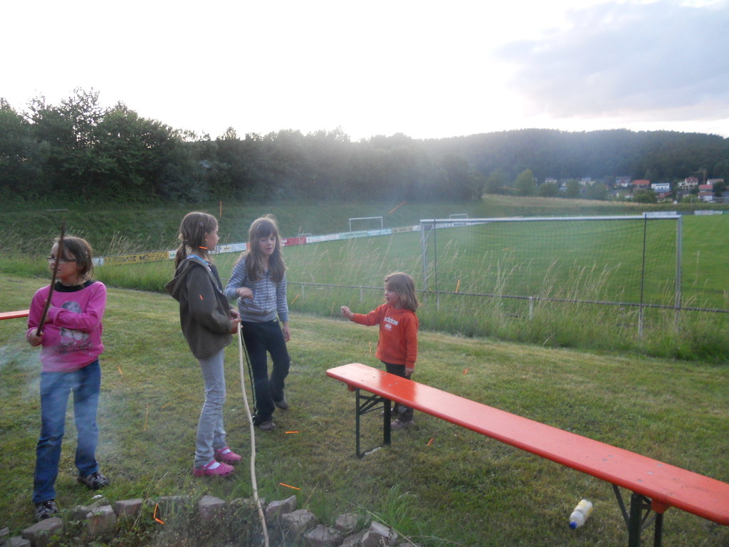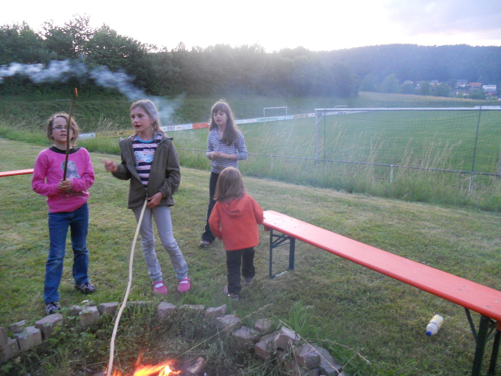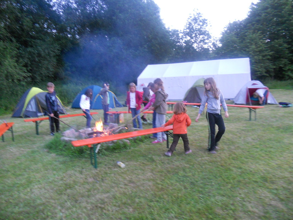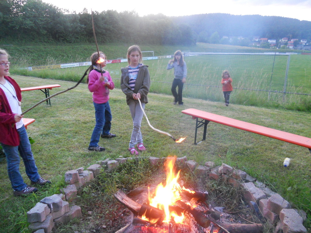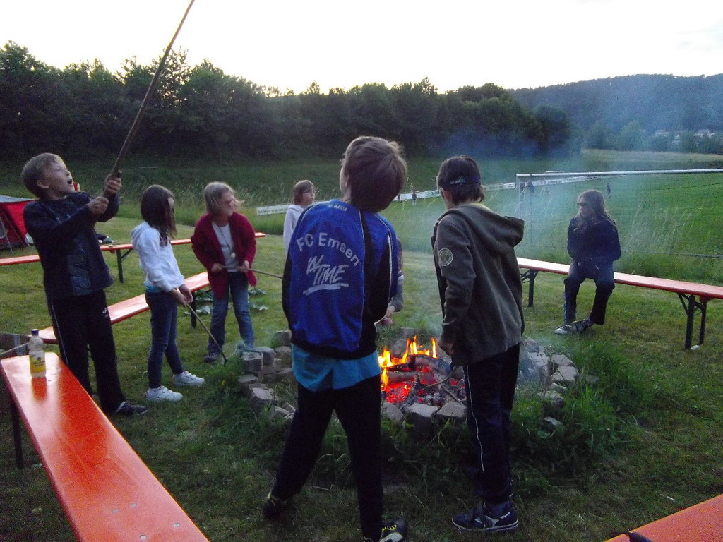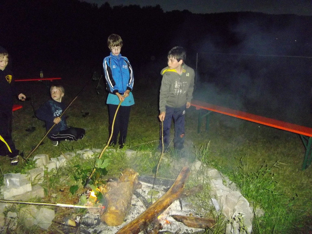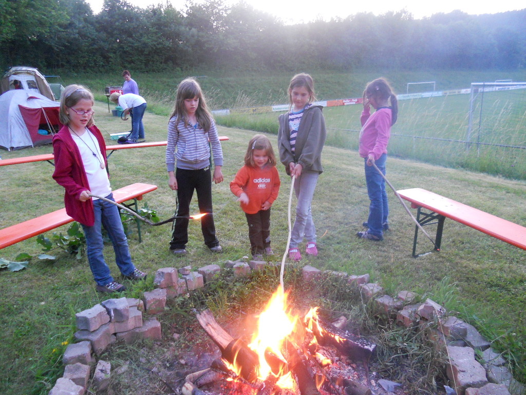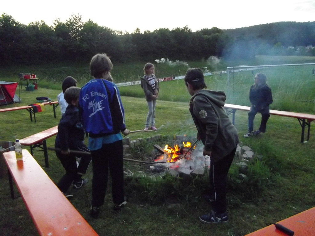 Ab 15:00 Uhr trafen 31 Kinder auf dem Gelände des Fußballvereins ein. Zuerst einmal galt es, die Zelte aufzubauen. Die Kinder wurden dabei natürlich tatkräftig von ihren Eltern unterstützt. Anschließend konnten die Kinder auf dem Gelände nach Lust und Laune toben. Nach dem Anzünden des Lagerfeuers wurden Stöcke und Zweige für das Stockbrot gesammelt und zugespitzt. Die freiwilligen Helfer bereiteten während dessen das Abendessen vor: Mit Bratwurst und Brötchen konnten sich alle wieder etwas stärken, bevor der Teig für das Stockbrot geknetet werden musste. Danach ging es natürlich ans Stockbrot rösten. Ab 20:45 Uhr saßen die Fußballfans unter den Kindern und Betreuern natürlich vor dem Fernseher im Sportheim und schauten das Spiel Deutschland-Griechenland. Die weniger Fußballbegeisterten unternahmen zeitgleich eine Nachtwanderung durch den Wald. Nach dem Spiel und der Nachtwanderung gab es bis zur Nachtruhe Spaß am Lagerfeuer.