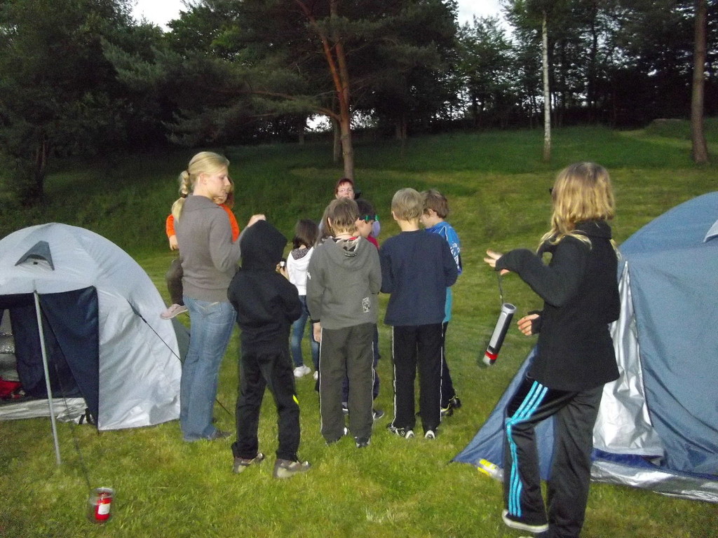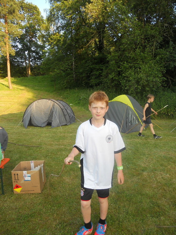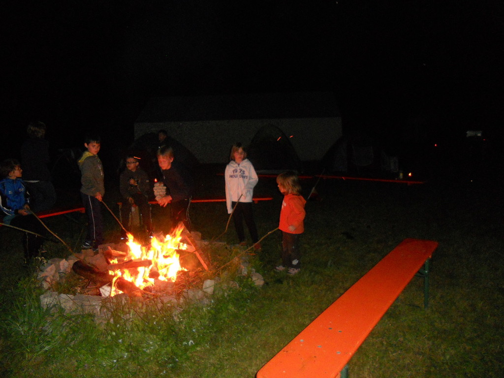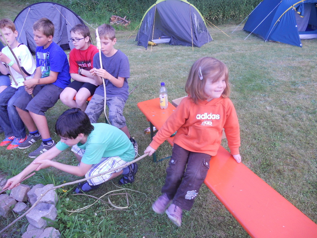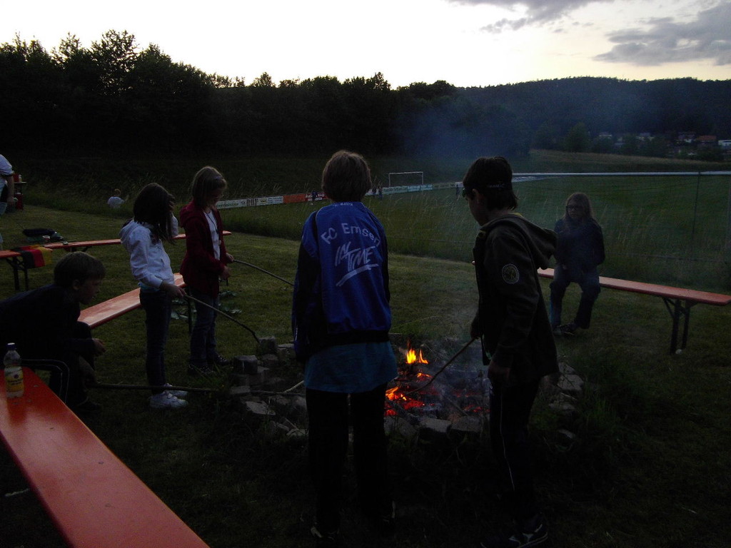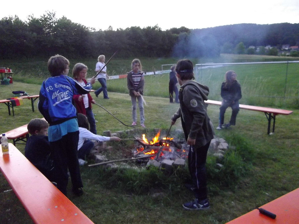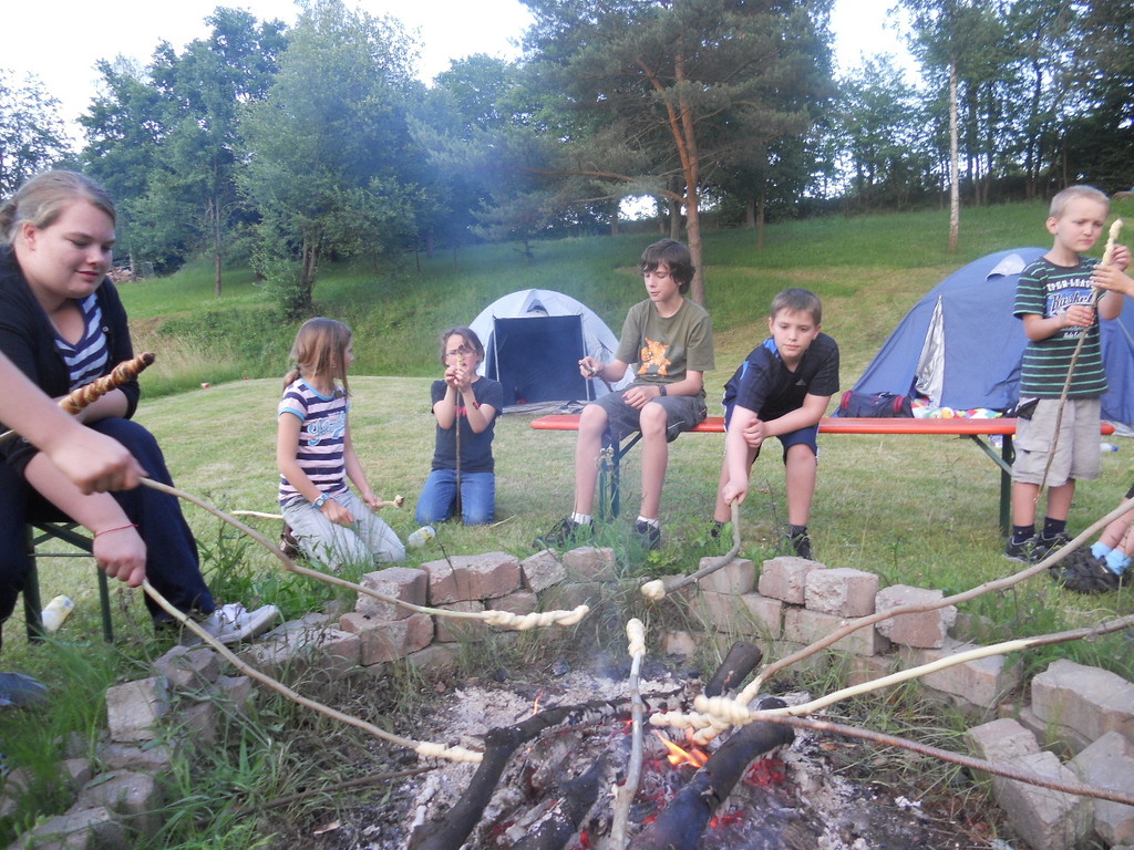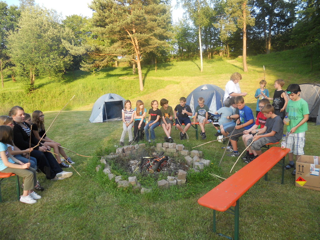 Ab 15:00 Uhr trafen 31 Kinder auf dem Gelände des Fußballvereins ein. Zuerst einmal galt es, die Zelte aufzubauen. Die Kinder wurden dabei natürlich tatkräftig von ihren Eltern unterstützt. Anschließend konnten die Kinder auf dem Gelände nach Lust und Laune toben. Nach dem Anzünden des Lagerfeuers wurden Stöcke und Zweige für das Stockbrot gesammelt und zugespitzt. Die freiwilligen Helfer bereiteten während dessen das Abendessen vor: Mit Bratwurst und Brötchen konnten sich alle wieder etwas stärken, bevor der Teig für das Stockbrot geknetet werden musste. Danach ging es natürlich ans Stockbrot rösten. Ab 20:45 Uhr saßen die Fußballfans unter den Kindern und Betreuern natürlich vor dem Fernseher im Sportheim und schauten das Spiel Deutschland-Griechenland. Die weniger Fußballbegeisterten unternahmen zeitgleich eine Nachtwanderung durch den Wald. Nach dem Spiel und der Nachtwanderung gab es bis zur Nachtruhe Spaß am Lagerfeuer.