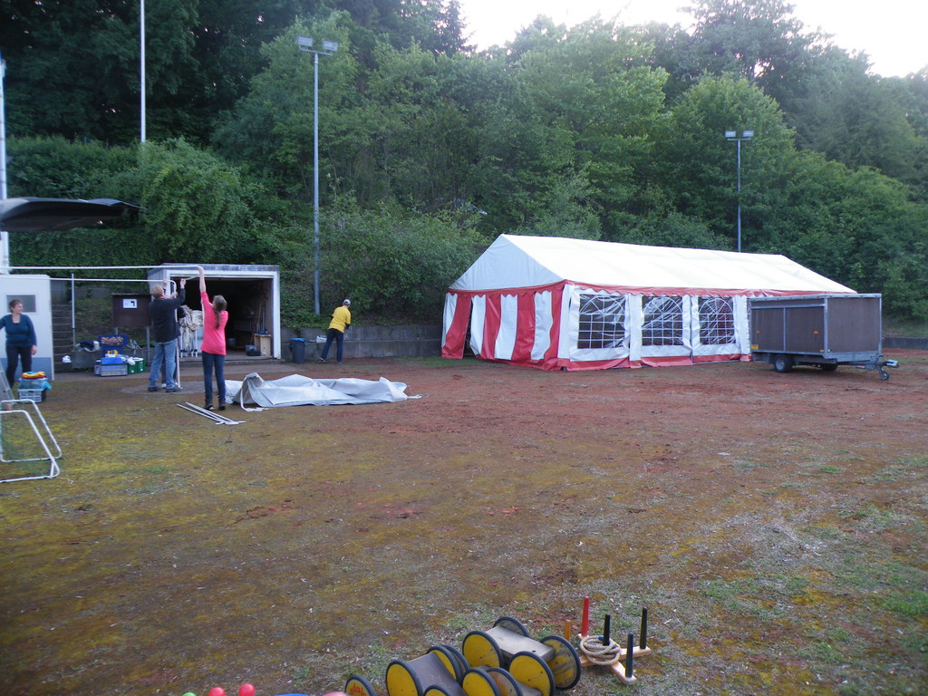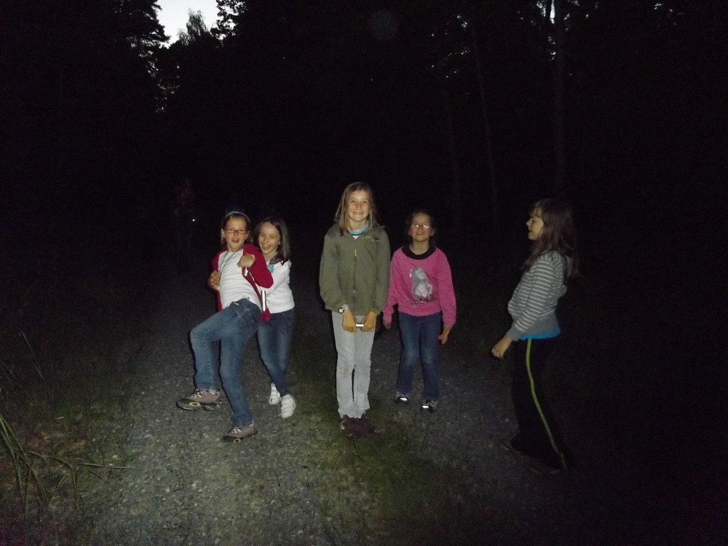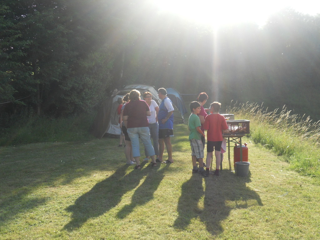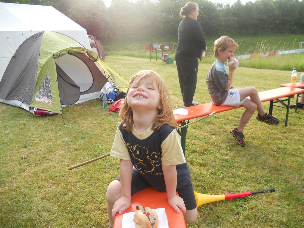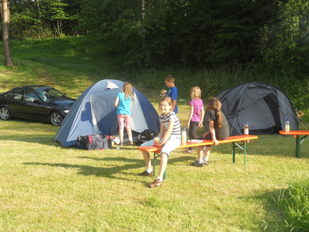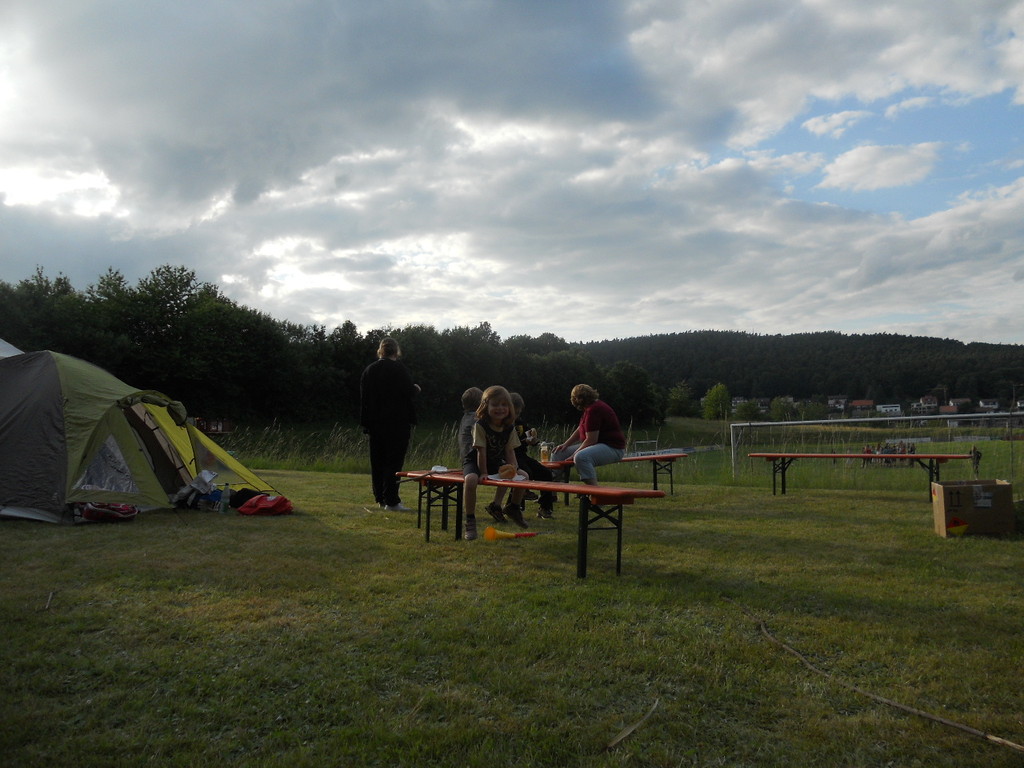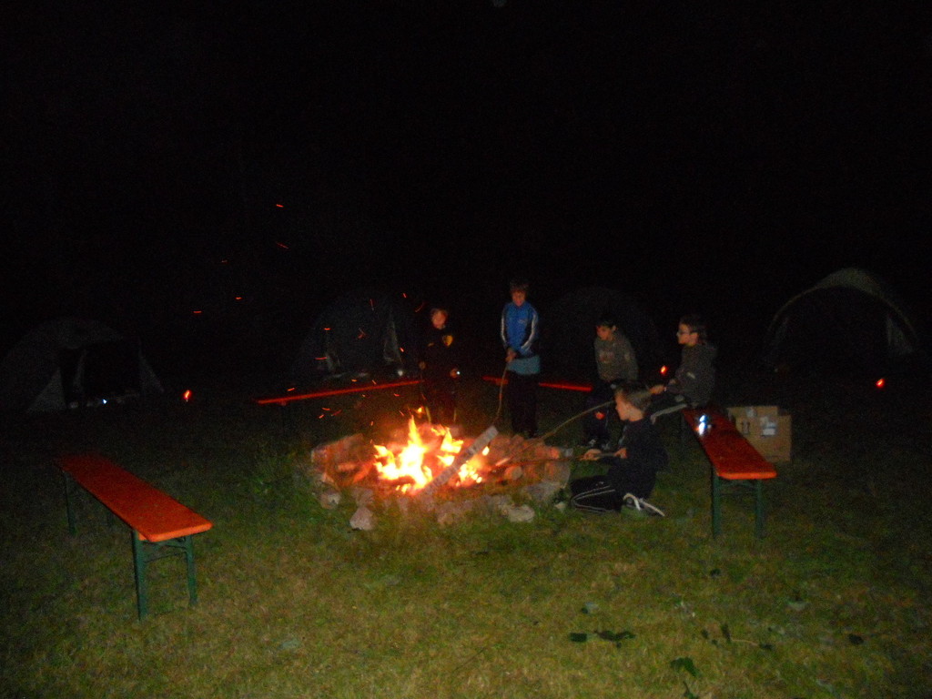 Ab 15:00 Uhr trafen 31 Kinder auf dem Gelände des Fußballvereins ein. Zuerst einmal galt es, die Zelte aufzubauen. Die Kinder wurden dabei natürlich tatkräftig von ihren Eltern unterstützt. Anschließend konnten die Kinder auf dem Gelände nach Lust und Laune toben. Nach dem Anzünden des Lagerfeuers wurden Stöcke und Zweige für das Stockbrot gesammelt und zugespitzt. Die freiwilligen Helfer bereiteten während dessen das Abendessen vor: Mit Bratwurst und Brötchen konnten sich alle wieder etwas stärken, bevor der Teig für das Stockbrot geknetet werden musste. Danach ging es natürlich ans Stockbrot rösten. Ab 20:45 Uhr saßen die Fußballfans unter den Kindern und Betreuern natürlich vor dem Fernseher im Sportheim und schauten das Spiel Deutschland-Griechenland. Die weniger Fußballbegeisterten unternahmen zeitgleich eine Nachtwanderung durch den Wald. Nach dem Spiel und der Nachtwanderung gab es bis zur Nachtruhe Spaß am Lagerfeuer.