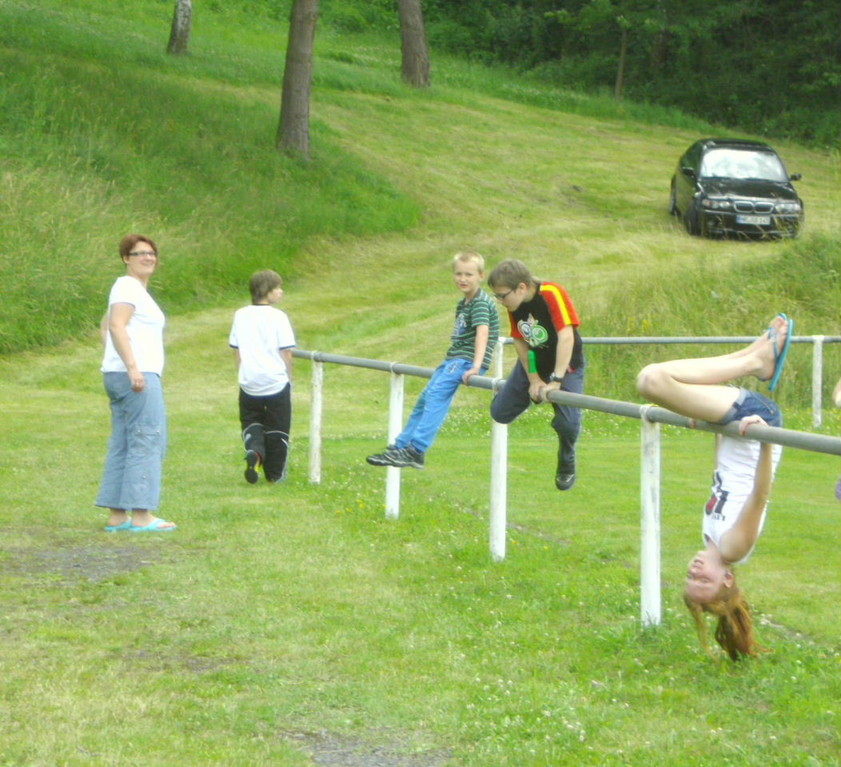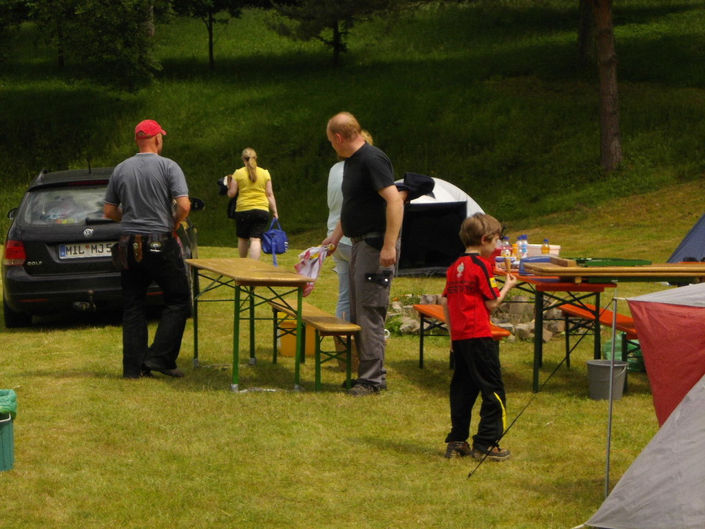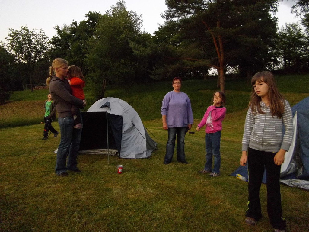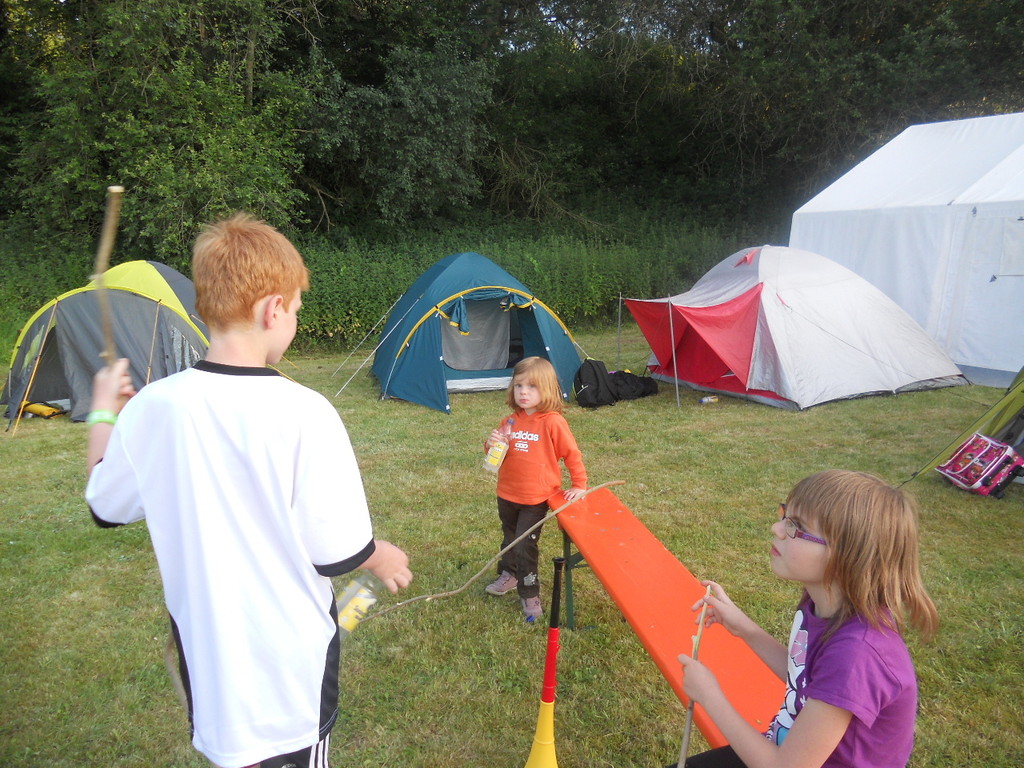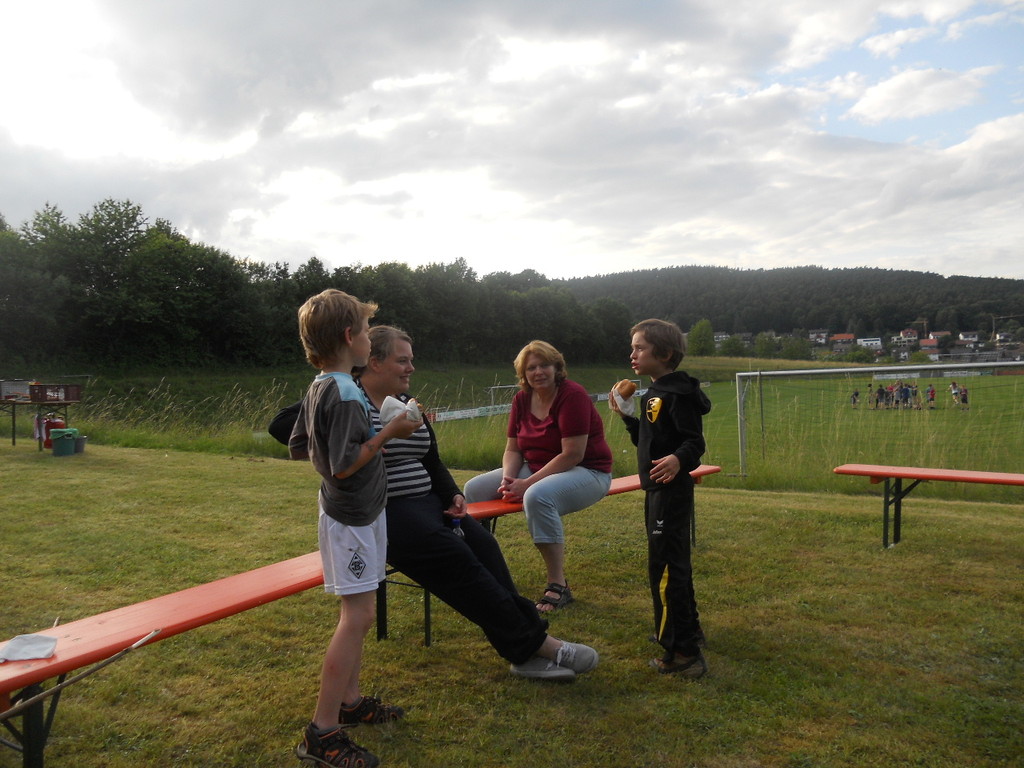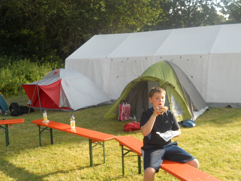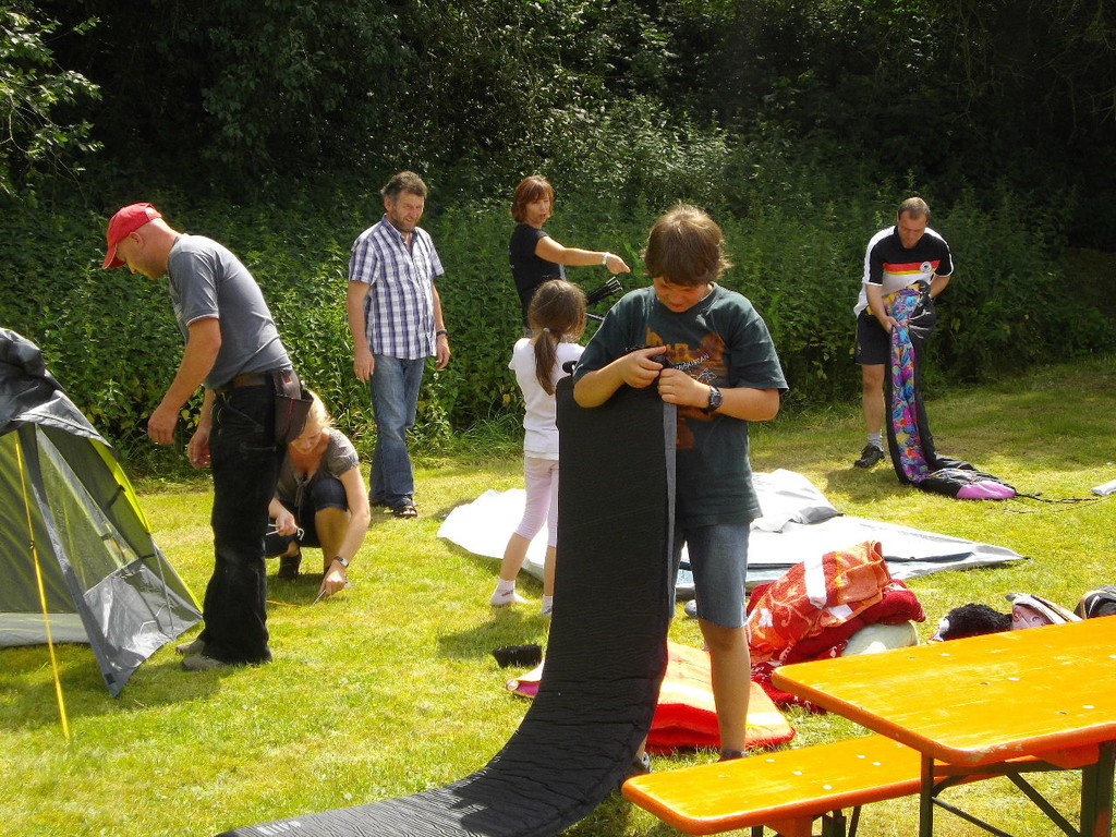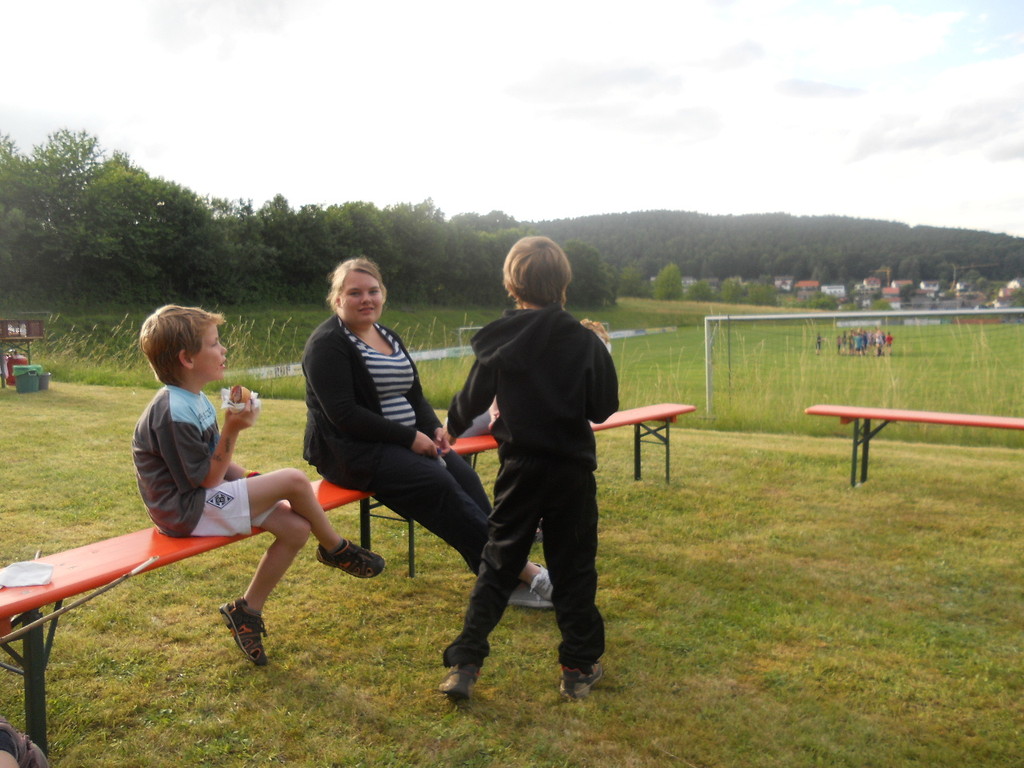 Ab 15:00 Uhr trafen 31 Kinder auf dem Gelände des Fußballvereins ein. Zuerst einmal galt es, die Zelte aufzubauen. Die Kinder wurden dabei natürlich tatkräftig von ihren Eltern unterstützt. Anschließend konnten die Kinder auf dem Gelände nach Lust und Laune toben. Nach dem Anzünden des Lagerfeuers wurden Stöcke und Zweige für das Stockbrot gesammelt und zugespitzt. Die freiwilligen Helfer bereiteten während dessen das Abendessen vor: Mit Bratwurst und Brötchen konnten sich alle wieder etwas stärken, bevor der Teig für das Stockbrot geknetet werden musste. Danach ging es natürlich ans Stockbrot rösten. Ab 20:45 Uhr saßen die Fußballfans unter den Kindern und Betreuern natürlich vor dem Fernseher im Sportheim und schauten das Spiel Deutschland-Griechenland. Die weniger Fußballbegeisterten unternahmen zeitgleich eine Nachtwanderung durch den Wald. Nach dem Spiel und der Nachtwanderung gab es bis zur Nachtruhe Spaß am Lagerfeuer.