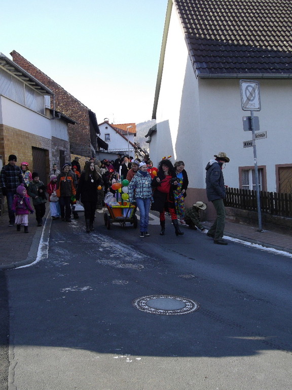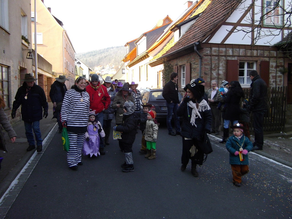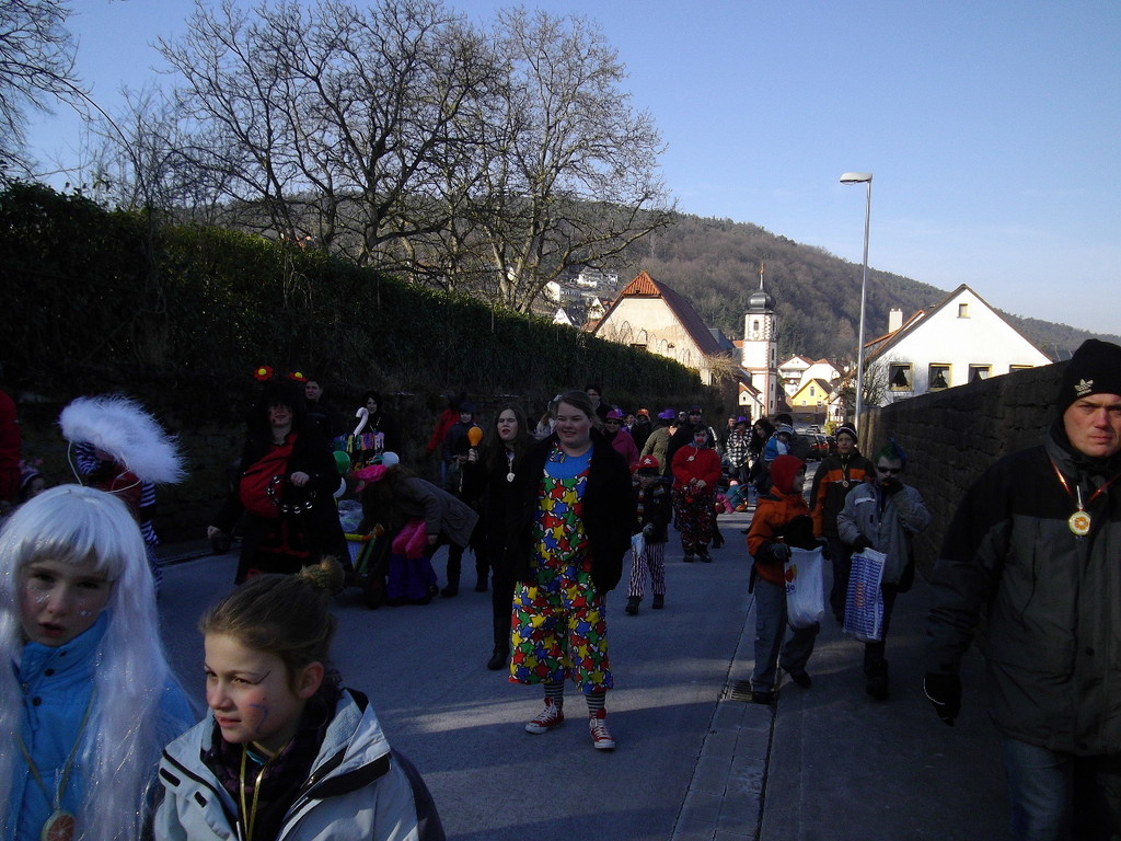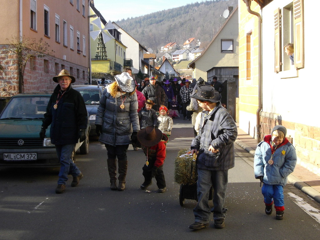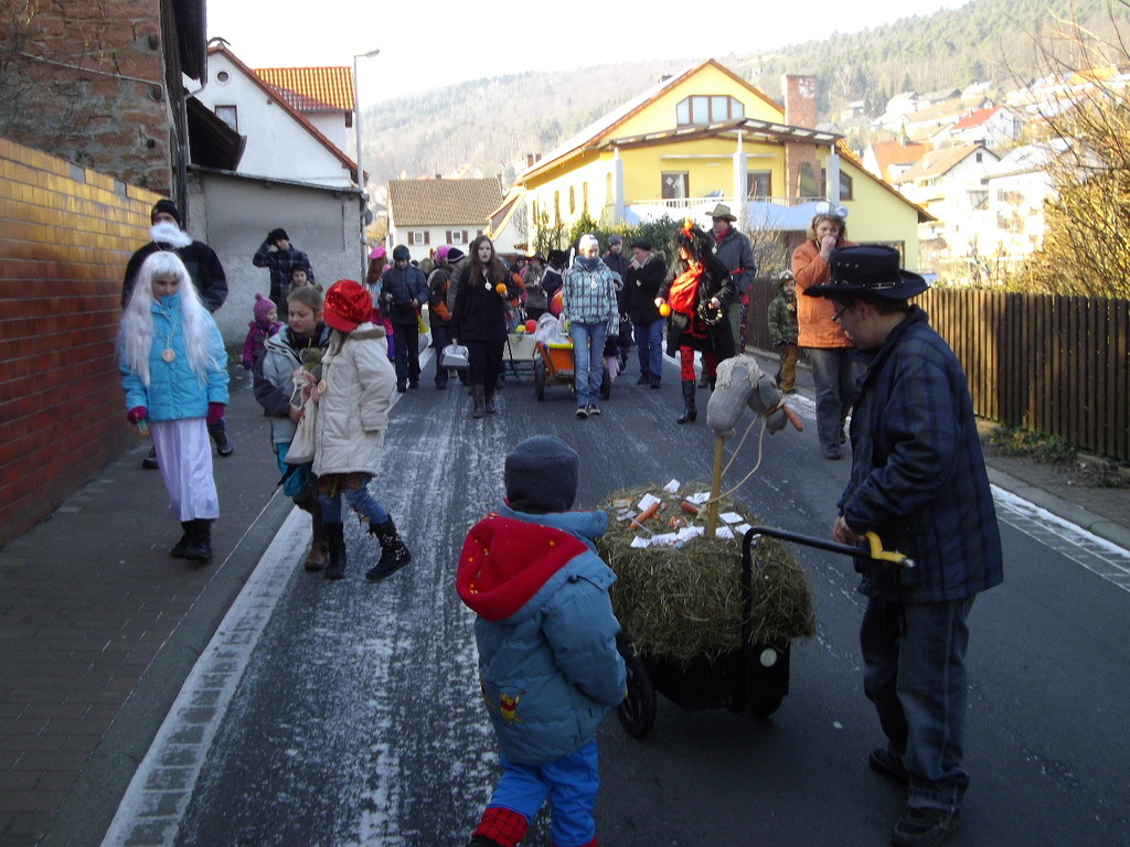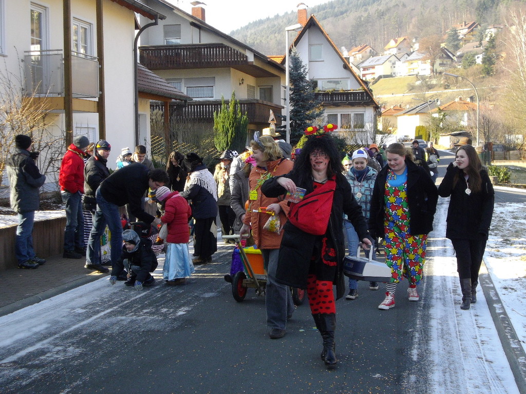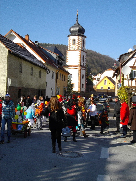 wagen zog der Wurm durch den Mühlweg, Brunnenweg, Bachgasse und Miltenberger Straße zur Turnhalle. Sogar Zaungäste gab es unterwegs, die den Zug mit Helau-Rufen und teilweise auch Bonbons unterstützten. Besonders am Dorfbrunnen und am Gasthof Engel drängten sich die Zuschauer.