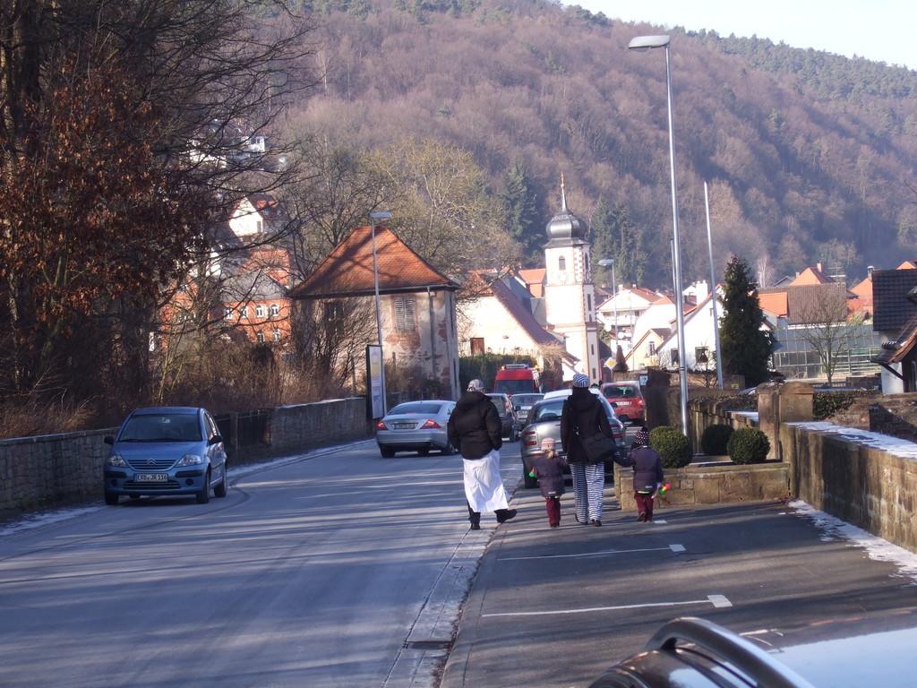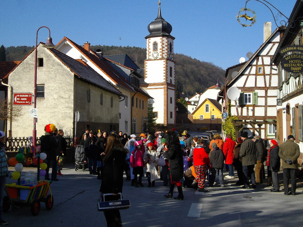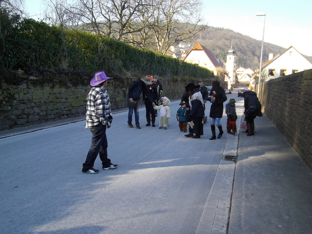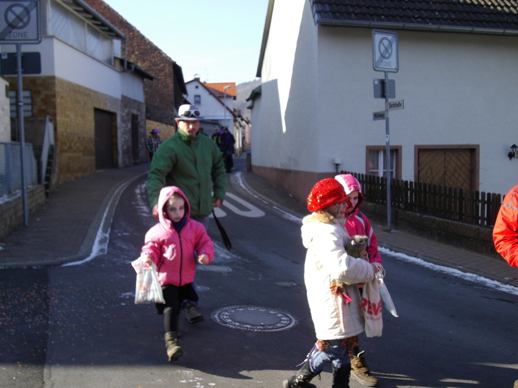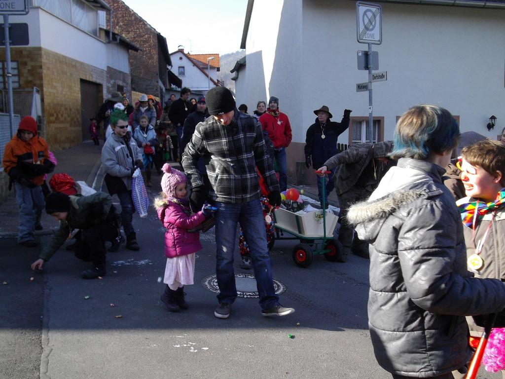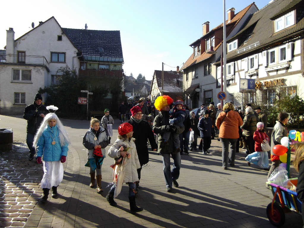wagen zog der Wurm durch den Mühlweg, Brunnenweg, Bachgasse und Miltenberger Straße zur Turnhalle. Sogar Zaungäste gab es unterwegs, die den Zug mit Helau-Rufen und teilweise auch Bonbons unterstützten. Besonders am Dorfbrunnen und am Gasthof Engel drängten sich die Zuschauer.