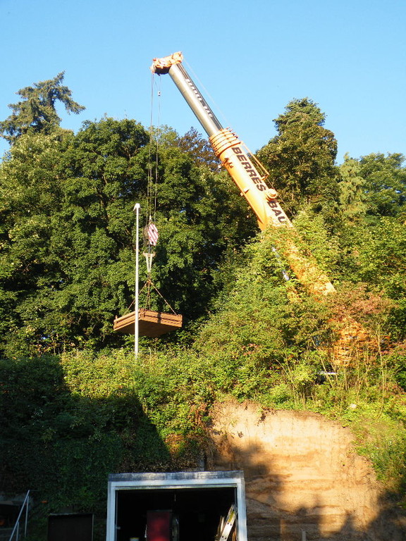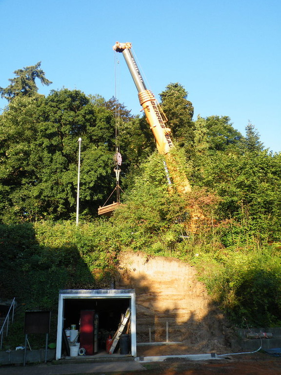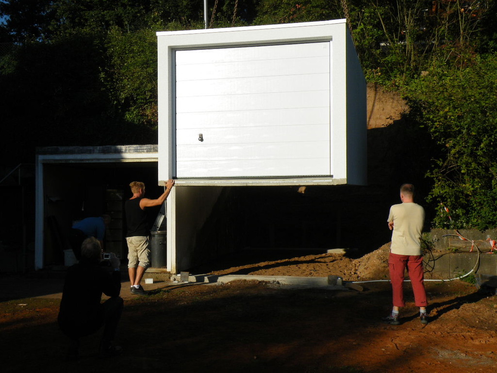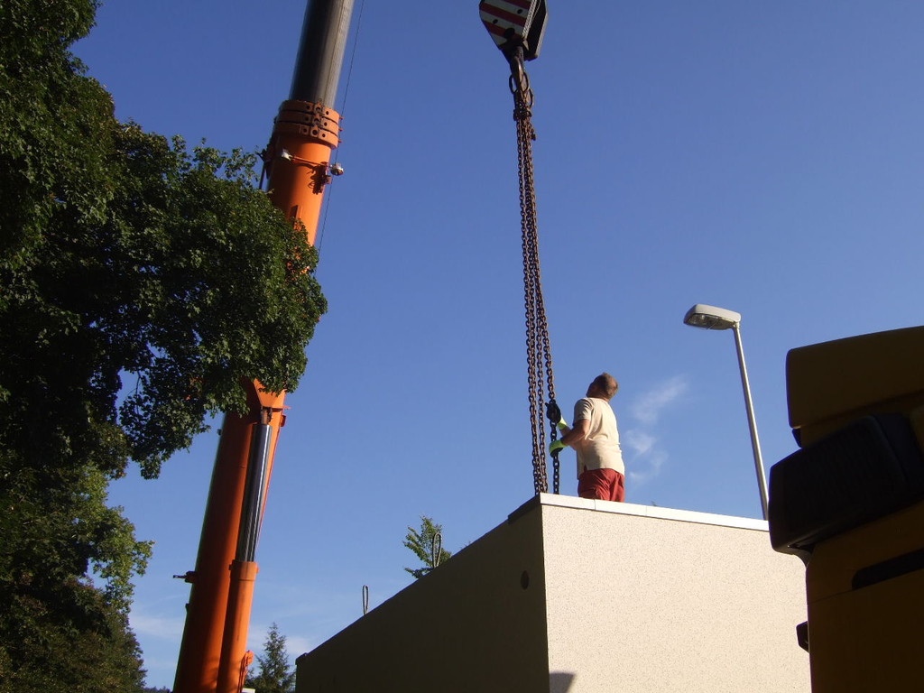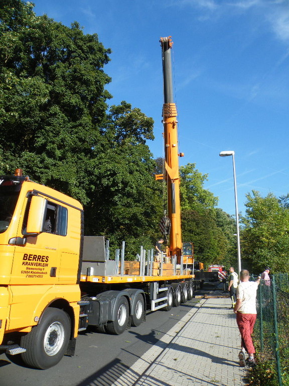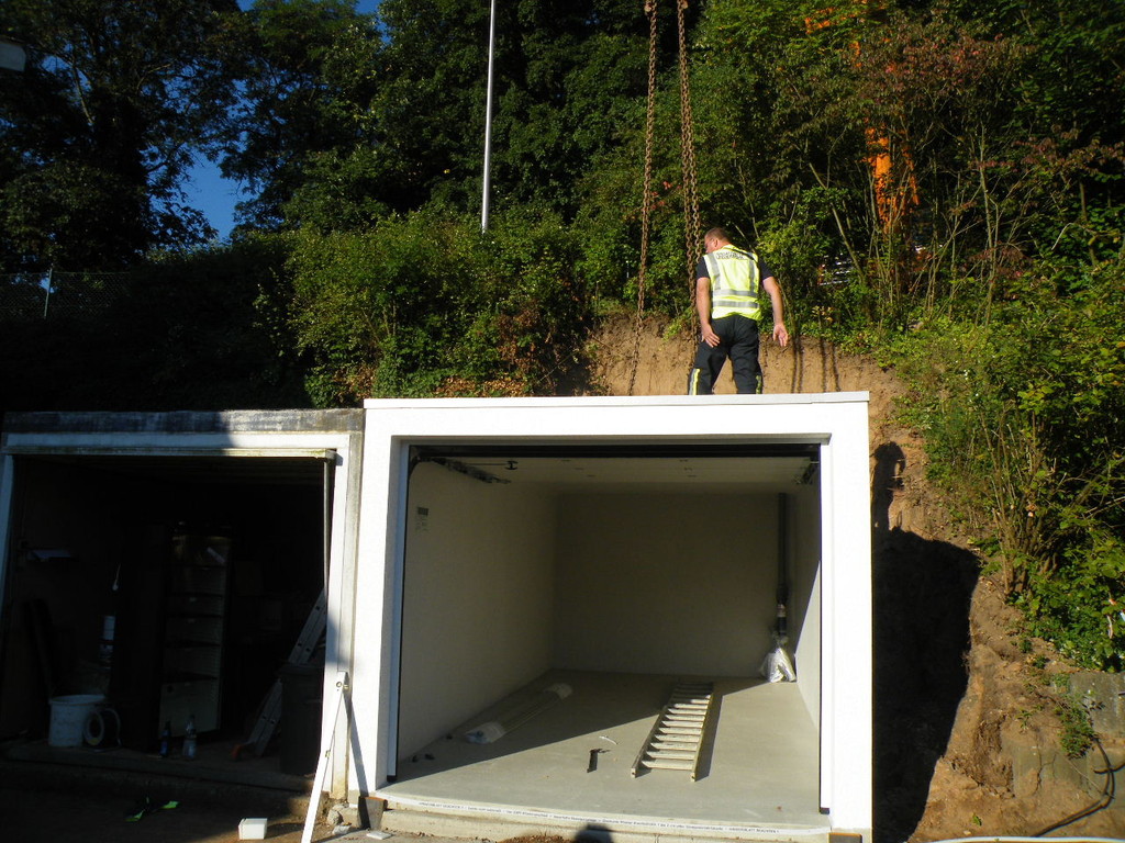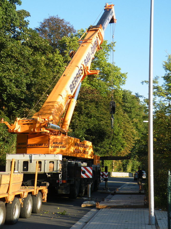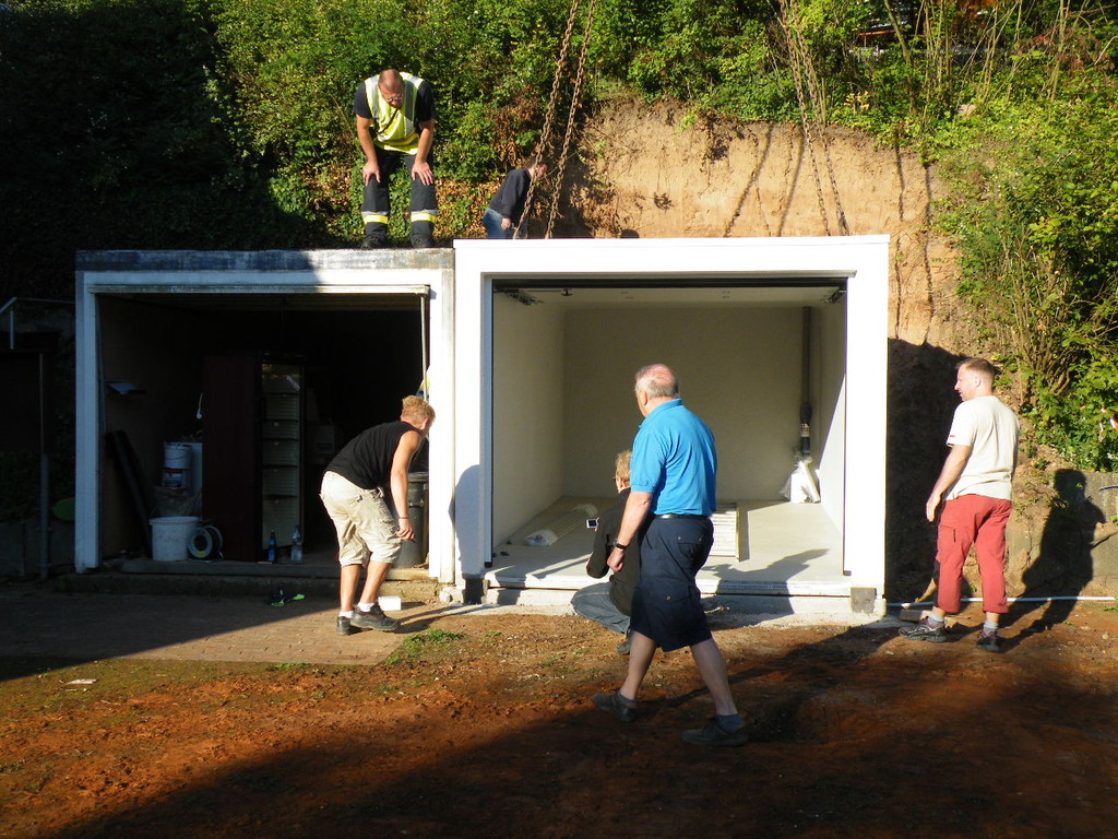 Am Samstag, 18.08.12 wurde endlich die neue Garage geliefert. Schon kurz nach 6:00 Uhr war die Freiwillige Feuerwehr Laudenbach unterwegs, um die Straße abzusperren und den Verkehr umzuleiten, da wegen der Größe des Krans eine Vollsperrung der Miltenberger Straße nötig war. Kurz vor 7:00 Uhr kam der große Kran der Fa. Berres. Innerhalb kurzer Zeit war er einsatzbereit aufgebaut. Da die Firma Zapf pünktlich die Garage lieferte, konnte diese sofort an den ihr zugedachten Platz gehoben werden, was reibungslos und vor allem schnell ablief. Um ca. 8:30 Uhr konnte die Straßensperrung wieder aufgehoben werden. Danke an alle Helfer, die sich bereit erklärt haben, den Turnverein zu so früher Stunde zu unterstützen.