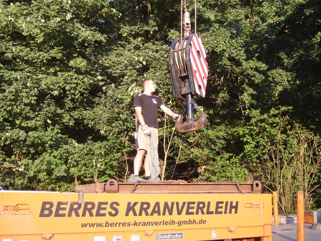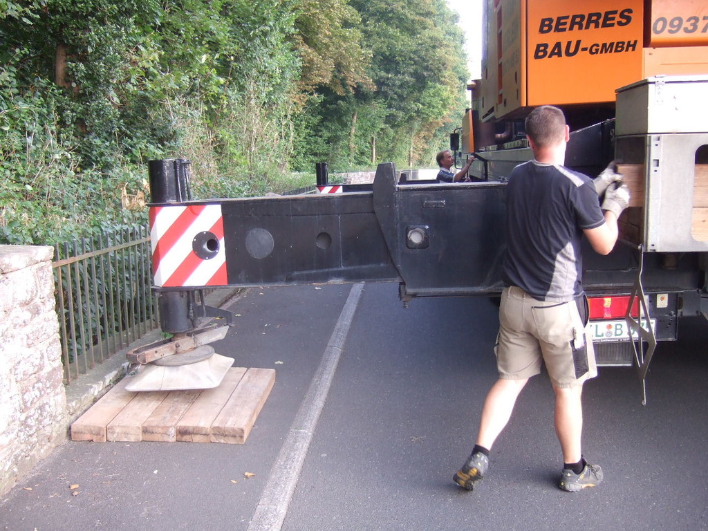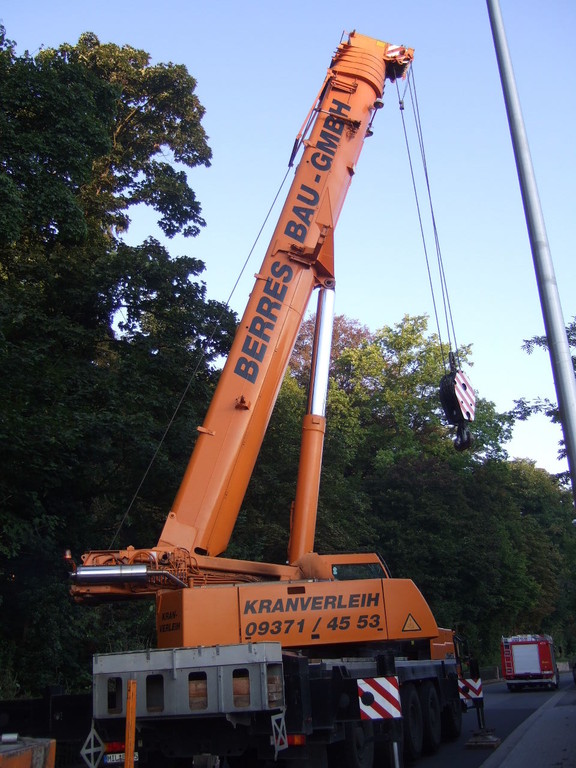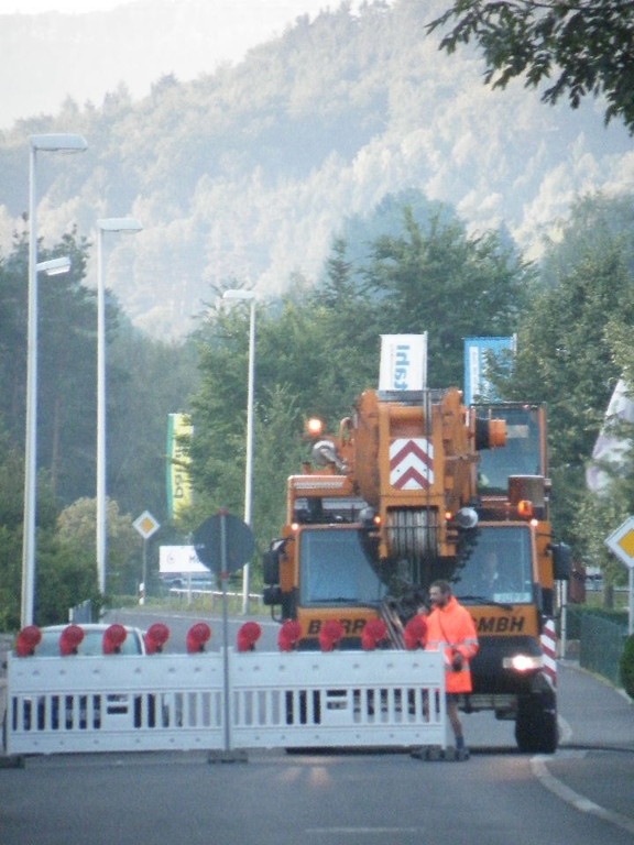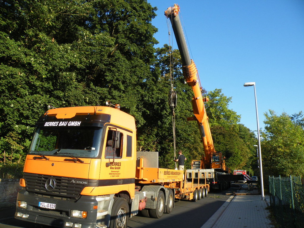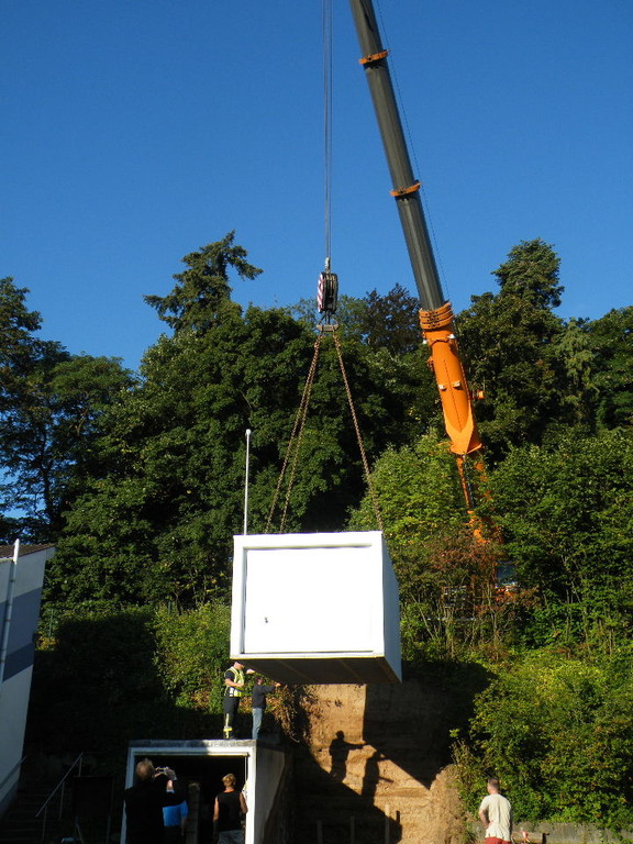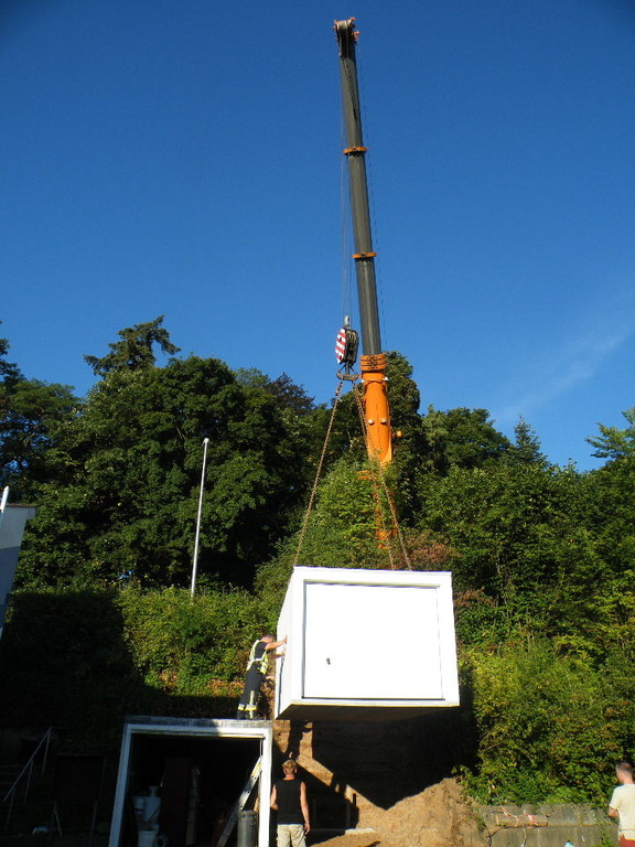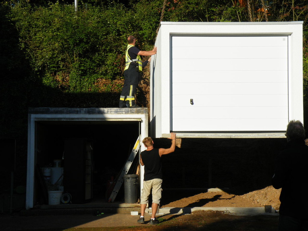 Am Samstag, 18.08.12 wurde endlich die neue Garage geliefert. Schon kurz nach 6:00 Uhr war die Freiwillige Feuerwehr Laudenbach unterwegs, um die Straße abzusperren und den Verkehr umzuleiten, da wegen der Größe des Krans eine Vollsperrung der Miltenberger Straße nötig war. Kurz vor 7:00 Uhr kam der große Kran der Fa. Berres. Innerhalb kurzer Zeit war er einsatzbereit aufgebaut. Da die Firma Zapf pünktlich die Garage lieferte, konnte diese sofort an den ihr zugedachten Platz gehoben werden, was reibungslos und vor allem schnell ablief. Um ca. 8:30 Uhr konnte die Straßensperrung wieder aufgehoben werden. Danke an alle Helfer, die sich bereit erklärt haben, den Turnverein zu so früher Stunde zu unterstützen.