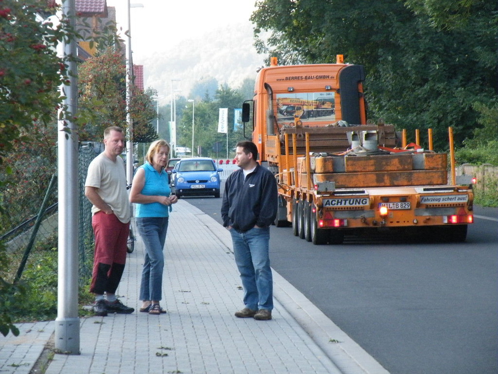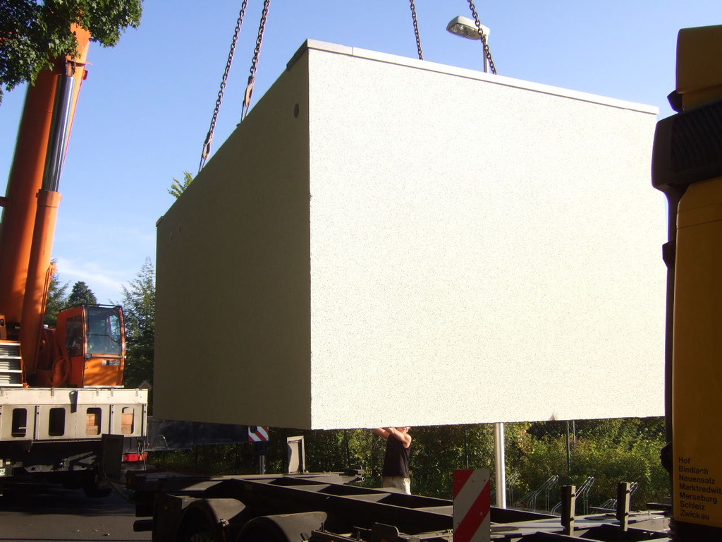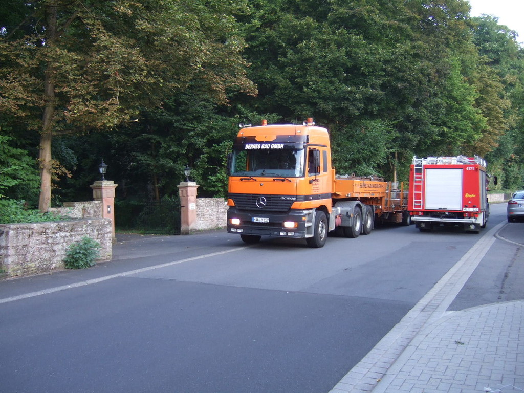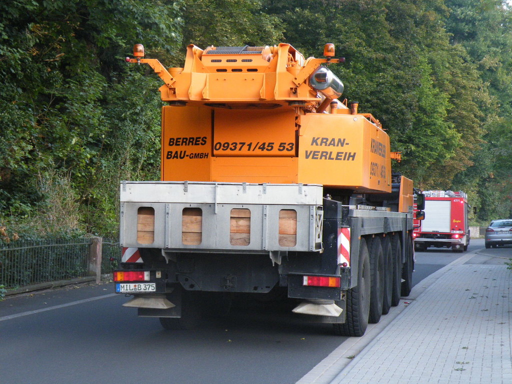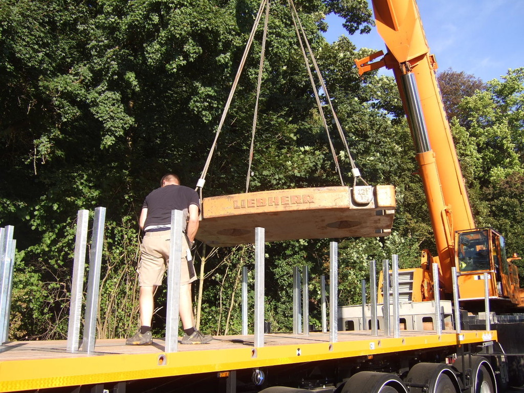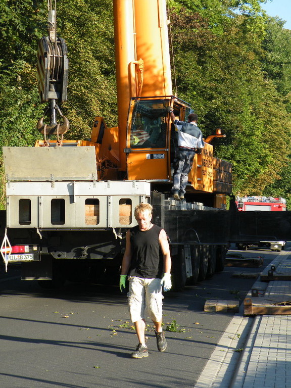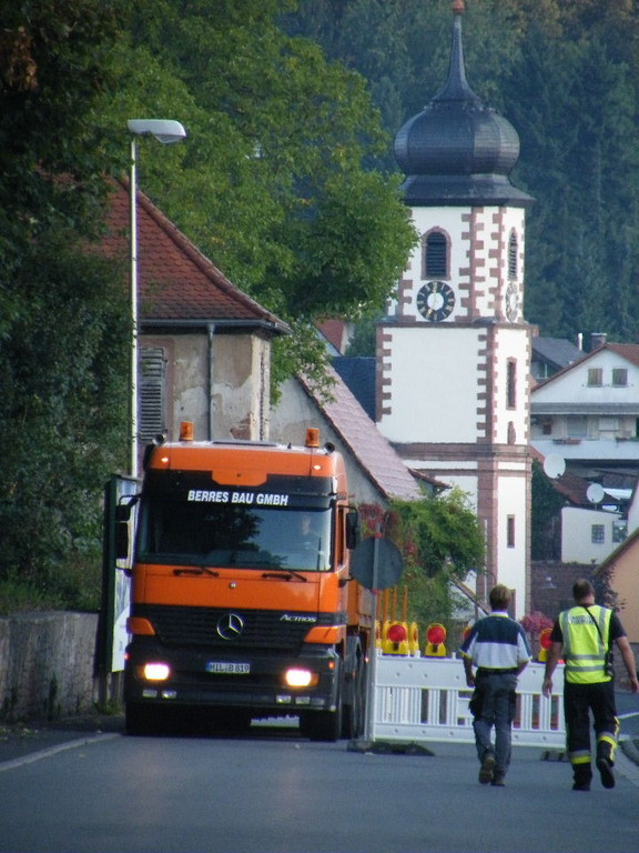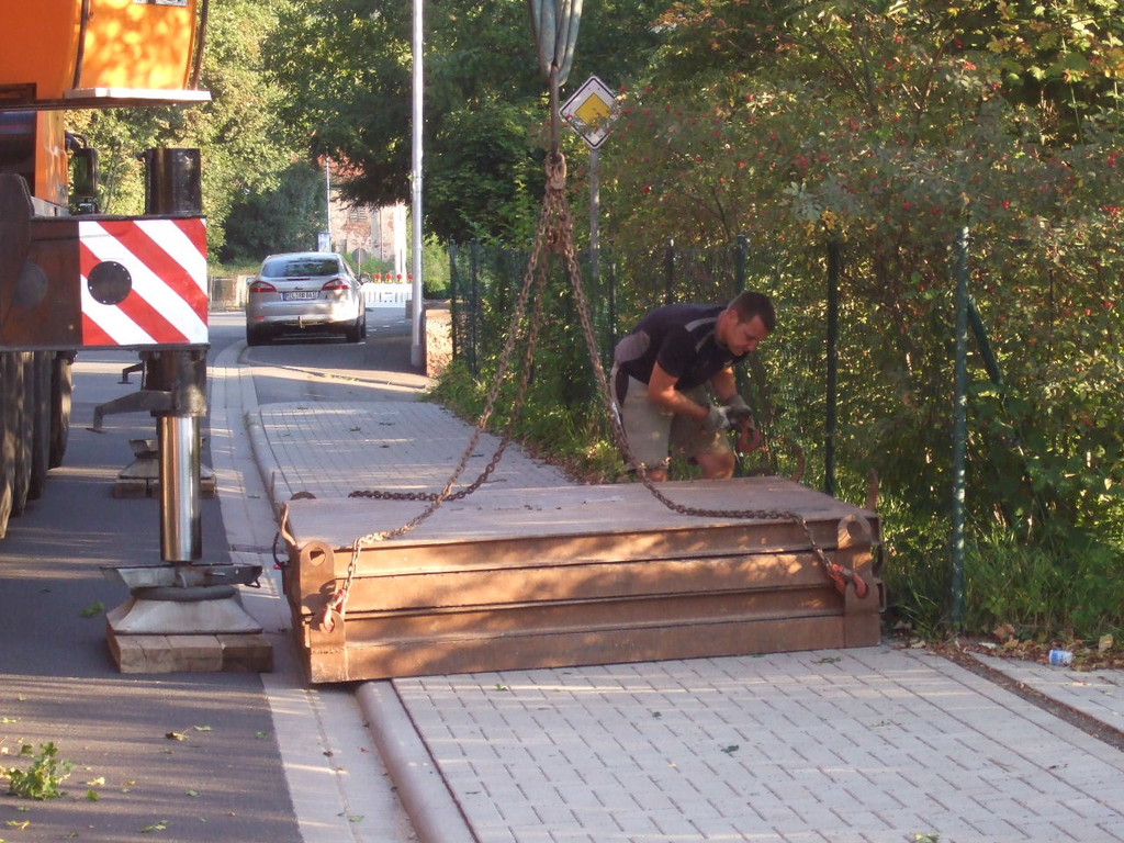 Am Samstag, 18.08.12 wurde endlich die neue Garage geliefert. Schon kurz nach 6:00 Uhr war die Freiwillige Feuerwehr Laudenbach unterwegs, um die Straße abzusperren und den Verkehr umzuleiten, da wegen der Größe des Krans eine Vollsperrung der Miltenberger Straße nötig war. Kurz vor 7:00 Uhr kam der große Kran der Fa. Berres. Innerhalb kurzer Zeit war er einsatzbereit aufgebaut. Da die Firma Zapf pünktlich die Garage lieferte, konnte diese sofort an den ihr zugedachten Platz gehoben werden, was reibungslos und vor allem schnell ablief. Um ca. 8:30 Uhr konnte die Straßensperrung wieder aufgehoben werden. Danke an alle Helfer, die sich bereit erklärt haben, den Turnverein zu so früher Stunde zu unterstützen.