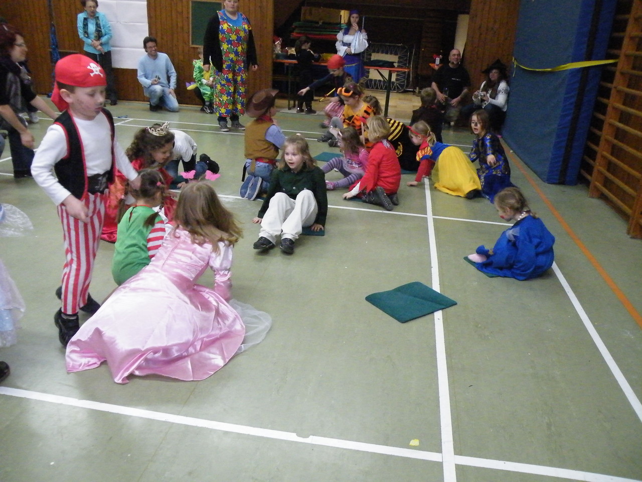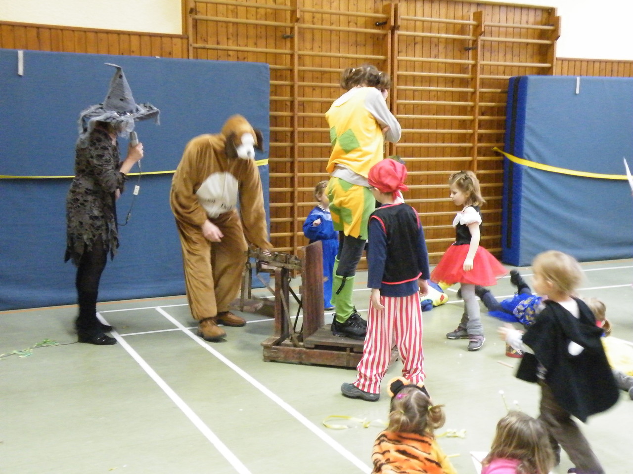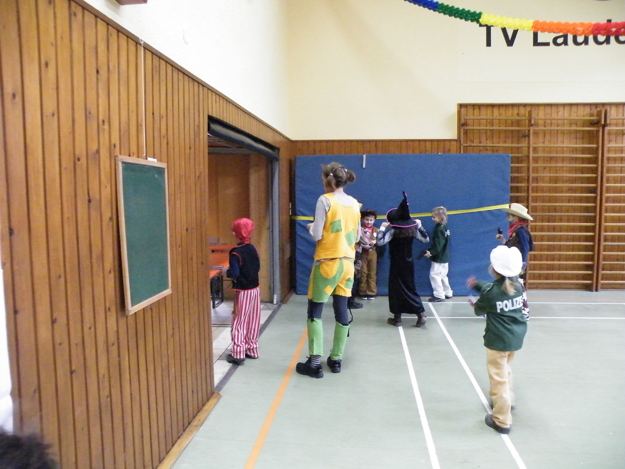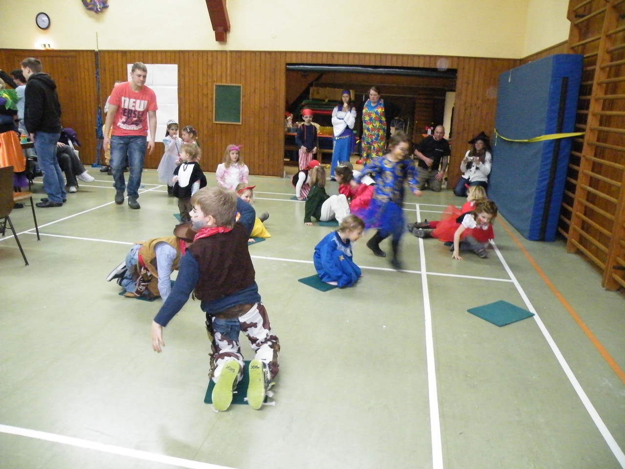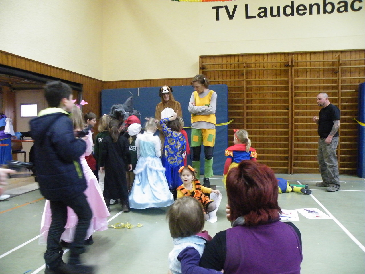 Weiter ging es mit Spielen für die kleinen Narren, wie z. B. Limbo, Reise nach Jerusalem, Luftballon-Wettrennen und Bilder ausmalen. Natürlich gab es dieses Jahr wieder ein Schätzspiel, bei dem das Gesamtgewicht der 1. und 2. Vorsitzenden des Turnvereins geschätzt werden sollte. Wie immer bei Schätzspielen war hier die Spanne des geschätzten Gewichts sehr groß. Gegen 17 Uhr kam es zur Auflösung des Schätzspiels, da zu diesem Zeitpunkt doch schon einige Narren den Heimweg angetreten hatten. Mit Hilfe einer alten Kartoffelwaage (Dezimalwaage), die Georg Breitenbach freundlicherweise zur Verfügung gestellt hat, wurden die 1. und 2. Vorsitzende gewogen. Dabei konnten die Kinder die einzelnen Gewichte auf die Waage stellen. Anschließend wurden die so ermittelten Ergebnisse zusammen gezählt. Nach der Überreichung der Preise (1. Platz Josefina Schneider, 2. Platz Natalie Schädlich, 3. Platz Antonia Ludwig) löste sich die Gesellschaft sehr schnell auf und die fleißigen Helfer konnten mit dem Aufräumen der Halle beginnen.