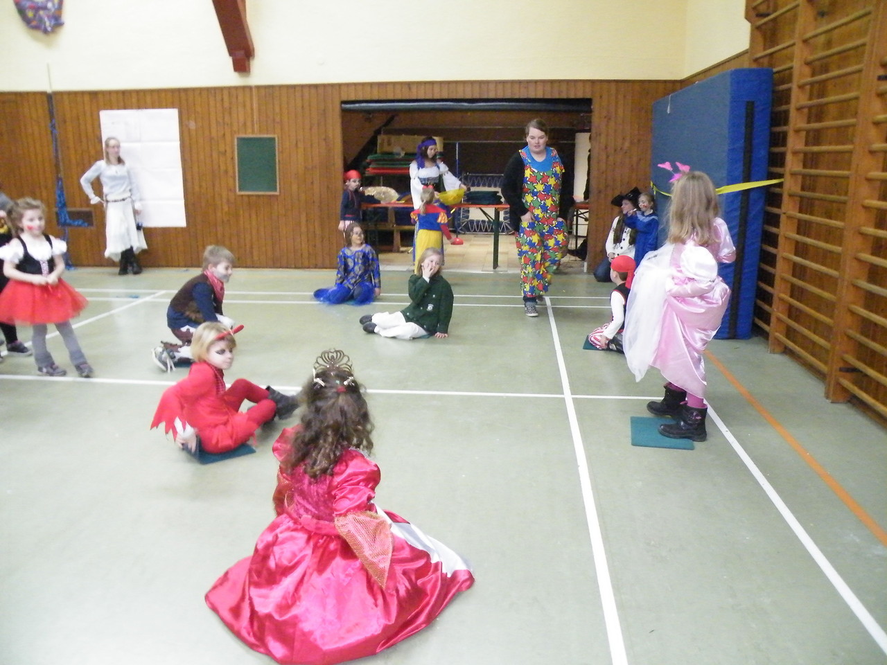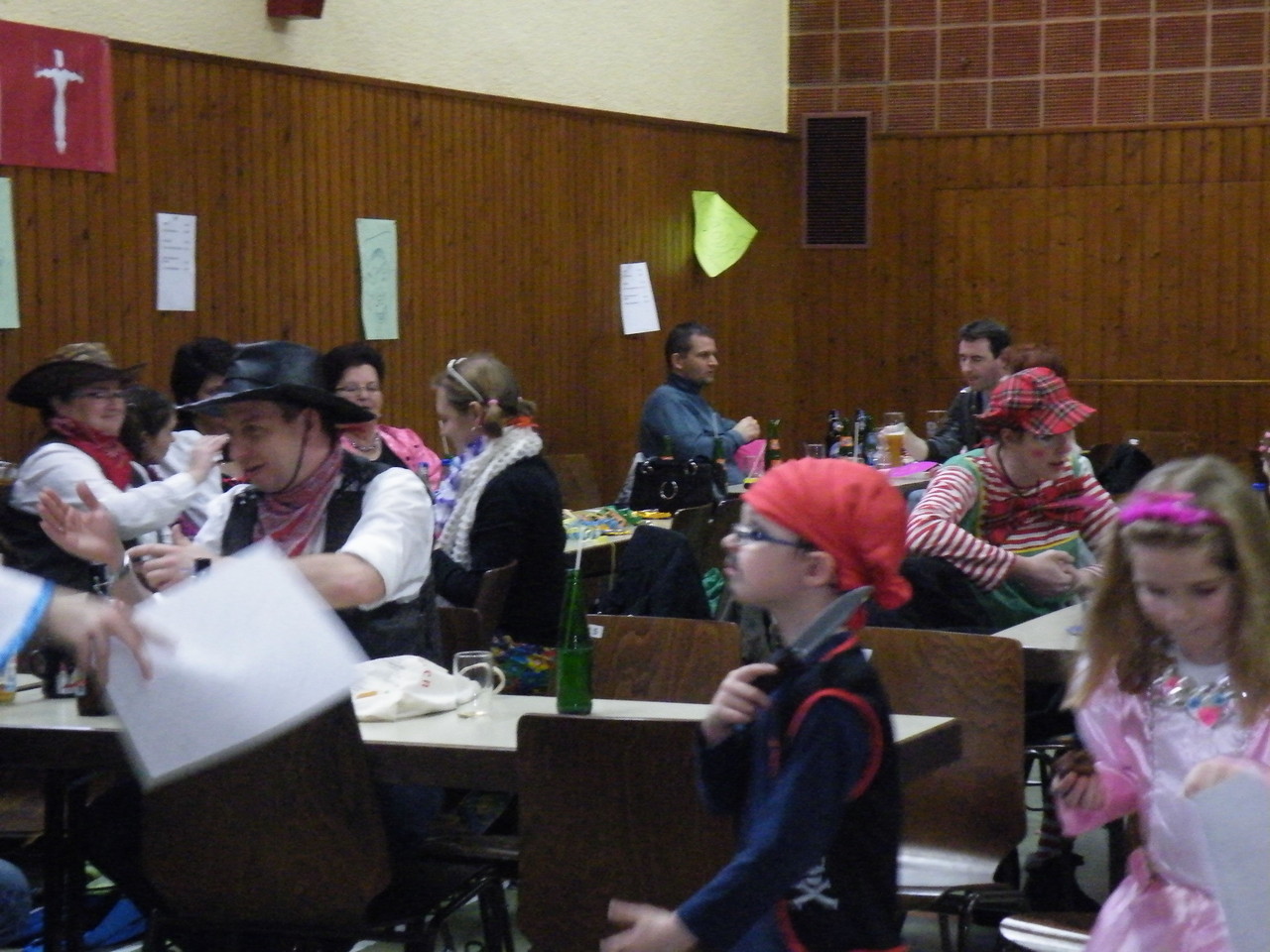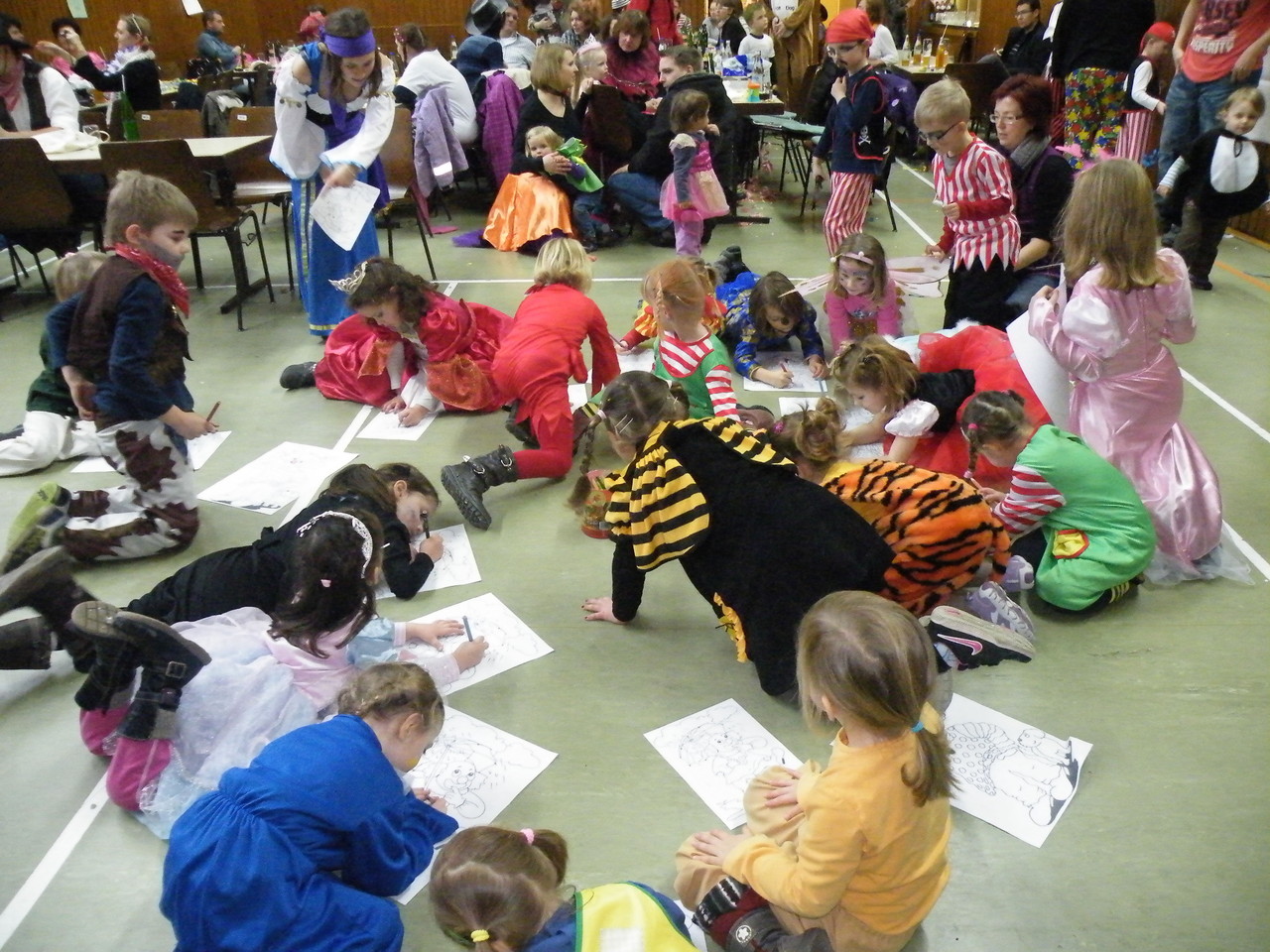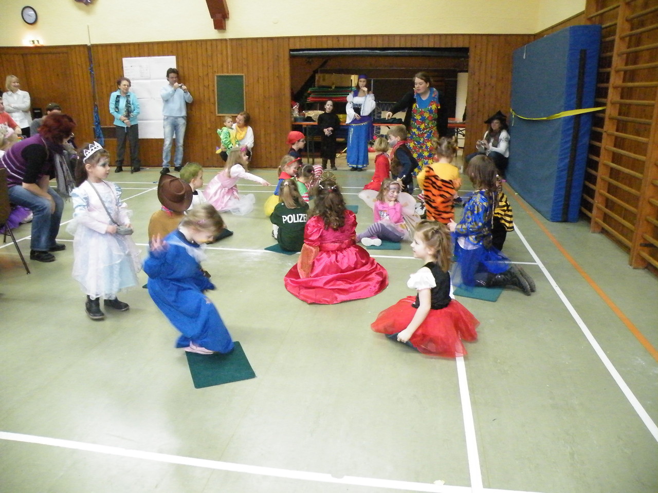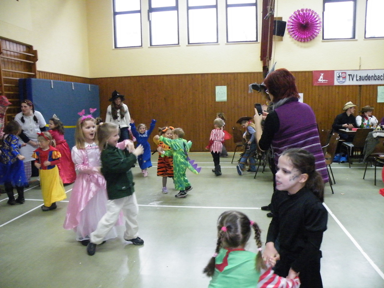 Weiter ging es mit Spielen für die kleinen Narren, wie z. B. Limbo, Reise nach Jerusalem, Luftballon-Wettrennen und Bilder ausmalen. Natürlich gab es dieses Jahr wieder ein Schätzspiel, bei dem das Gesamtgewicht der 1. und 2. Vorsitzenden des Turnvereins geschätzt werden sollte. Wie immer bei Schätzspielen war hier die Spanne des geschätzten Gewichts sehr groß. Gegen 17 Uhr kam es zur Auflösung des Schätzspiels, da zu diesem Zeitpunkt doch schon einige Narren den Heimweg angetreten hatten. Mit Hilfe einer alten Kartoffelwaage (Dezimalwaage), die Georg Breitenbach freundlicherweise zur Verfügung gestellt hat, wurden die 1. und 2. Vorsitzende gewogen. Dabei konnten die Kinder die einzelnen Gewichte auf die Waage stellen. Anschließend wurden die so ermittelten Ergebnisse zusammen gezählt. Nach der Überreichung der Preise (1. Platz Josefina Schneider, 2. Platz Natalie Schädlich, 3. Platz Antonia Ludwig) löste sich die Gesellschaft sehr schnell auf und die fleißigen Helfer konnten mit dem Aufräumen der Halle beginnen.