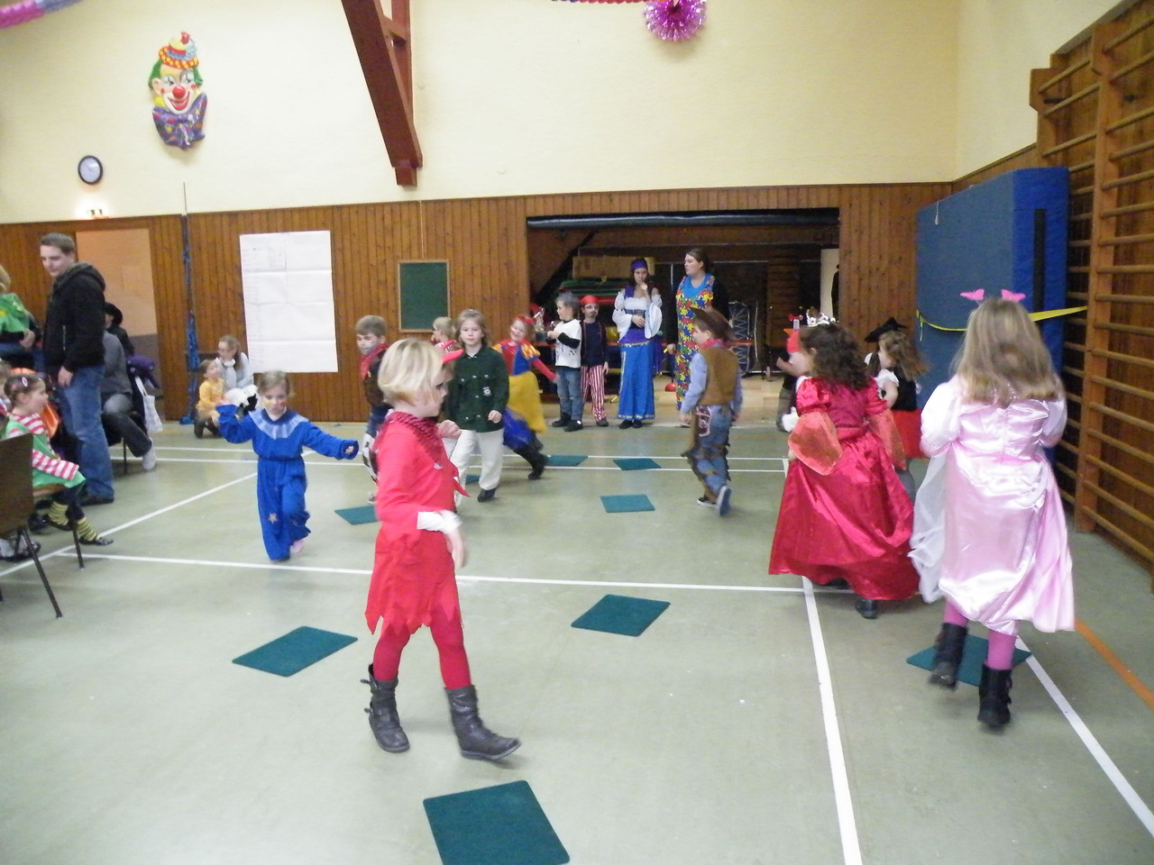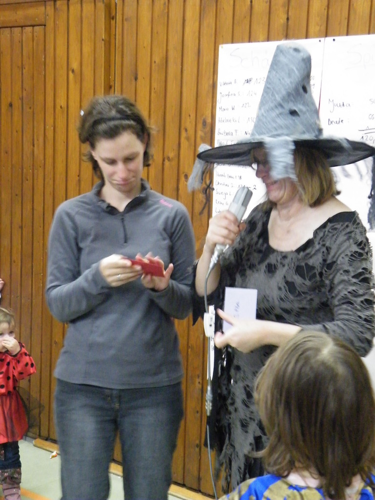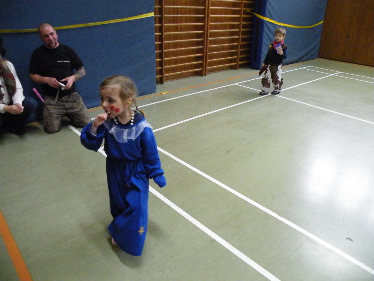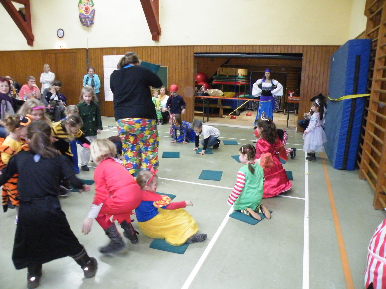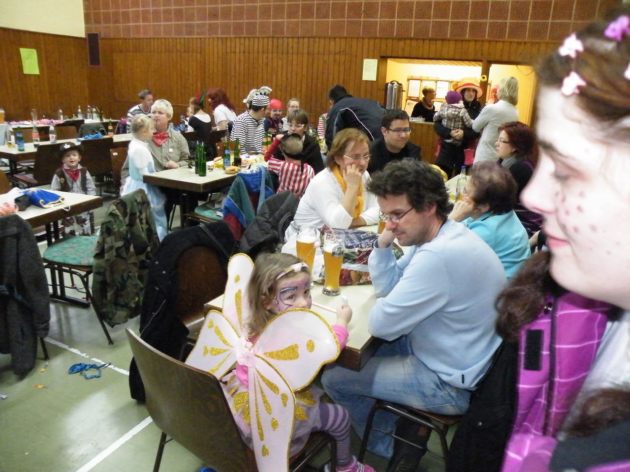 Weiter ging es mit Spielen für die kleinen Narren, wie z. B. Limbo, Reise nach Jerusalem, Luftballon-Wettrennen und Bilder ausmalen. Natürlich gab es dieses Jahr wieder ein Schätzspiel, bei dem das Gesamtgewicht der 1. und 2. Vorsitzenden des Turnvereins geschätzt werden sollte. Wie immer bei Schätzspielen war hier die Spanne des geschätzten Gewichts sehr groß. Gegen 17 Uhr kam es zur Auflösung des Schätzspiels, da zu diesem Zeitpunkt doch schon einige Narren den Heimweg angetreten hatten. Mit Hilfe einer alten Kartoffelwaage (Dezimalwaage), die Georg Breitenbach freundlicherweise zur Verfügung gestellt hat, wurden die 1. und 2. Vorsitzende gewogen. Dabei konnten die Kinder die einzelnen Gewichte auf die Waage stellen. Anschließend wurden die so ermittelten Ergebnisse zusammen gezählt. Nach der Überreichung der Preise (1. Platz Josefina Schneider, 2. Platz Natalie Schädlich, 3. Platz Antonia Ludwig) löste sich die Gesellschaft sehr schnell auf und die fleißigen Helfer konnten mit dem Aufräumen der Halle beginnen.