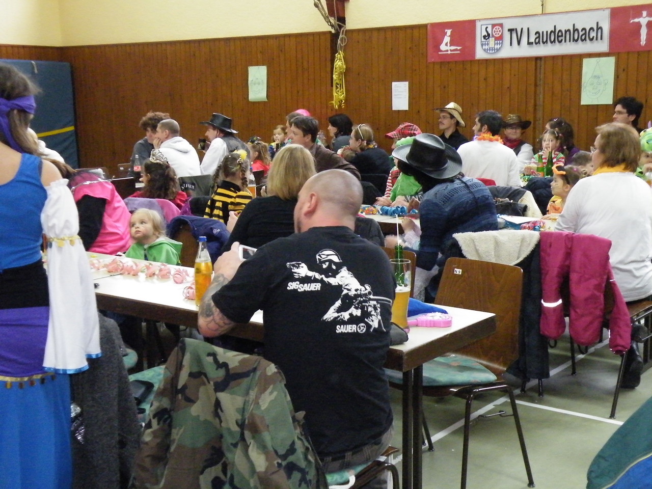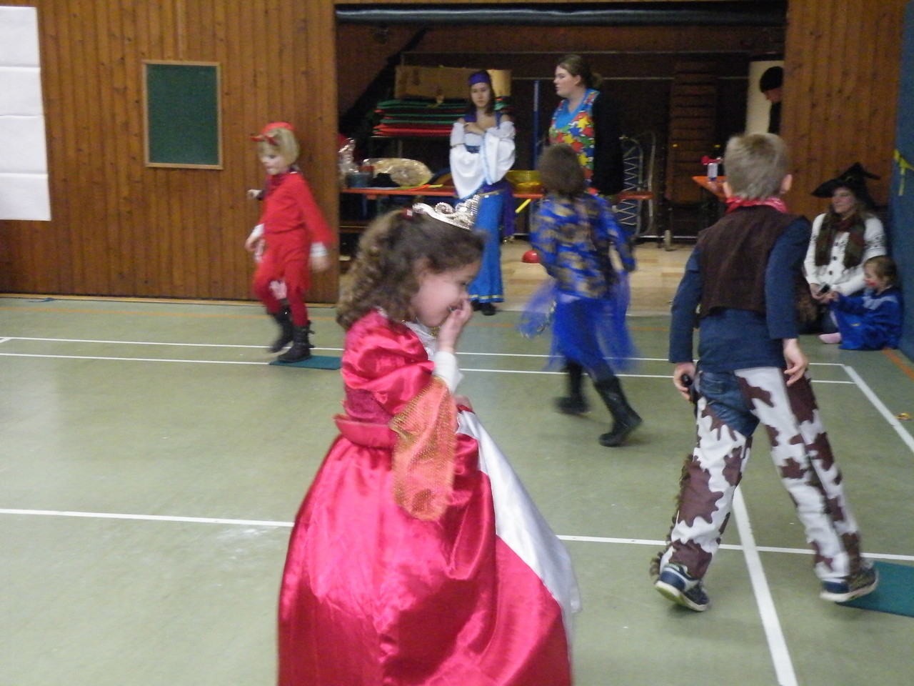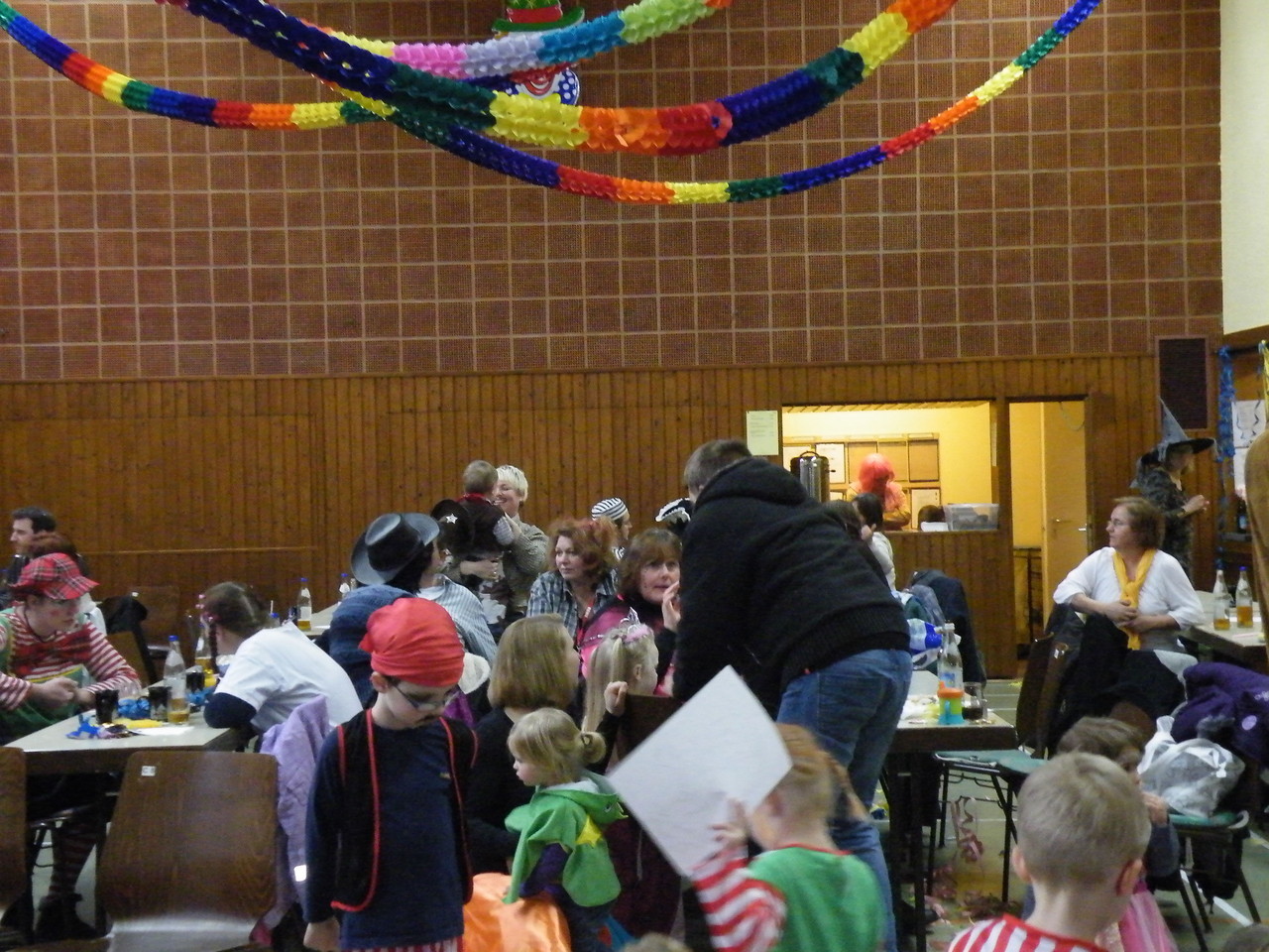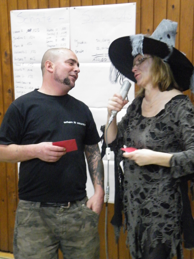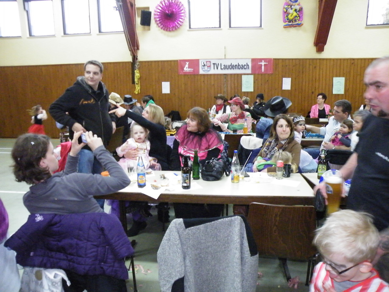 Weiter ging es mit Spielen für die kleinen Narren, wie z. B. Limbo, Reise nach Jerusalem, Luftballon-Wettrennen und Bilder ausmalen. Natürlich gab es dieses Jahr wieder ein Schätzspiel, bei dem das Gesamtgewicht der 1. und 2. Vorsitzenden des Turnvereins geschätzt werden sollte. Wie immer bei Schätzspielen war hier die Spanne des geschätzten Gewichts sehr groß. Gegen 17 Uhr kam es zur Auflösung des Schätzspiels, da zu diesem Zeitpunkt doch schon einige Narren den Heimweg angetreten hatten. Mit Hilfe einer alten Kartoffelwaage (Dezimalwaage), die Georg Breitenbach freundlicherweise zur Verfügung gestellt hat, wurden die 1. und 2. Vorsitzende gewogen. Dabei konnten die Kinder die einzelnen Gewichte auf die Waage stellen. Anschließend wurden die so ermittelten Ergebnisse zusammen gezählt. Nach der Überreichung der Preise (1. Platz Josefina Schneider, 2. Platz Natalie Schädlich, 3. Platz Antonia Ludwig) löste sich die Gesellschaft sehr schnell auf und die fleißigen Helfer konnten mit dem Aufräumen der Halle beginnen.