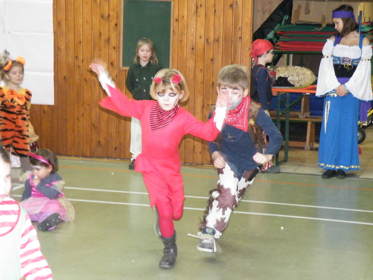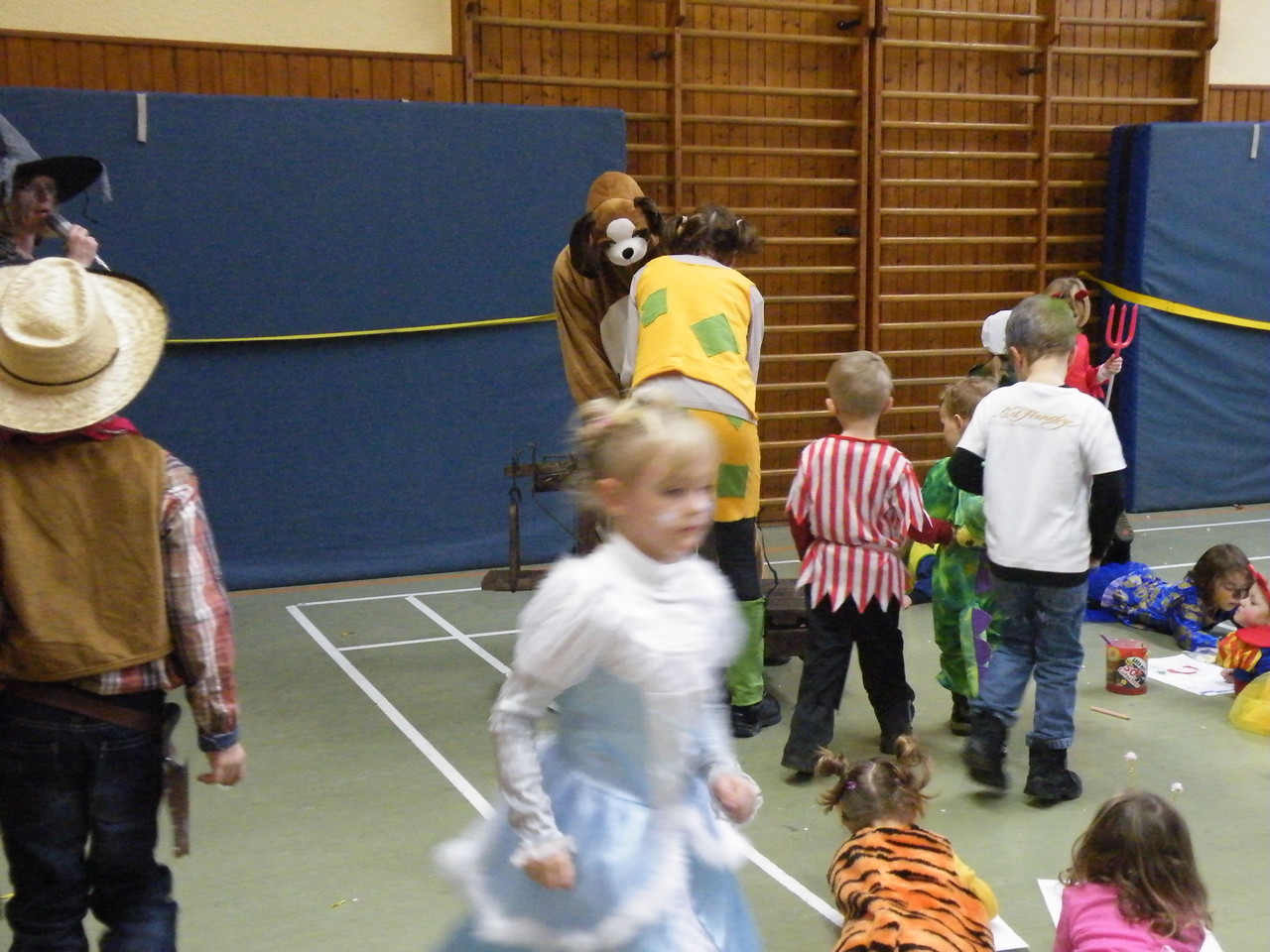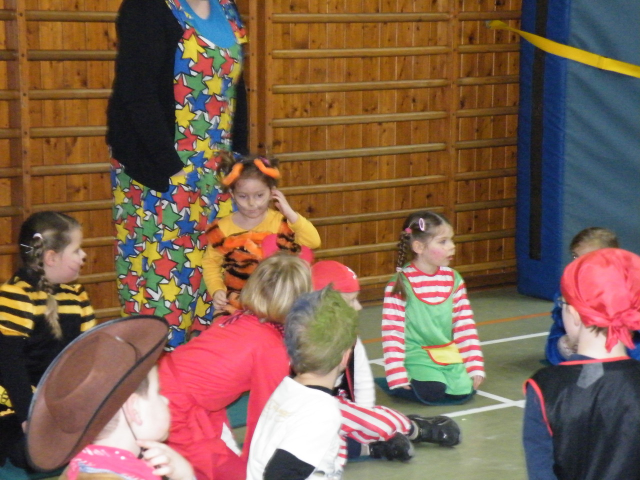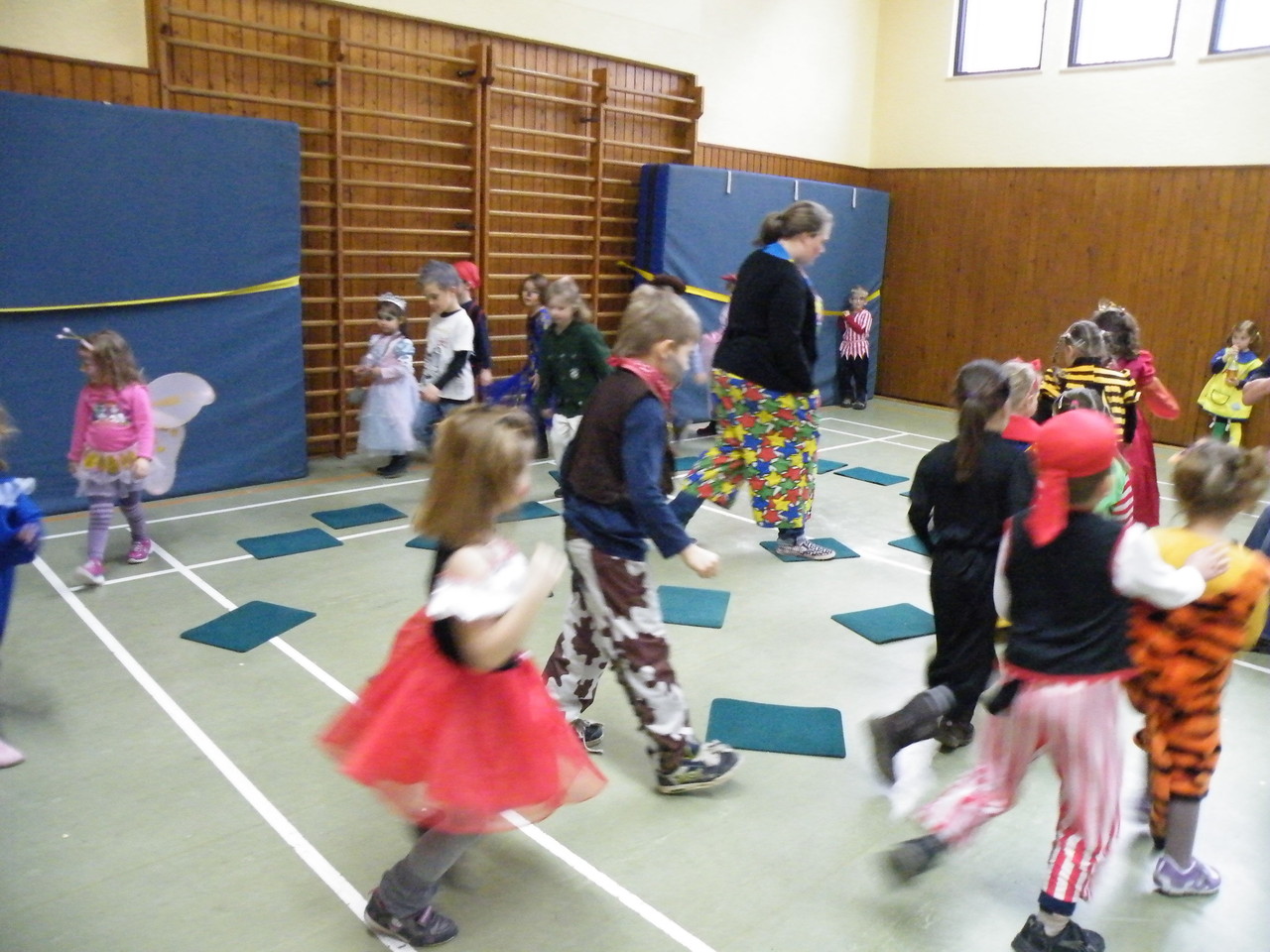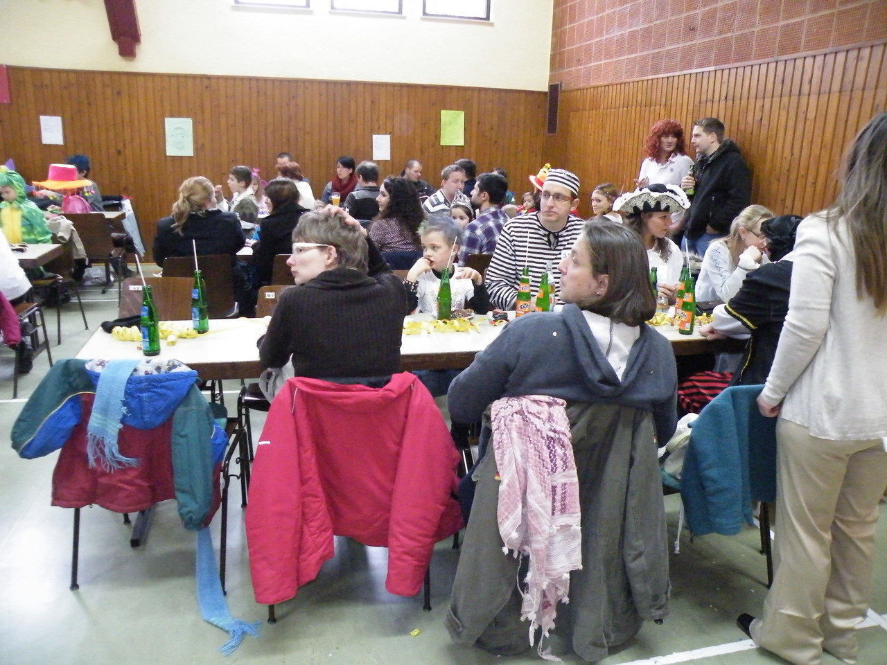 Weiter ging es mit Spielen für die kleinen Narren, wie z. B. Limbo, Reise nach Jerusalem, Luftballon-Wettrennen und Bilder ausmalen. Natürlich gab es dieses Jahr wieder ein Schätzspiel, bei dem das Gesamtgewicht der 1. und 2. Vorsitzenden des Turnvereins geschätzt werden sollte. Wie immer bei Schätzspielen war hier die Spanne des geschätzten Gewichts sehr groß. Gegen 17 Uhr kam es zur Auflösung des Schätzspiels, da zu diesem Zeitpunkt doch schon einige Narren den Heimweg angetreten hatten. Mit Hilfe einer alten Kartoffelwaage (Dezimalwaage), die Georg Breitenbach freundlicherweise zur Verfügung gestellt hat, wurden die 1. und 2. Vorsitzende gewogen. Dabei konnten die Kinder die einzelnen Gewichte auf die Waage stellen. Anschließend wurden die so ermittelten Ergebnisse zusammen gezählt. Nach der Überreichung der Preise (1. Platz Josefina Schneider, 2. Platz Natalie Schädlich, 3. Platz Antonia Ludwig) löste sich die Gesellschaft sehr schnell auf und die fleißigen Helfer konnten mit dem Aufräumen der Halle beginnen.