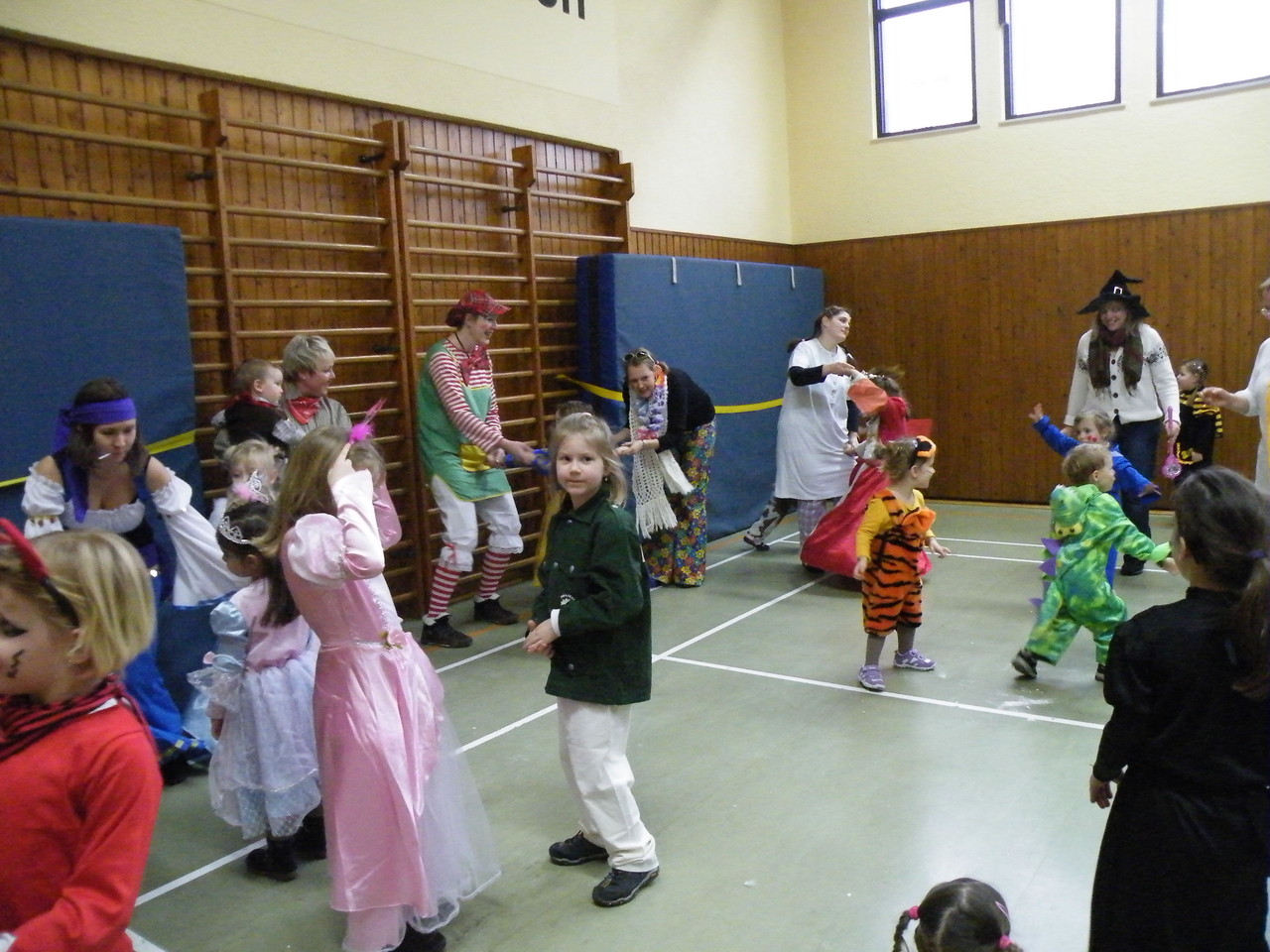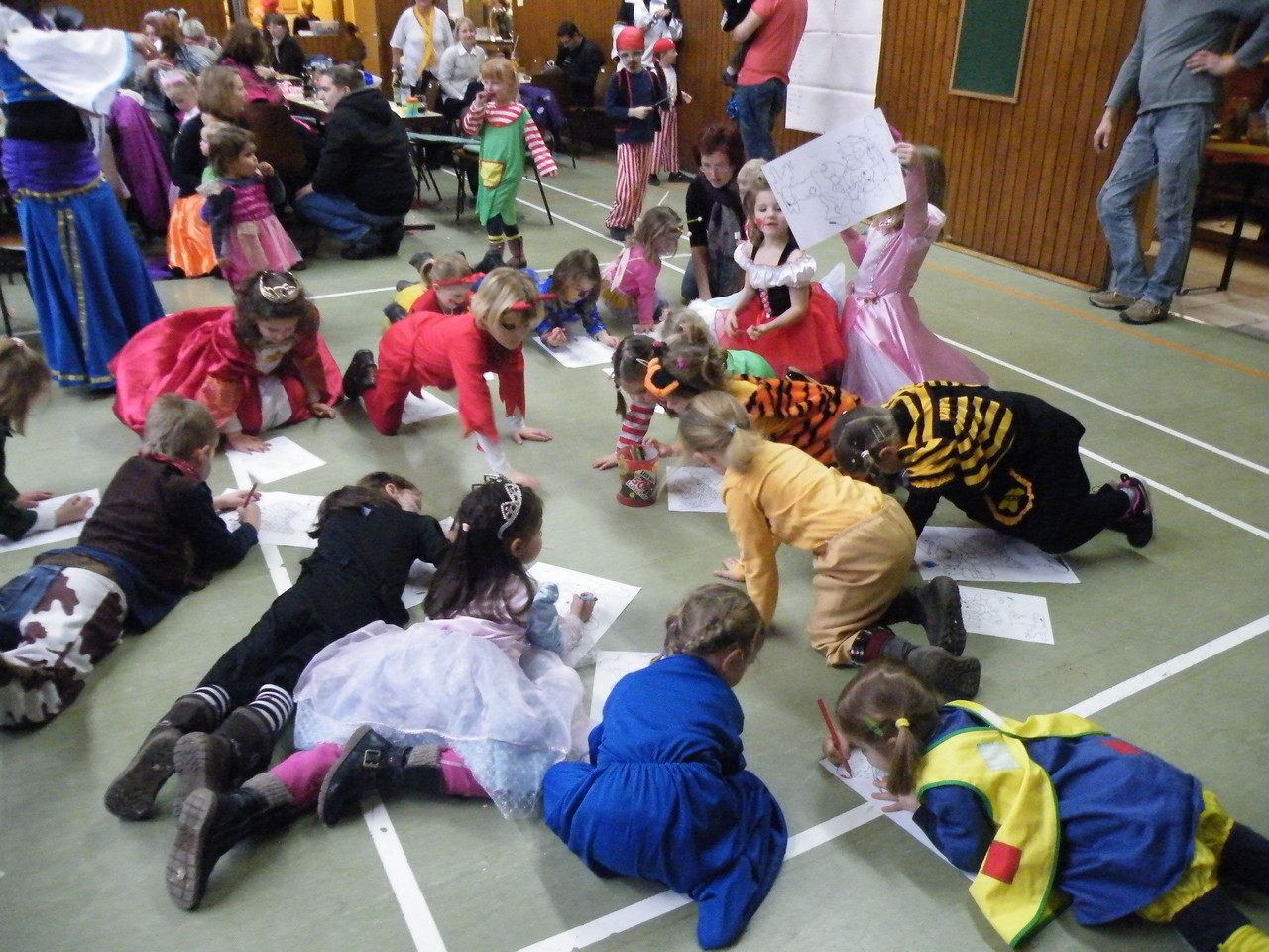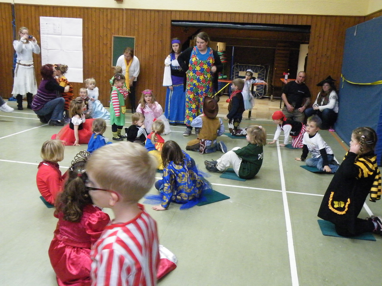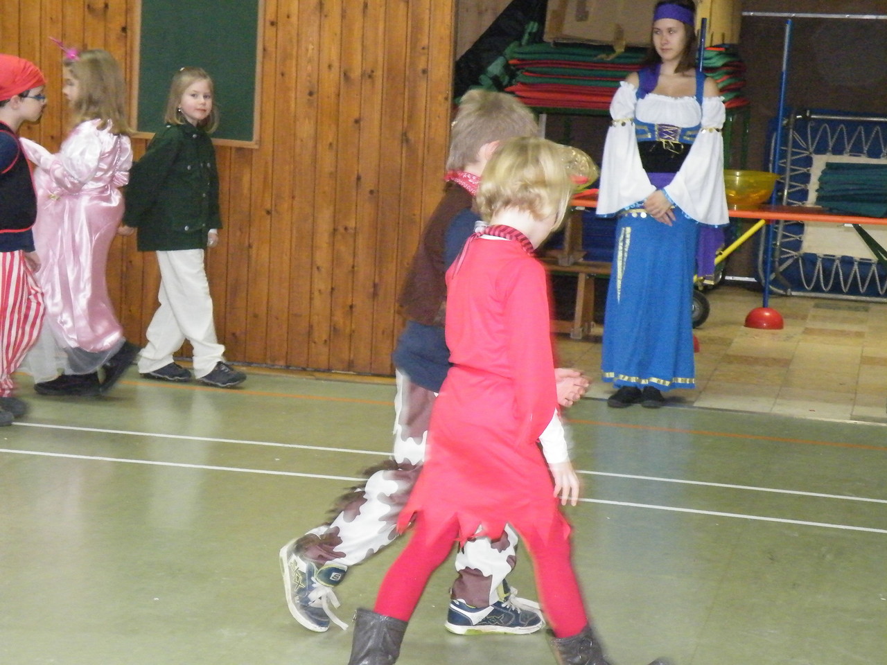 Weiter ging es mit Spielen für die kleinen Narren, wie z. B. Limbo, Reise nach Jerusalem, Luftballon-Wettrennen und Bilder ausmalen. Natürlich gab es dieses Jahr wieder ein Schätzspiel, bei dem das Gesamtgewicht der 1. und 2. Vorsitzenden des Turnvereins geschätzt werden sollte. Wie immer bei Schätzspielen war hier die Spanne des geschätzten Gewichts sehr groß. Gegen 17 Uhr kam es zur Auflösung des Schätzspiels, da zu diesem Zeitpunkt doch schon einige Narren den Heimweg angetreten hatten. Mit Hilfe einer alten Kartoffelwaage (Dezimalwaage), die Georg Breitenbach freundlicherweise zur Verfügung gestellt hat, wurden die 1. und 2. Vorsitzende gewogen. Dabei konnten die Kinder die einzelnen Gewichte auf die Waage stellen. Anschließend wurden die so ermittelten Ergebnisse zusammen gezählt. Nach der Überreichung der Preise (1. Platz Josefina Schneider, 2. Platz Natalie Schädlich, 3. Platz Antonia Ludwig) löste sich die Gesellschaft sehr schnell auf und die fleißigen Helfer konnten mit dem Aufräumen der Halle beginnen.