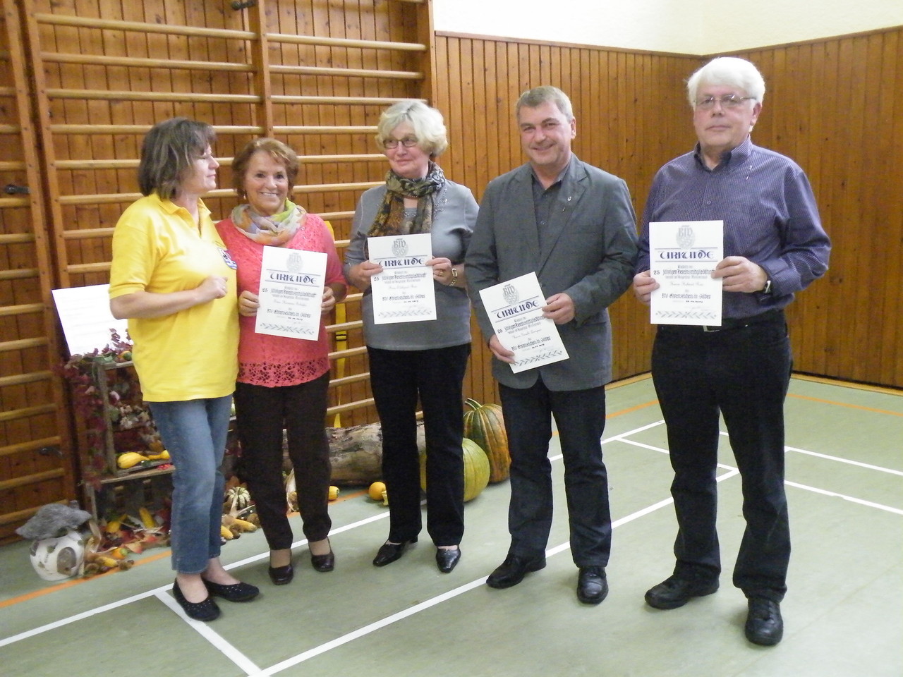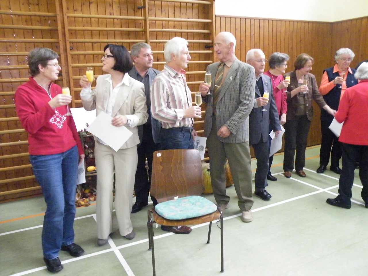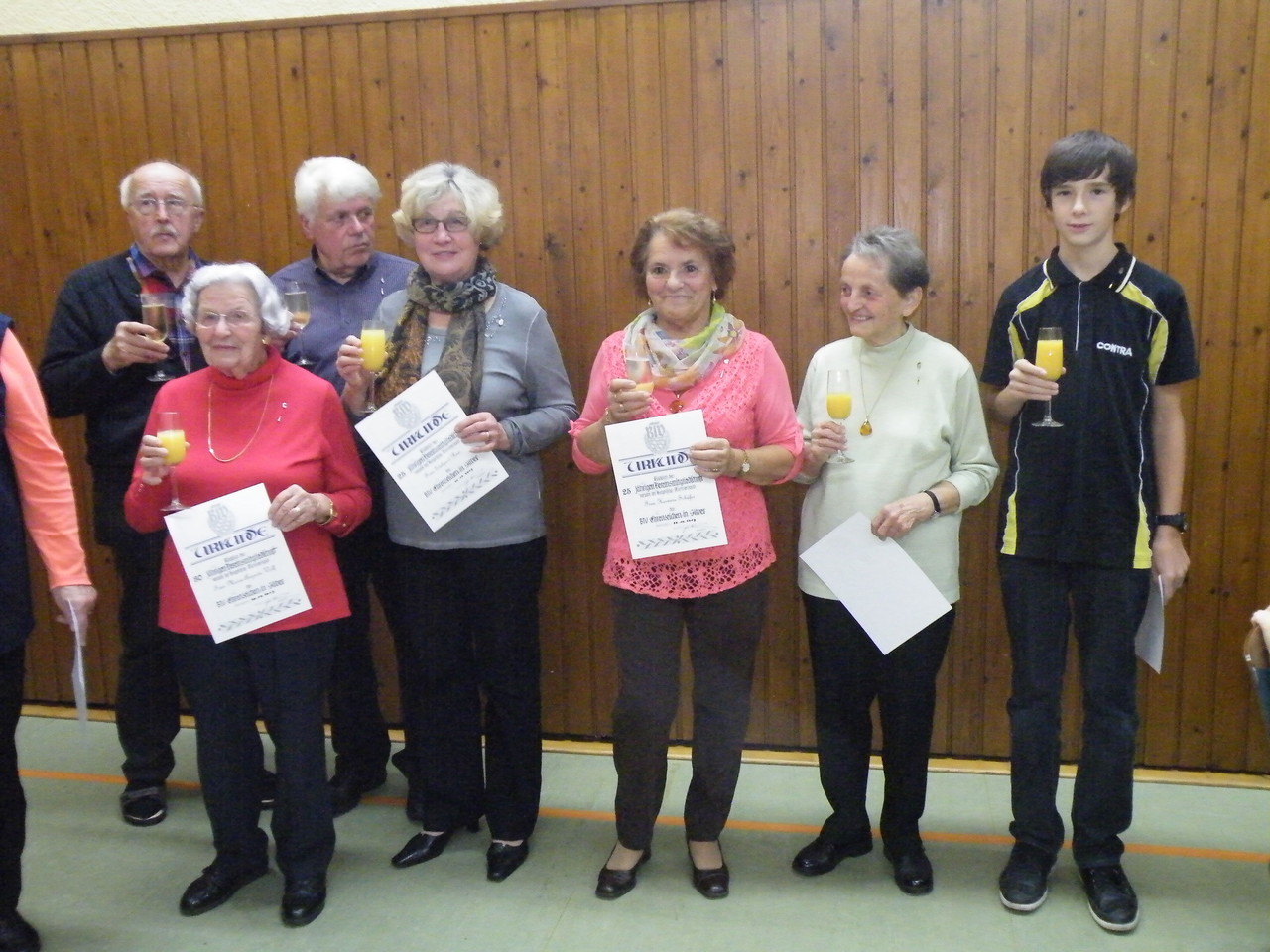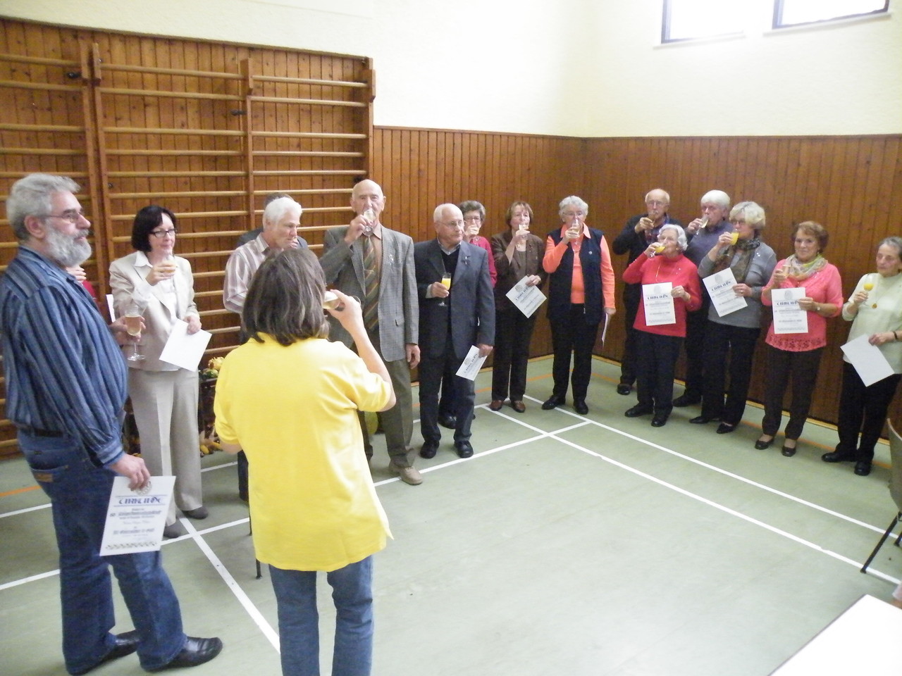 Insgesamt 52 Mitglieder hätten an diesem Tag in der Turnhalle geehrt werden können, aber natürlich haben nicht alle Zeit gefunden. Es waren aber viele persönlich anwesend, die von der 1. Vorsitzenden, Beate Picard, eine Ehrennadel und Urkunde überreicht bekamen. Als kleine Überraschung gab es für die Geehrten im Anschluss einen Sekt, Sekt-Orange oder auch Orangensaft pur. Im Einzelnen gibt es folgende „Jubilare“ (alle die nicht persönlich erscheinen konnten, erhalten natürlich auch ihre Ehrennadel und Urkunde):