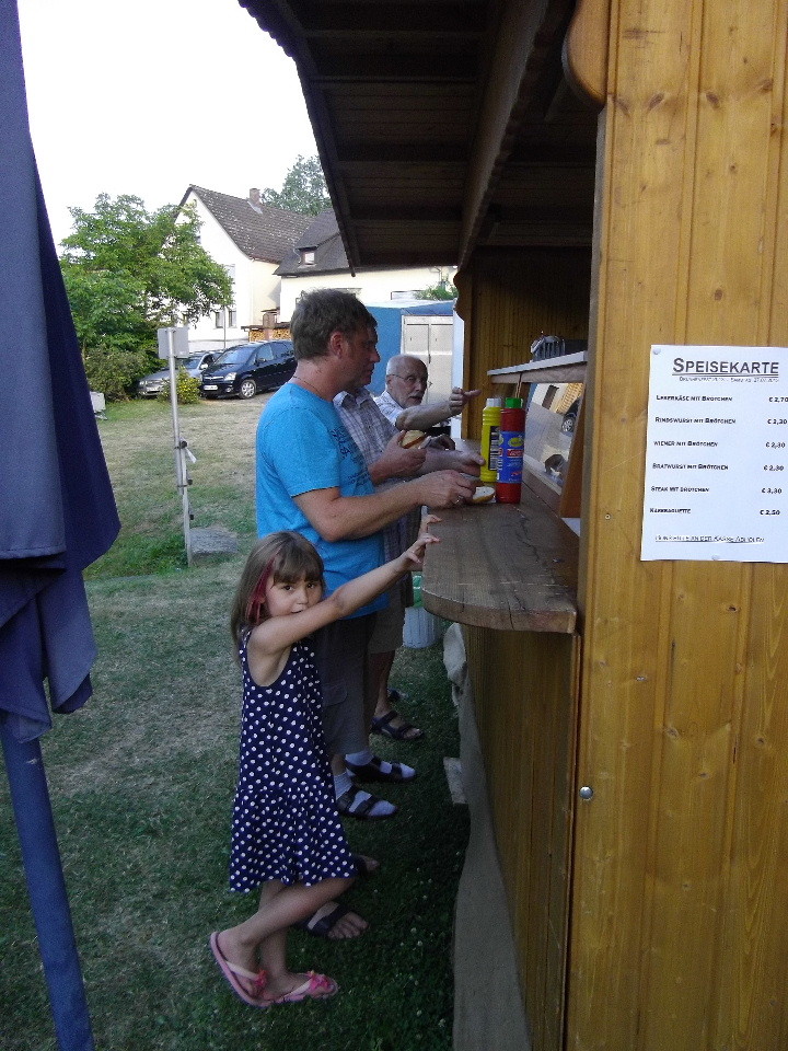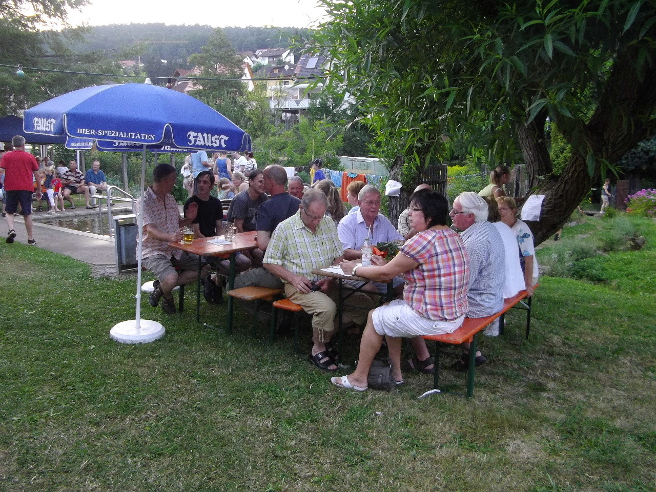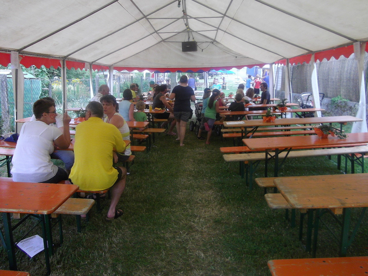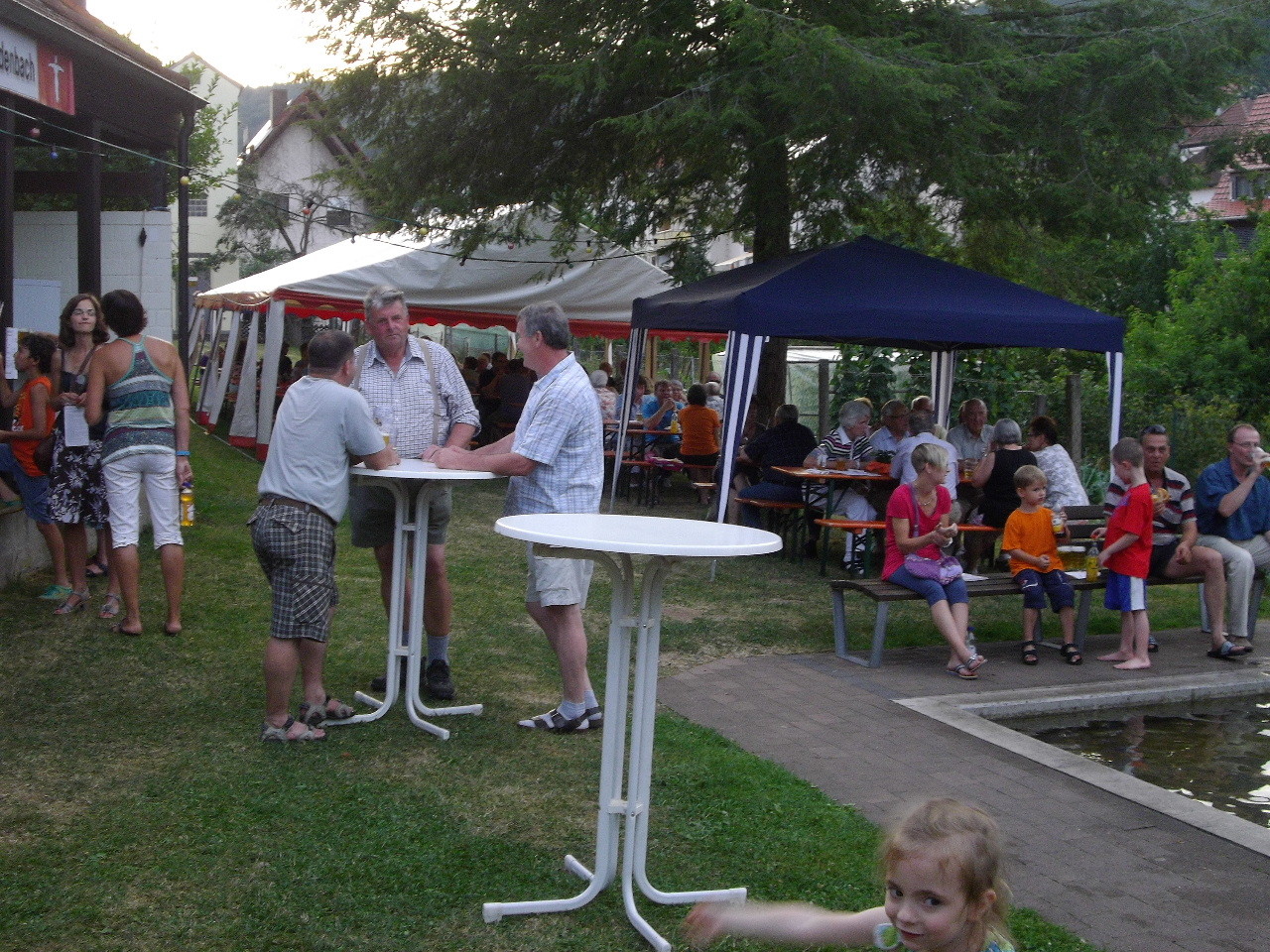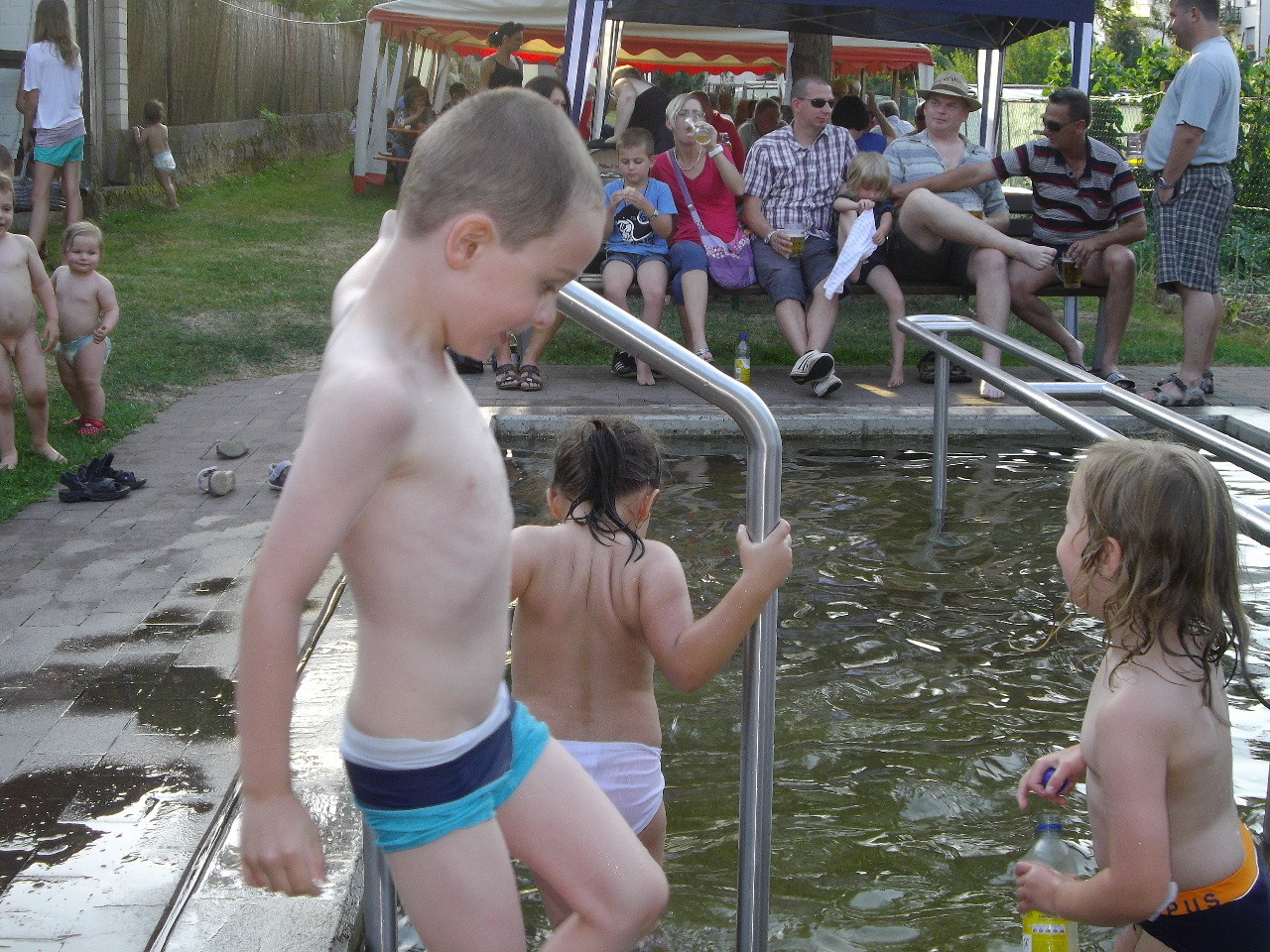 Das Tretbecken war ein magischer Anziehungspunkt. Darin tummelten sich am Wochenende Groß und Klein, um bei der Hitze wenigstens etwas Abkühlung zu bekommen. Am Samstag erschienen Punkt 18 Uhr die ersten Festbesucher und innerhalb kurzer Zeit waren die Plätze rund um das Tretbecken gut besetzt. Die Helfer hatten alle Hände voll zu tun, die Besucher mit Essen und Trinken zu versorgen. Im Angebot für die Erwachsenen gab es dieses Jahr auch Bacardi, Wodka und Bowle, was aber nicht ganz so gut angenommen wurde. Bis tief in die Nacht saßen die letzten Besucher im Zelt.
