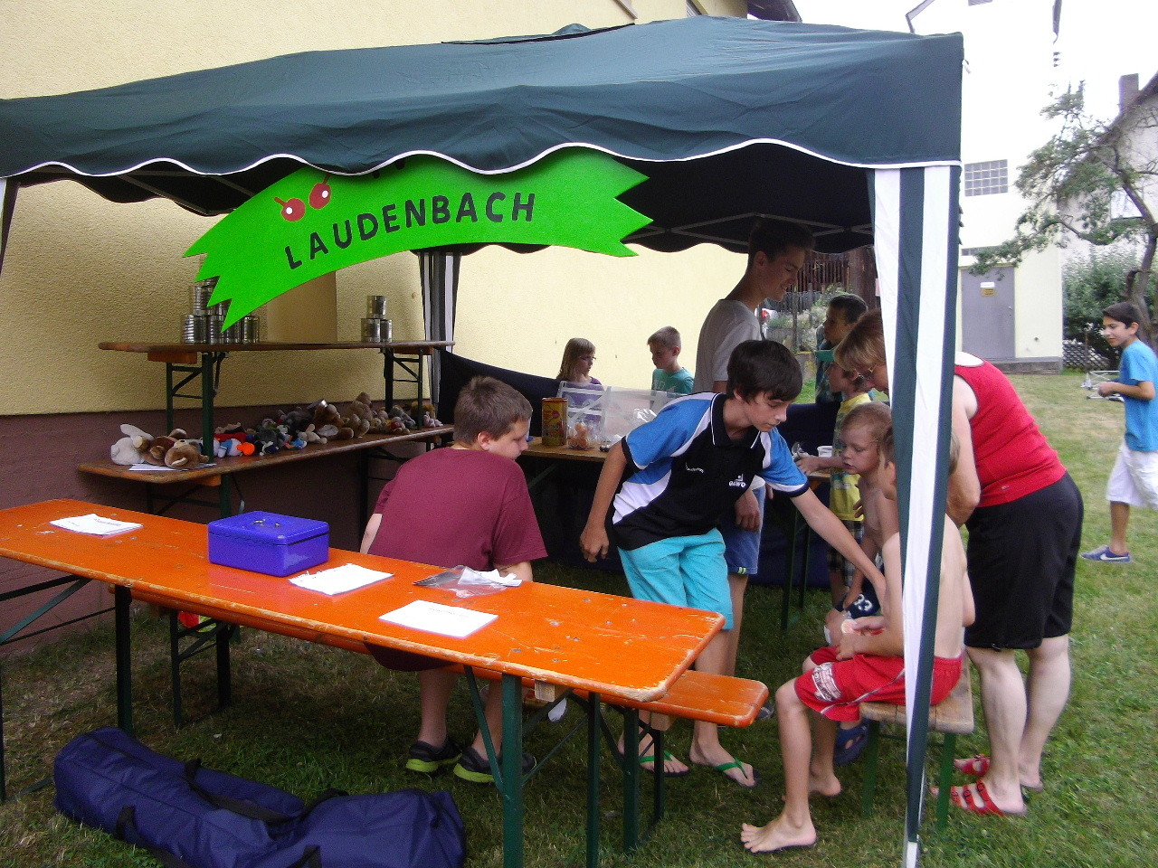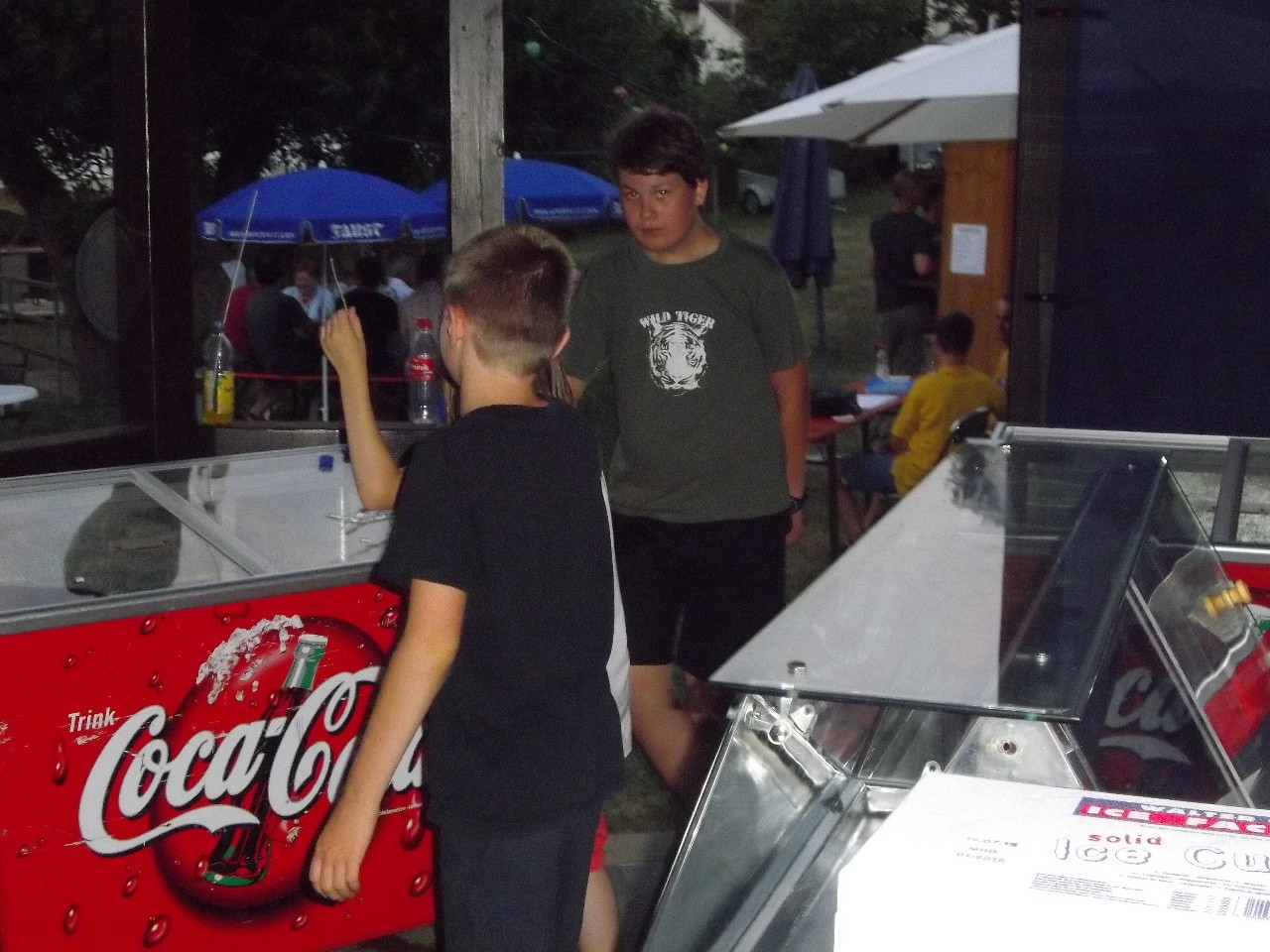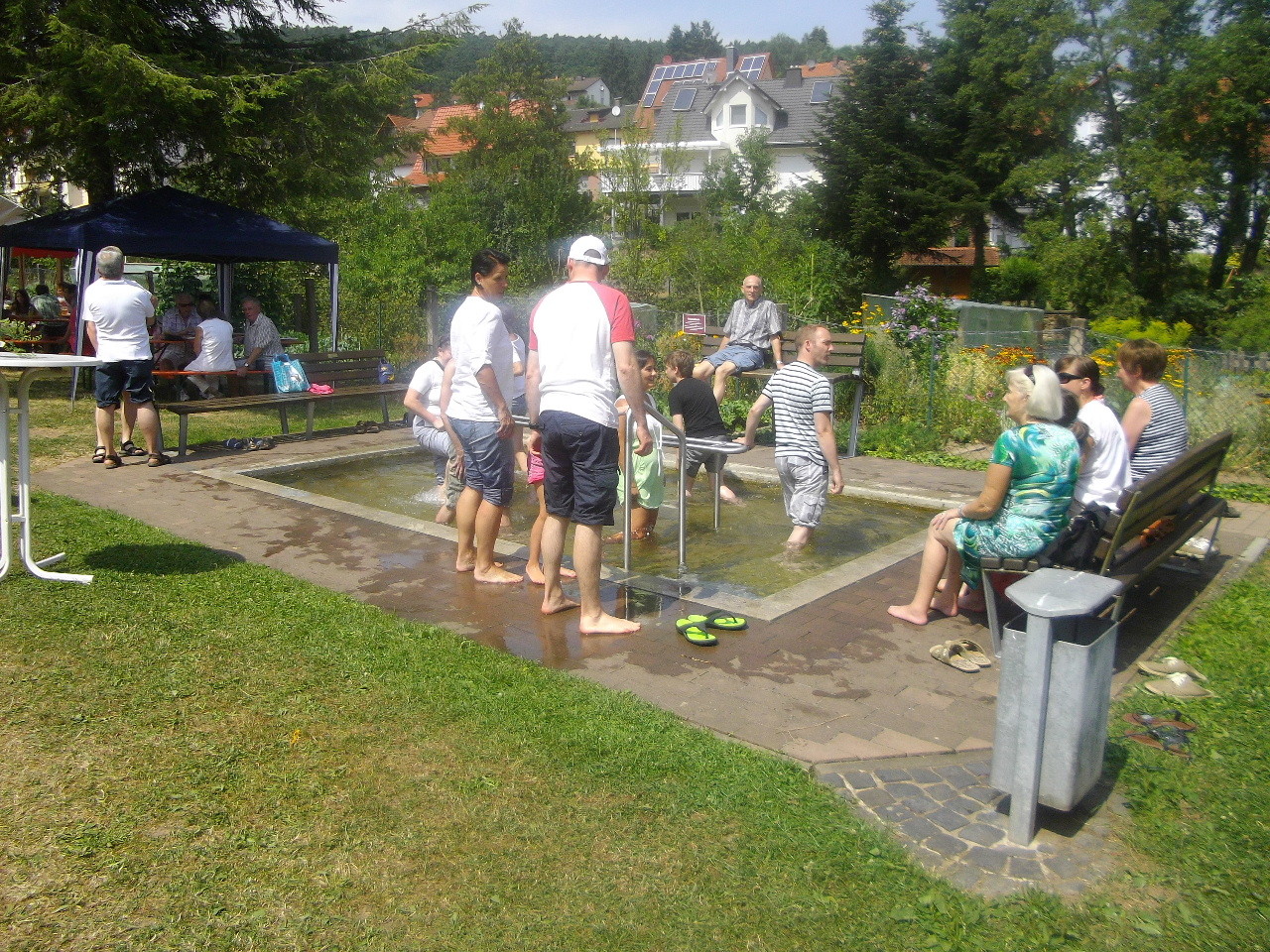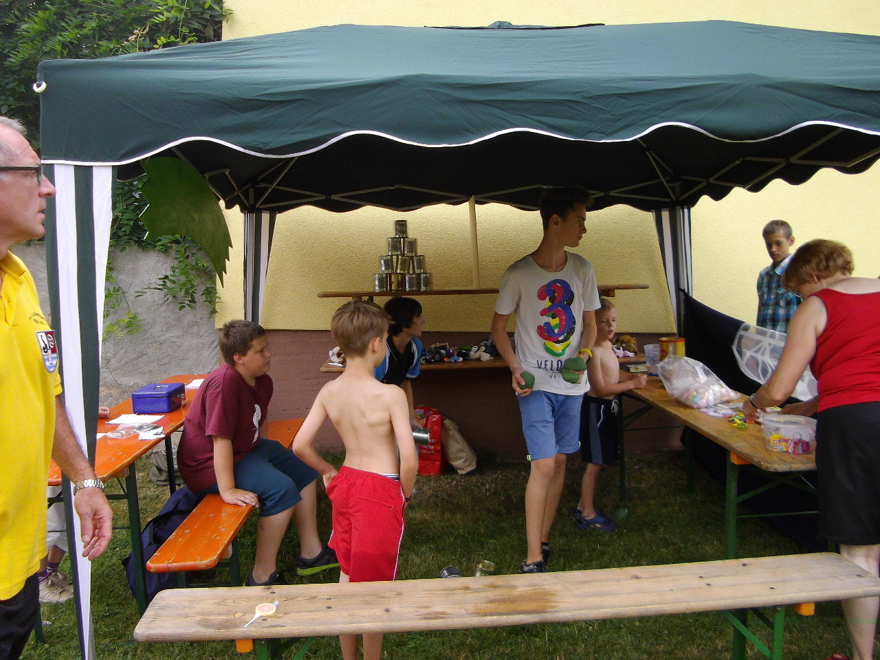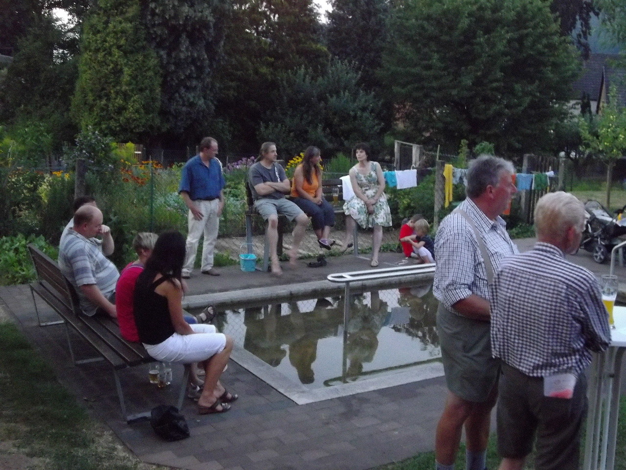 Das Tretbecken war ein magischer Anziehungspunkt. Darin tummelten sich am Wochenende Groß und Klein, um bei der Hitze wenigstens etwas Abkühlung zu bekommen. Am Samstag erschienen Punkt 18 Uhr die ersten Festbesucher und innerhalb kurzer Zeit waren die Plätze rund um das Tretbecken gut besetzt. Die Helfer hatten alle Hände voll zu tun, die Besucher mit Essen und Trinken zu versorgen. Im Angebot für die Erwachsenen gab es dieses Jahr auch Bacardi, Wodka und Bowle, was aber nicht ganz so gut angenommen wurde. Bis tief in die Nacht saßen die letzten Besucher im Zelt.
