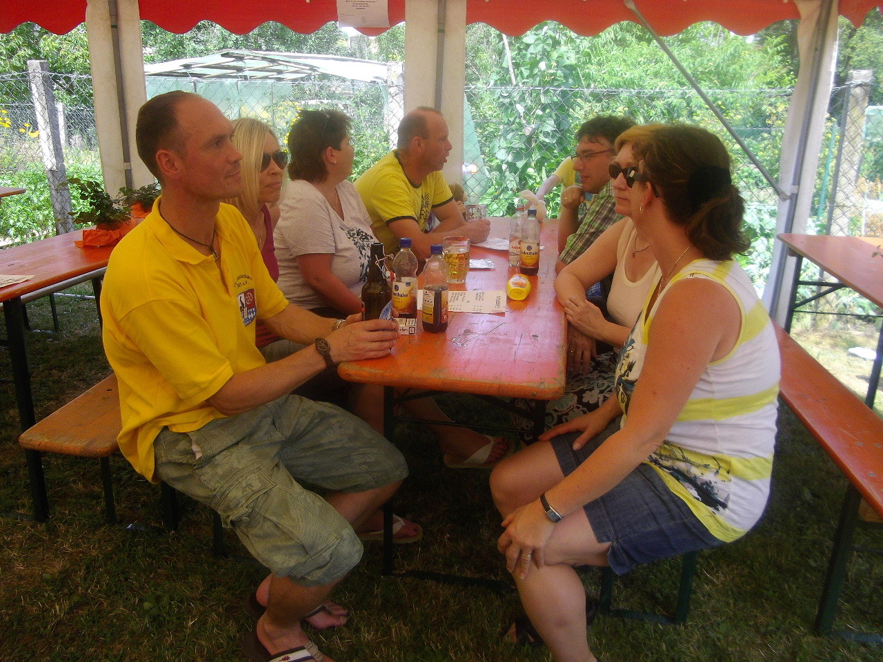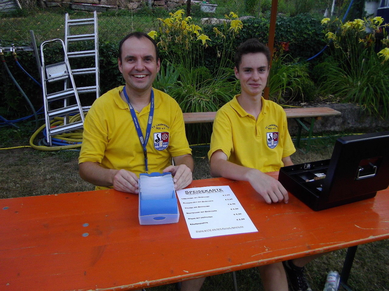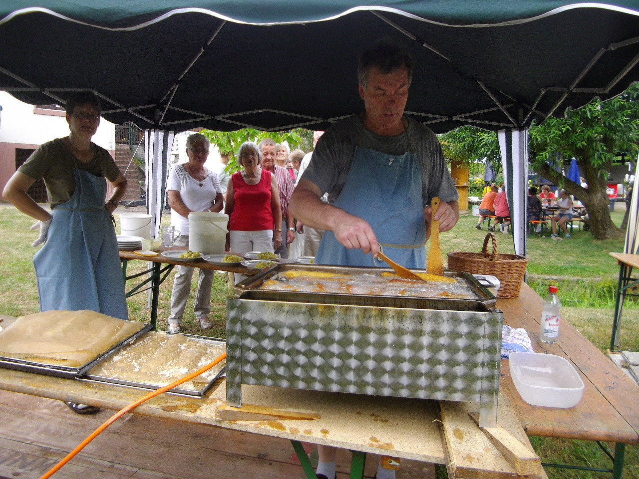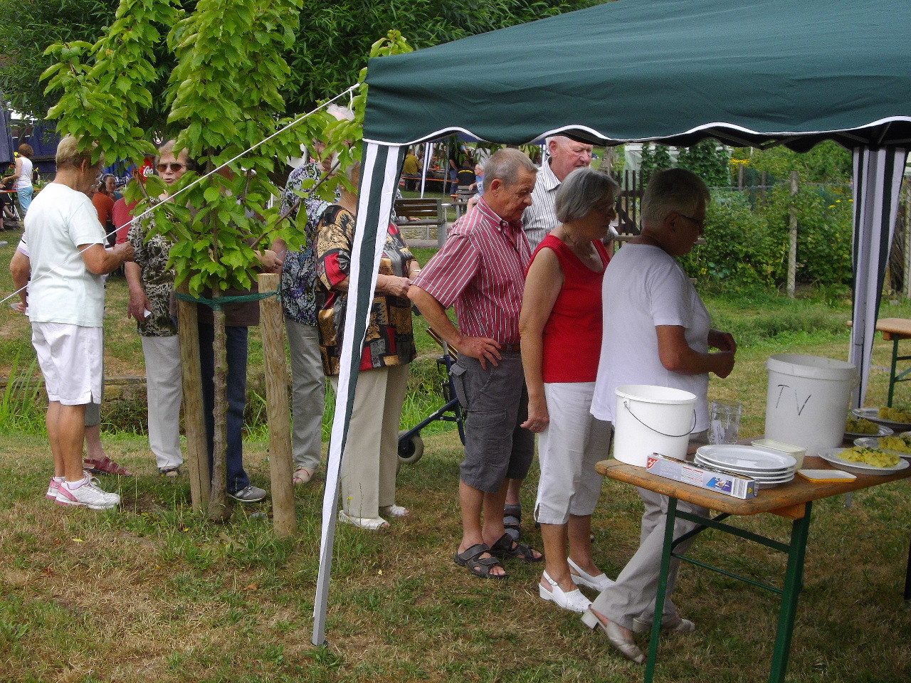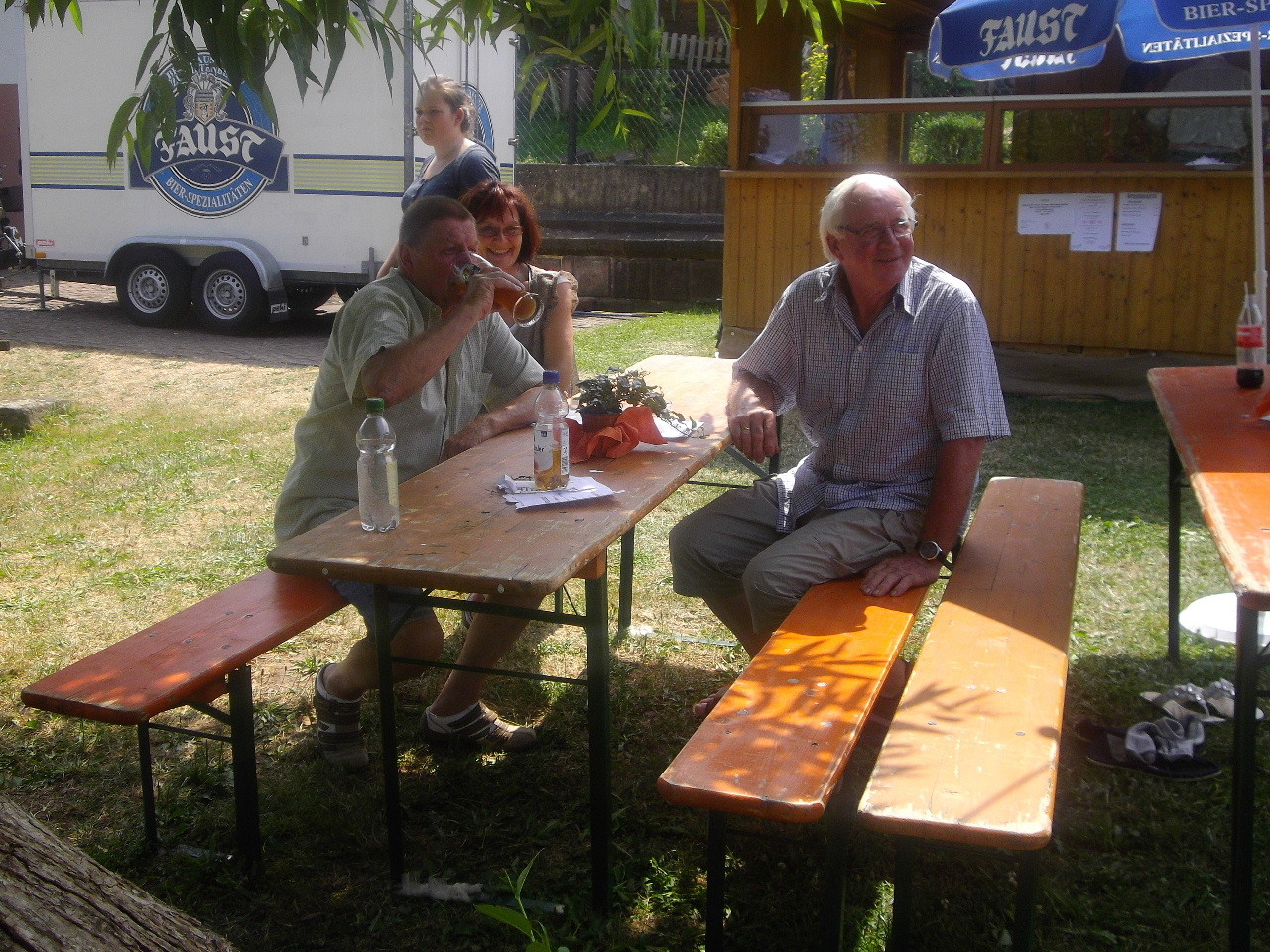Das Tretbecken war ein magischer Anziehungspunkt. Darin tummelten sich am Wochenende Groß und Klein, um bei der Hitze wenigstens etwas Abkühlung zu bekommen. Am Samstag erschienen Punkt 18 Uhr die ersten Festbesucher und innerhalb kurzer Zeit waren die Plätze rund um das Tretbecken gut besetzt. Die Helfer hatten alle Hände voll zu tun, die Besucher mit Essen und Trinken zu versorgen. Im Angebot für die Erwachsenen gab es dieses Jahr auch Bacardi, Wodka und Bowle, was aber nicht ganz so gut angenommen wurde. Bis tief in die Nacht saßen die letzten Besucher im Zelt.