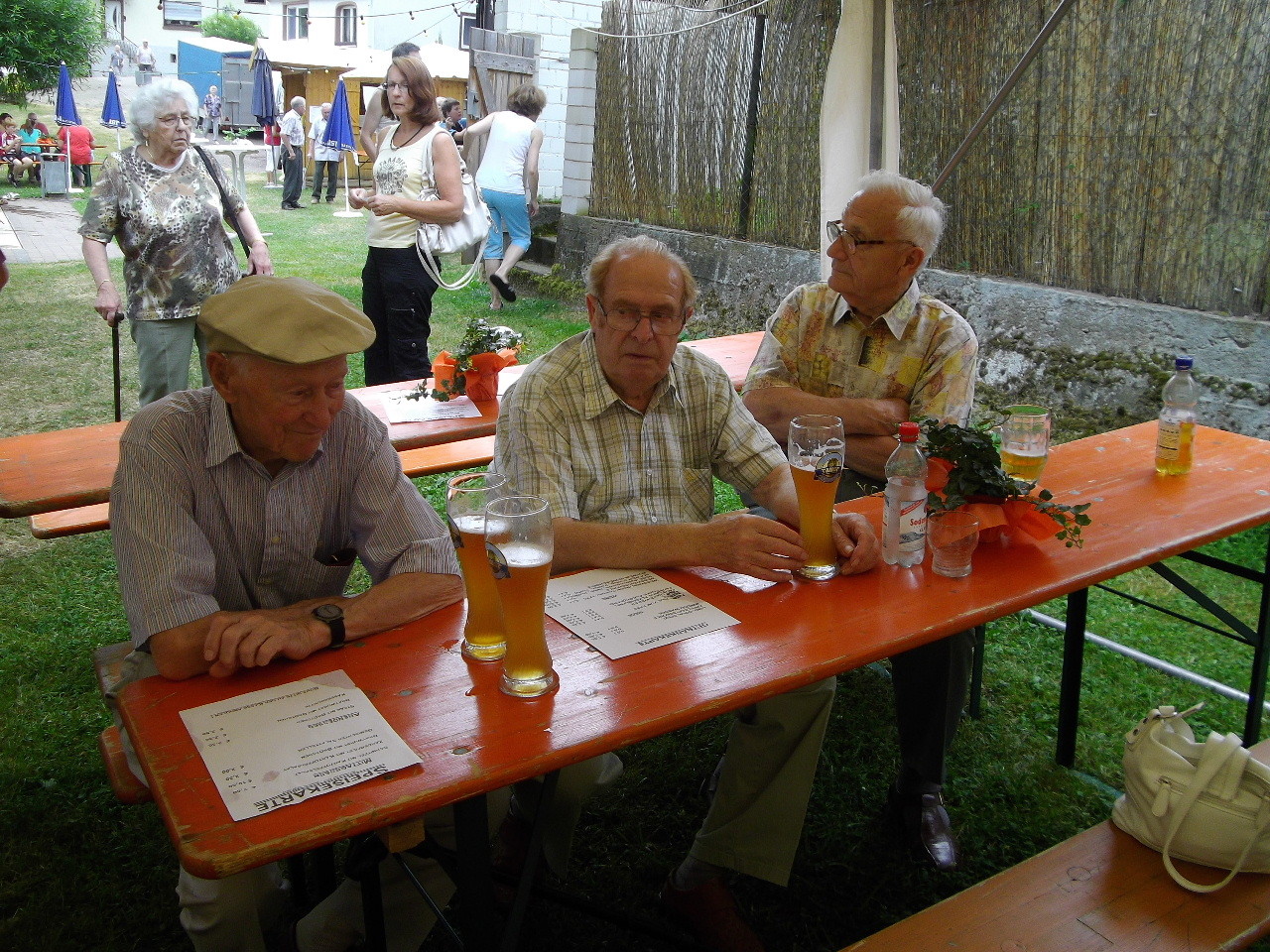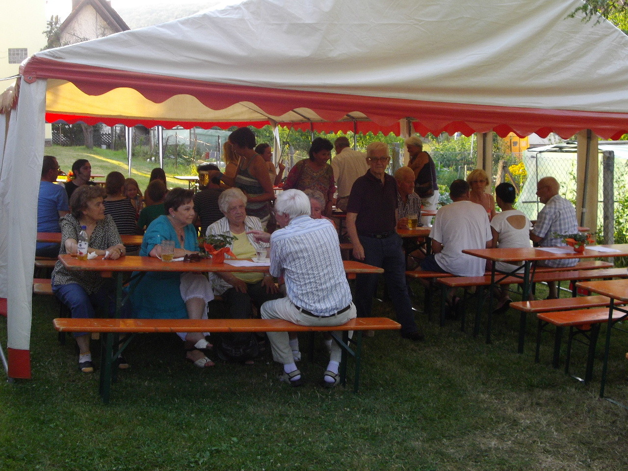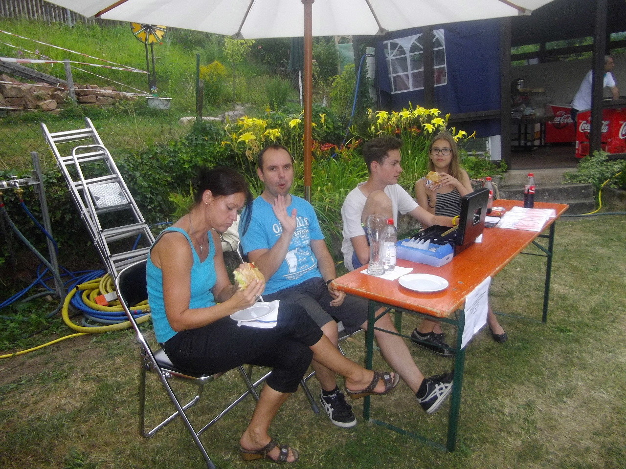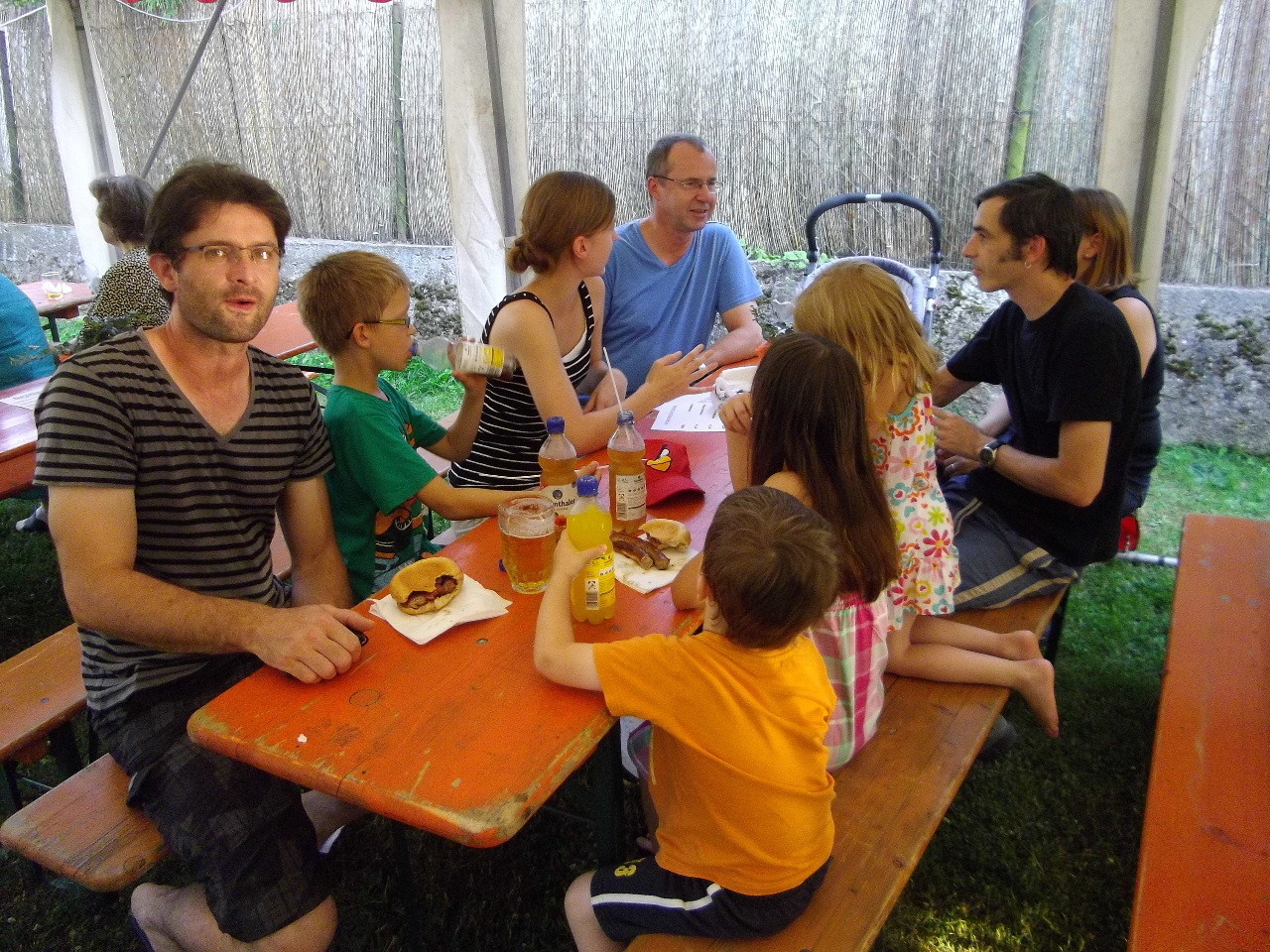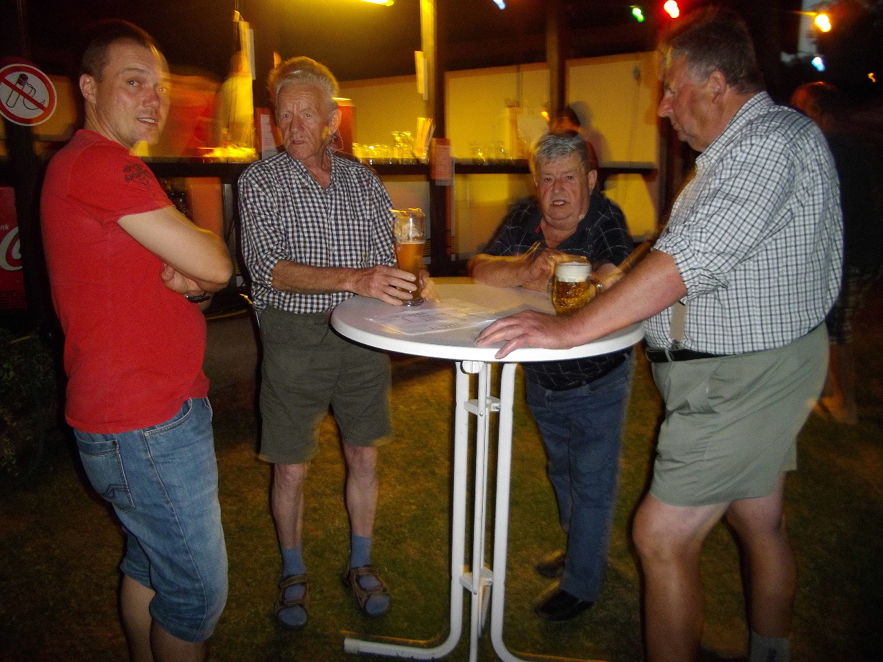 Das Tretbecken war ein magischer Anziehungspunkt. Darin tummelten sich am Wochenende Groß und Klein, um bei der Hitze wenigstens etwas Abkühlung zu bekommen. Am Samstag erschienen Punkt 18 Uhr die ersten Festbesucher und innerhalb kurzer Zeit waren die Plätze rund um das Tretbecken gut besetzt. Die Helfer hatten alle Hände voll zu tun, die Besucher mit Essen und Trinken zu versorgen. Im Angebot für die Erwachsenen gab es dieses Jahr auch Bacardi, Wodka und Bowle, was aber nicht ganz so gut angenommen wurde. Bis tief in die Nacht saßen die letzten Besucher im Zelt.