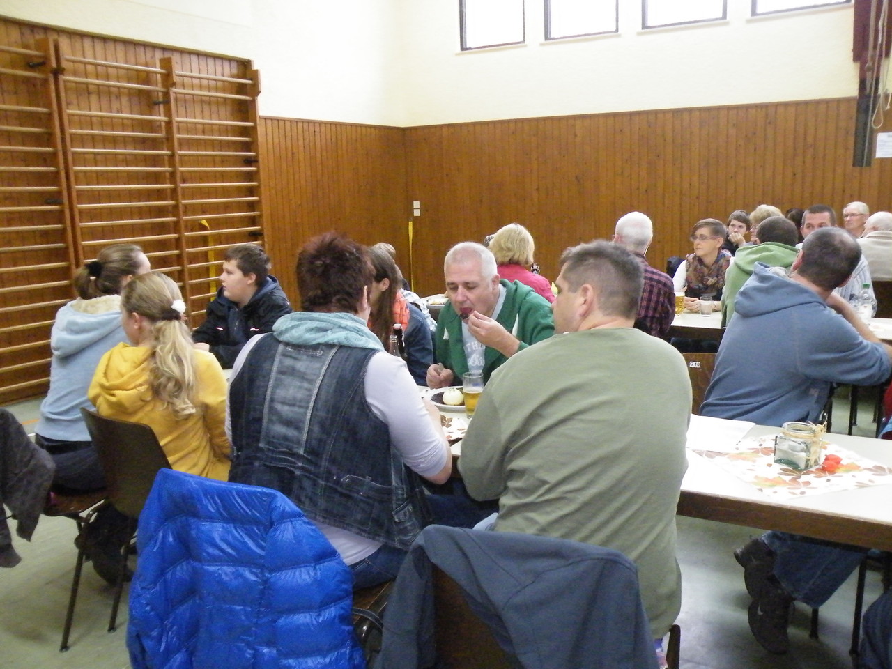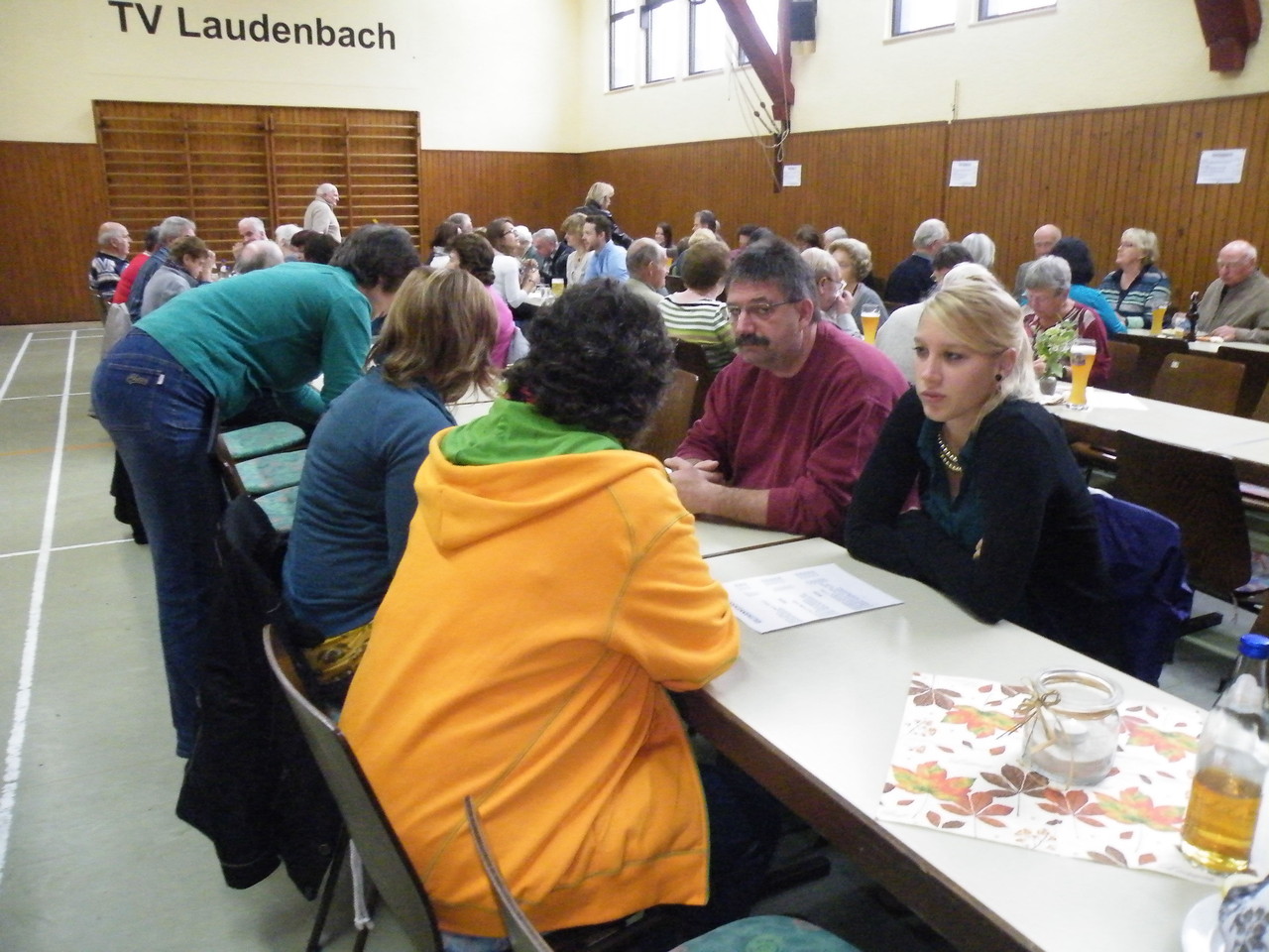 Hacksteaks und Zander lockten am 20.10.2013 viele Laudenbacher in die Turnhalle des TV zum traditionellen Kerbessen und zur Mittagszeit war die Halle gut besucht. So manch einer, der etwas später eintraf, hatte bei den Hacksteaks das Nachsehen. Nach dem Mittagessen kauften viele Besucher am reichhaltigen Kuchenbuffet etwas für die Kaffeezeit zuhause, aber es blieben auch einige in der herbstlich geschmückten Halle sitzen.