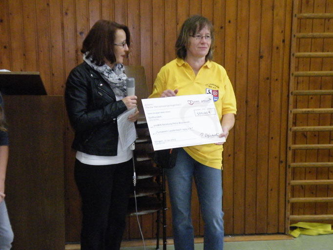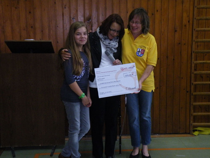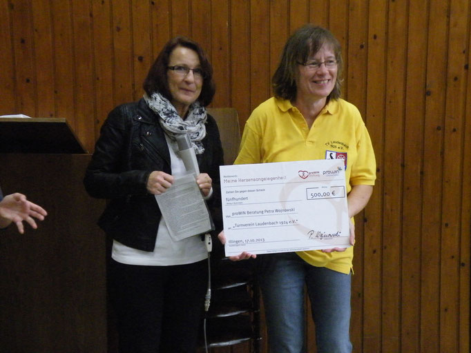 Den Erfolg ihrer Bemühungen konnte nun am 20.10.13 die 1. Vorsitzende des TV Laudenbach in Empfang nehmen. Der Verein bedankt sich herzlich bei Frau Wojnowski für die Unterstützung, bei der Firma proWIN für die Aktion und bei Karoline und Priska für ihren unermüdlichen Einsatz am Brunnenfest.