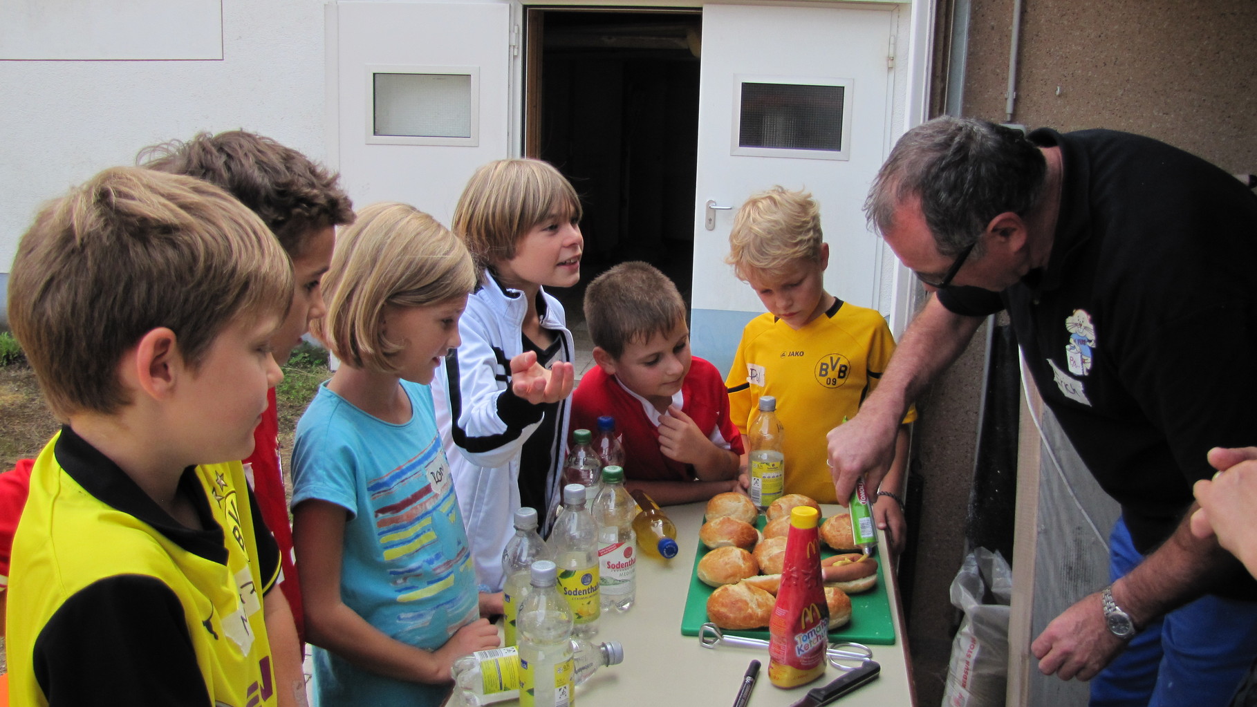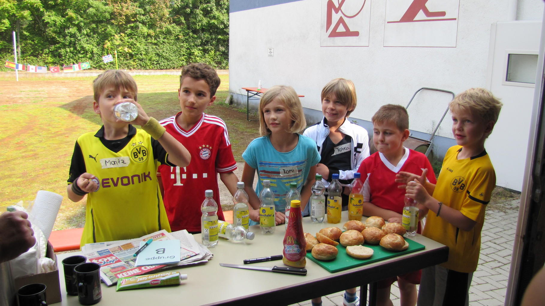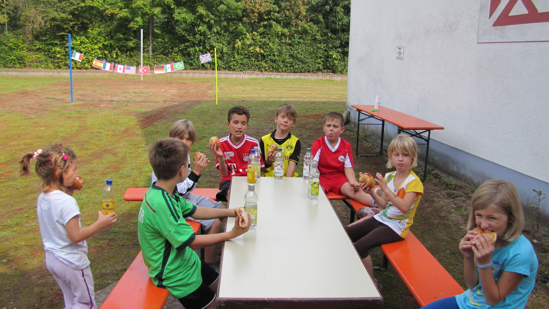 Nach einer kleinen Stärkung mit Wienerle im Brötchen wurden die Spiele bei wunderbarem Sonnenschein im Freien weitergeführt. Becherabschießen mit Wasserspritzpistolen, „Speerwerfen“, ein Länderspiel und Gesellschafts-Ballspiele standen auf dem Programm.