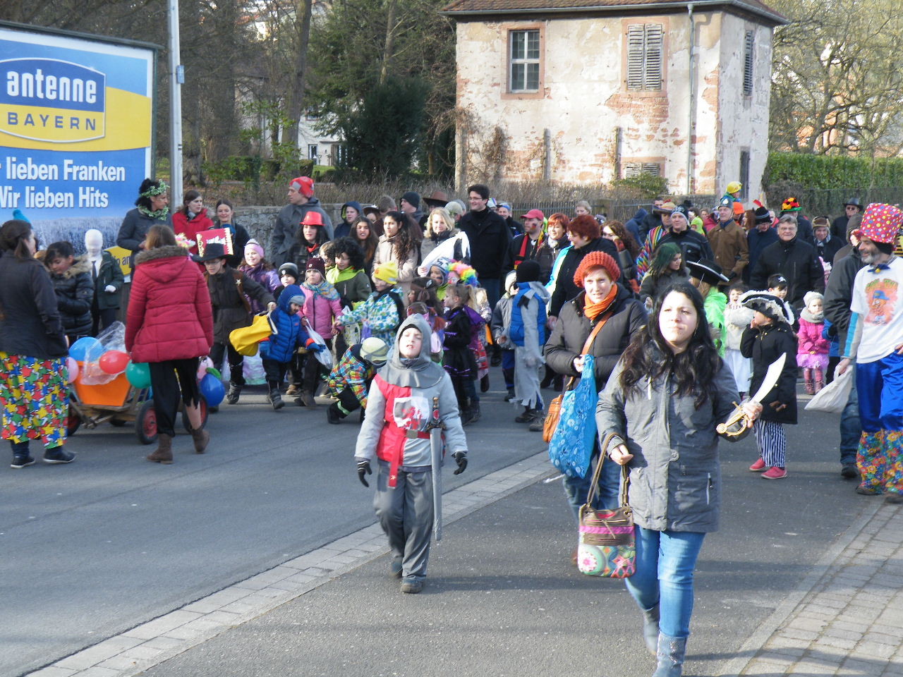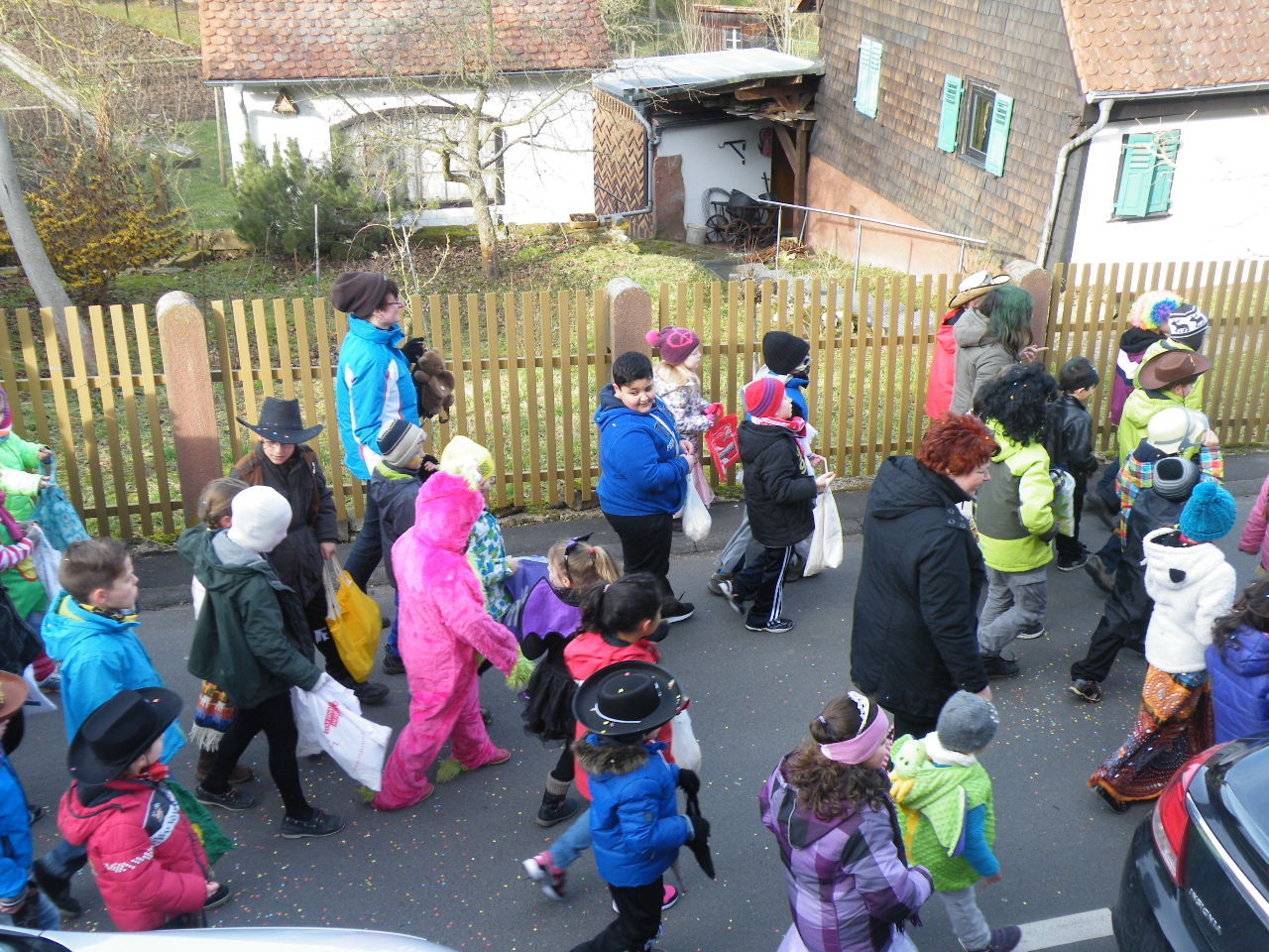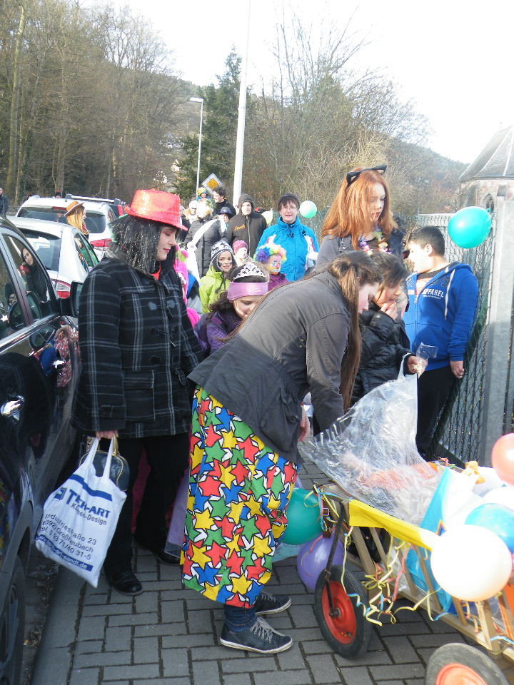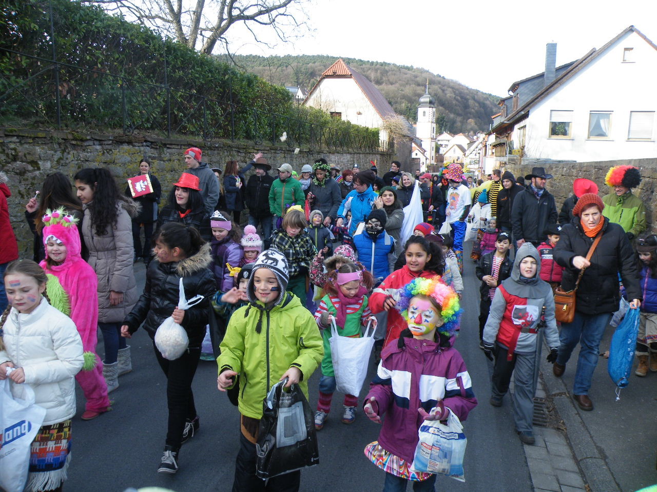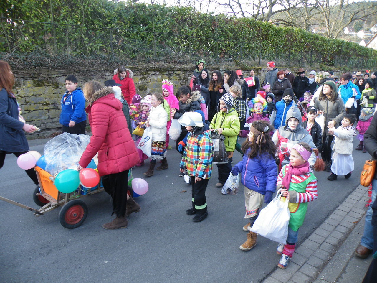 Trübe sah es aus am Morgen des 08.02.2015. Wolken, Wind und vereinzelte Schneeflocken ließen keine rechte Freude auf den Gaudiwurm aufkommen. Doch der Wettergott meinte es gut und bei Sonnenschein, blauem Himmel und angenehmer Temperatur startete der Gaudiwurm. Viele große und kleine Narren waren unterwegs von der Pötzl-Mühle zur Turnhalle. Auf dem Weg dorthin ging es nicht ganz so laut zu wie in den letzten Jahren, da leider die Technik streikte und auch Helau-Rufe nur vereinzelt zu hören waren. Aber Hauptsache, die Kinder hatten ihren Spaß beim Einsammeln der ausgeworfenen Süßigkeiten - auch von Zuschauern am Straßenrand.
