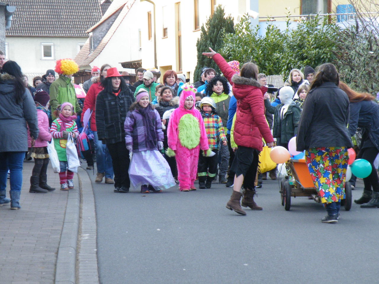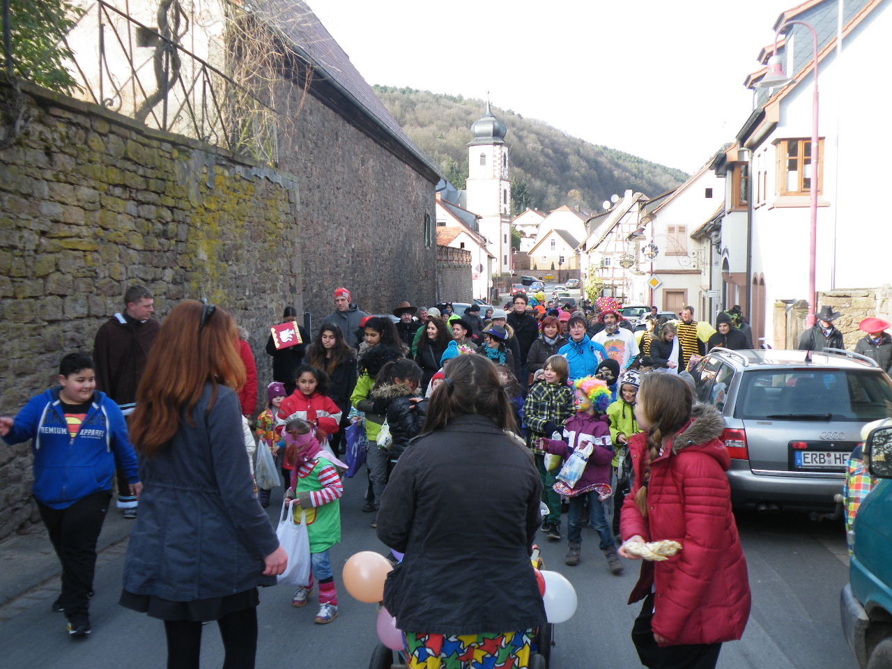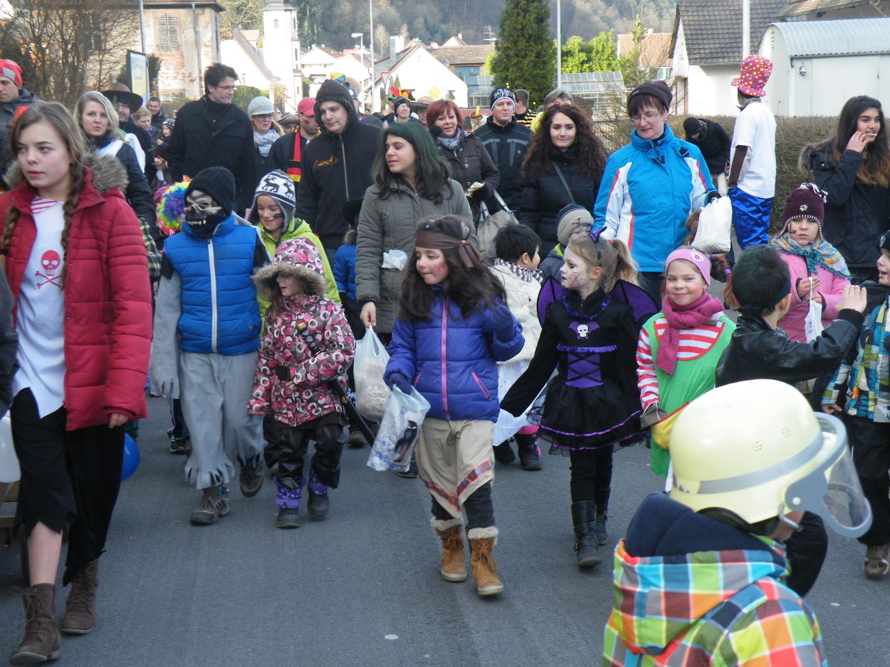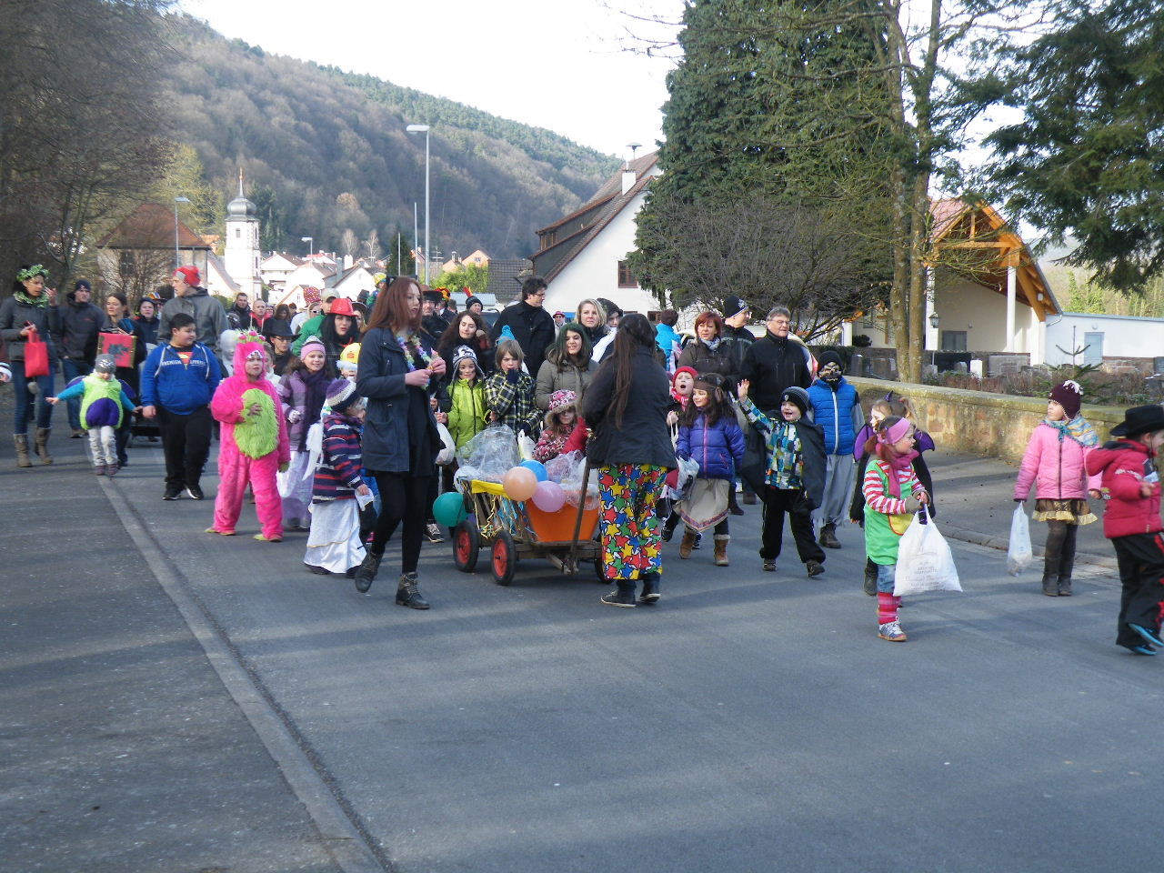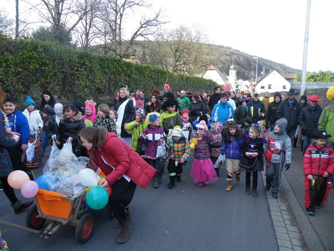 Trübe sah es aus am Morgen des 08.02.2015. Wolken, Wind und vereinzelte Schneeflocken ließen keine rechte Freude auf den Gaudiwurm aufkommen. Doch der Wettergott meinte es gut und bei Sonnenschein, blauem Himmel und angenehmer Temperatur startete der Gaudiwurm. Viele große und kleine Narren waren unterwegs von der Pötzl-Mühle zur Turnhalle. Auf dem Weg dorthin ging es nicht ganz so laut zu wie in den letzten Jahren, da leider die Technik streikte und auch Helau-Rufe nur vereinzelt zu hören waren. Aber Hauptsache, die Kinder hatten ihren Spaß beim Einsammeln der ausgeworfenen Süßigkeiten - auch von Zuschauern am Straßenrand.