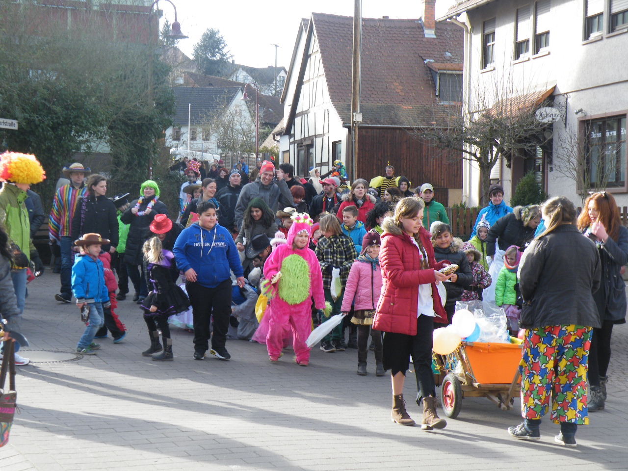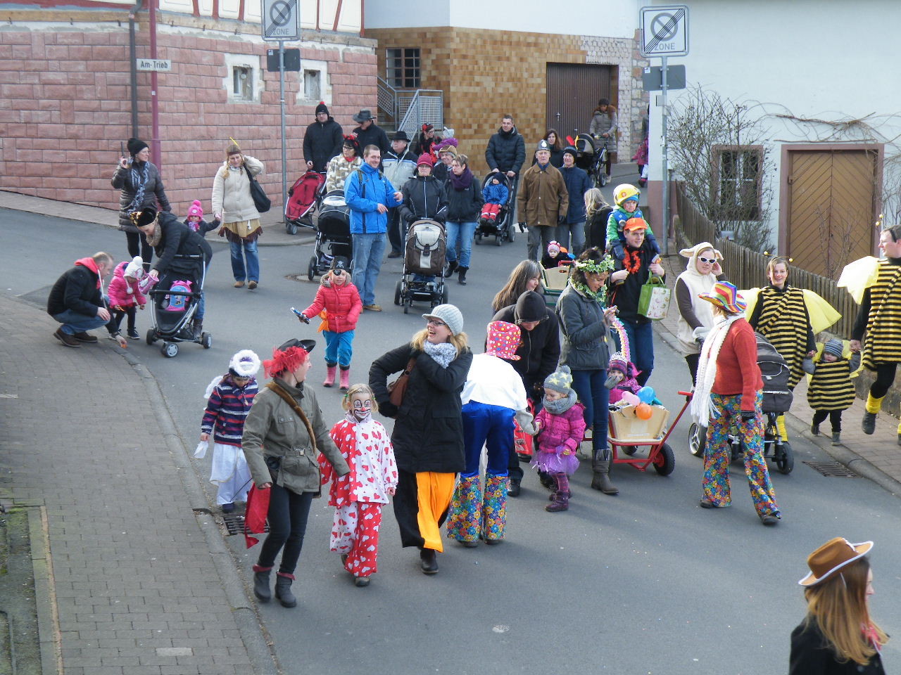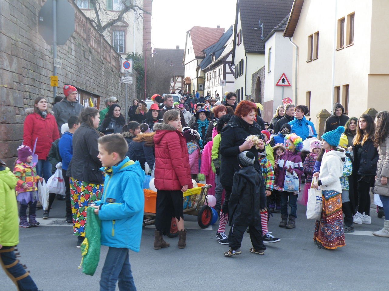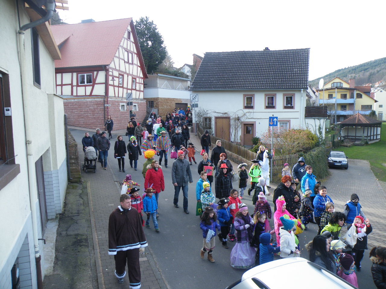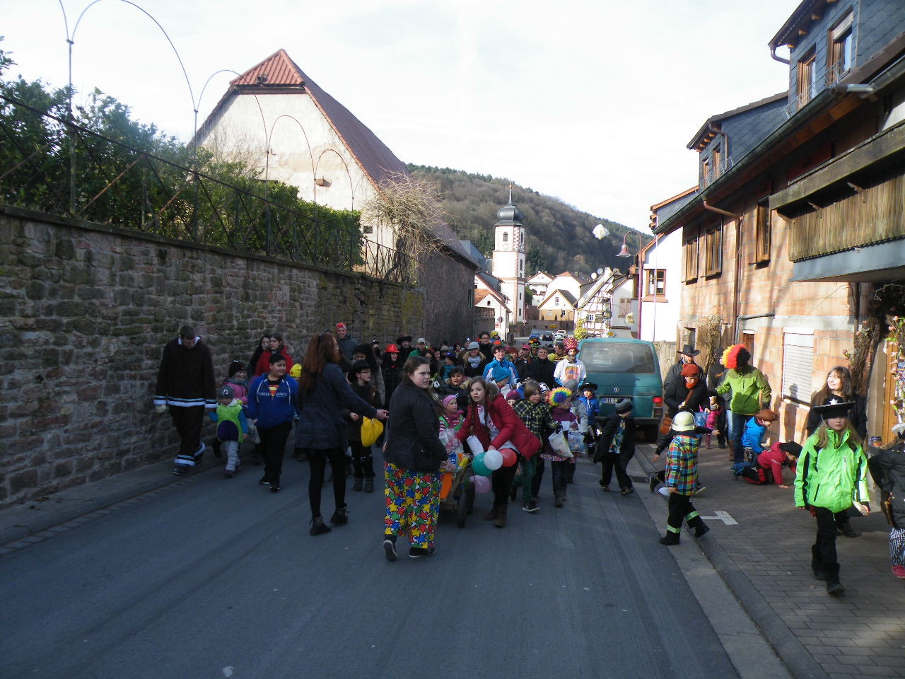 Trübe sah es aus am Morgen des 08.02.2015. Wolken, Wind und vereinzelte Schneeflocken ließen keine rechte Freude auf den Gaudiwurm aufkommen. Doch der Wettergott meinte es gut und bei Sonnenschein, blauem Himmel und angenehmer Temperatur startete der Gaudiwurm. Viele große und kleine Narren waren unterwegs von der Pötzl-Mühle zur Turnhalle. Auf dem Weg dorthin ging es nicht ganz so laut zu wie in den letzten Jahren, da leider die Technik streikte und auch Helau-Rufe nur vereinzelt zu hören waren. Aber Hauptsache, die Kinder hatten ihren Spaß beim Einsammeln der ausgeworfenen Süßigkeiten - auch von Zuschauern am Straßenrand.