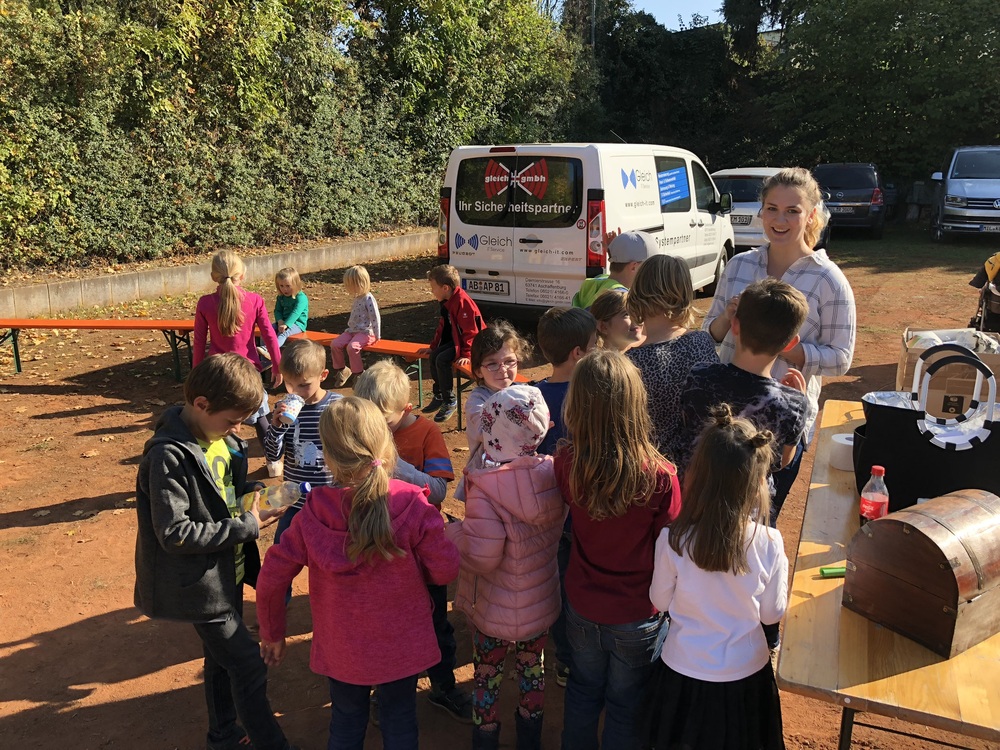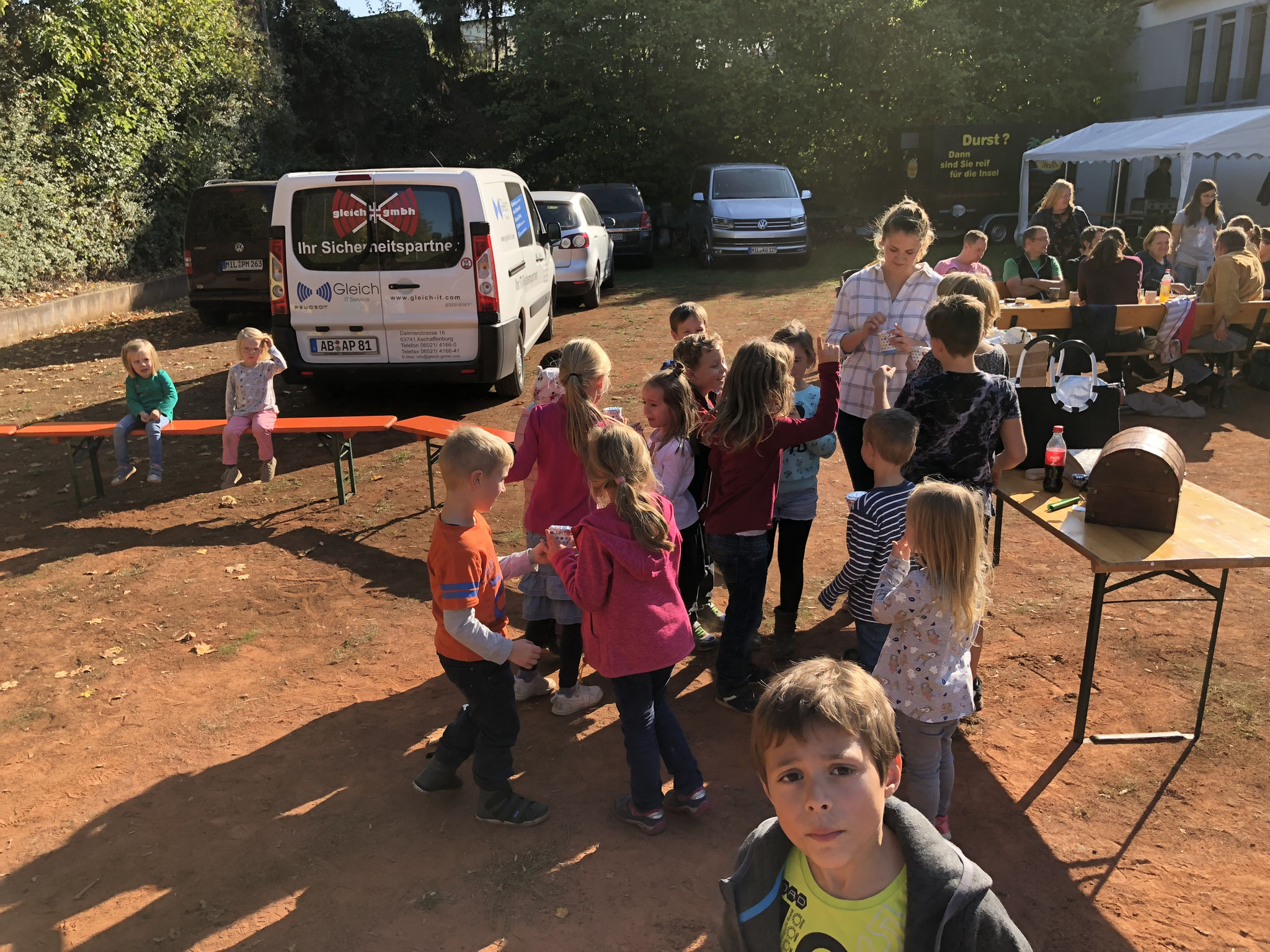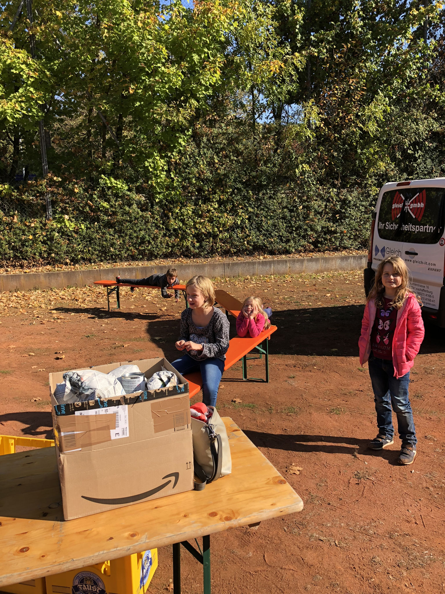 Wie schon im letzten Jahr gab es auch in diesem Jahr am Sonntag eine Schatzsuche, die viele Kinder anlockte. Einige Kinder waren schon so gespannt, dass sie schon vor Beginn der eigentlichen Schatzsuche jede Ecke der Turnhalle unter die Lupe nahmen, um nach versteckten Hinweisen zu suchen. Zuerst mussten die Kinder zwischen 4 und 11 Jahren einige Aufgaben lösen, die nur in Teamarbeit durchgeführt werden konnten. Eine davon war, sich gemeinsam so zu helfen und zu stützen, dass es alle 18 Kinder schaffen gleichzeitig auf nur 6 Getränkekisten zu stehen. Nachdem diese und weitere „Piratenproben“ geschafft waren ging es ans Hinweise suchen und Rätsel lösen, um alle Zahlen herauszufinden, um damit die Zahlenschlösser an der Schatzkiste zu knacken. Auch hier mussten die großen und kleinen Kinder zusammenhelfen, um an den Inhalt der Schatztruhe zu gelangen.