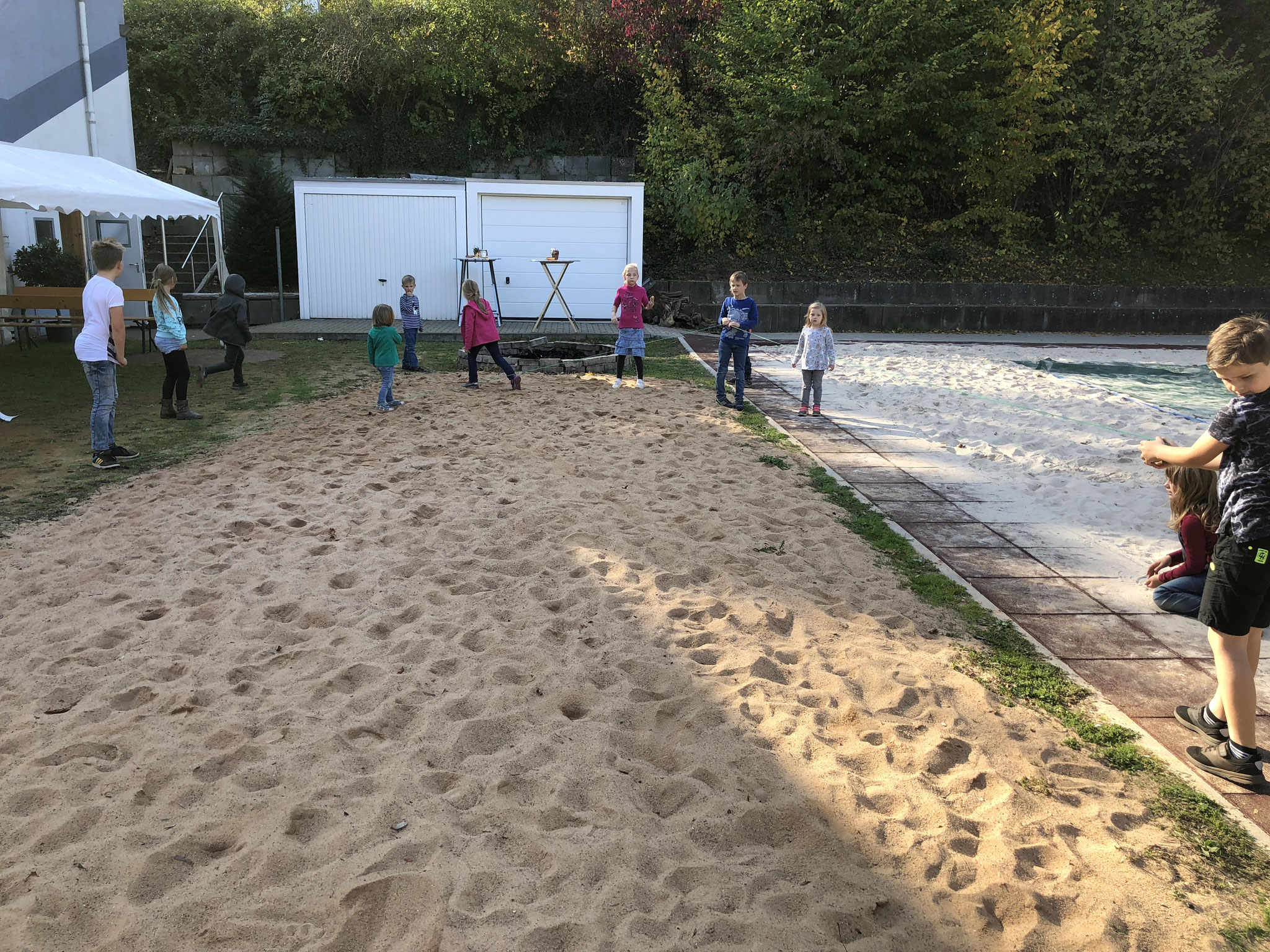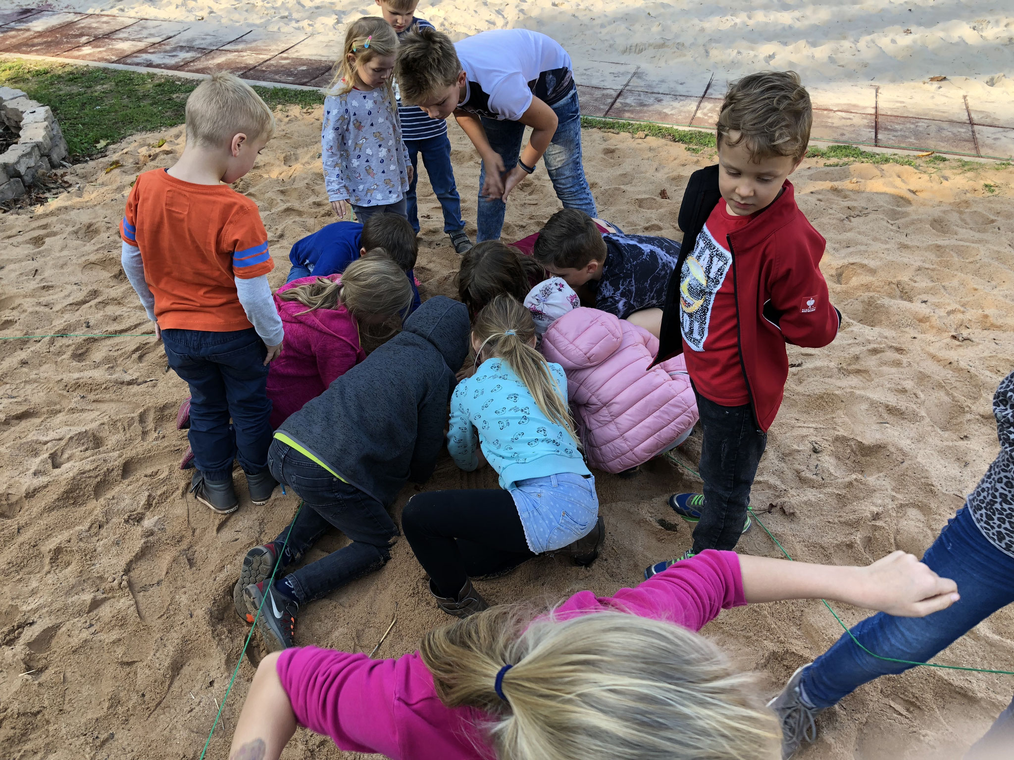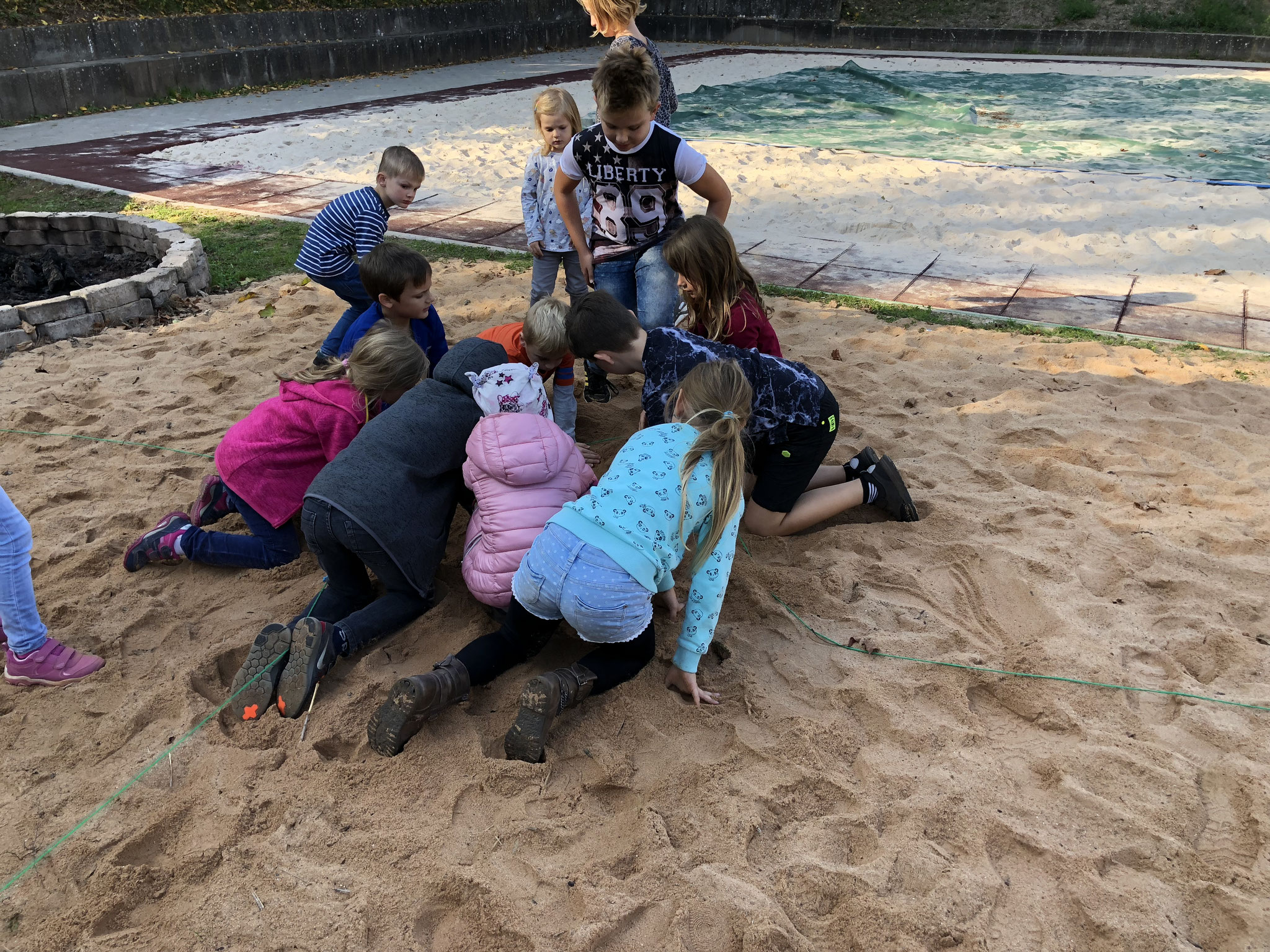 Wie schon im letzten Jahr gab es auch in diesem Jahr am Sonntag eine Schatzsuche, die viele Kinder anlockte. Einige Kinder waren schon so gespannt, dass sie schon vor Beginn der eigentlichen Schatzsuche jede Ecke der Turnhalle unter die Lupe nahmen, um nach versteckten Hinweisen zu suchen. Zuerst mussten die Kinder zwischen 4 und 11 Jahren einige Aufgaben lösen, die nur in Teamarbeit durchgeführt werden konnten. Eine davon war, sich gemeinsam so zu helfen und zu stützen, dass es alle 18 Kinder schaffen gleichzeitig auf nur 6 Getränkekisten zu stehen. Nachdem diese und weitere „Piratenproben“ geschafft waren ging es ans Hinweise suchen und Rätsel lösen, um alle Zahlen herauszufinden, um damit die Zahlenschlösser an der Schatzkiste zu knacken. Auch hier mussten die großen und kleinen Kinder zusammenhelfen, um an den Inhalt der Schatztruhe zu gelangen.